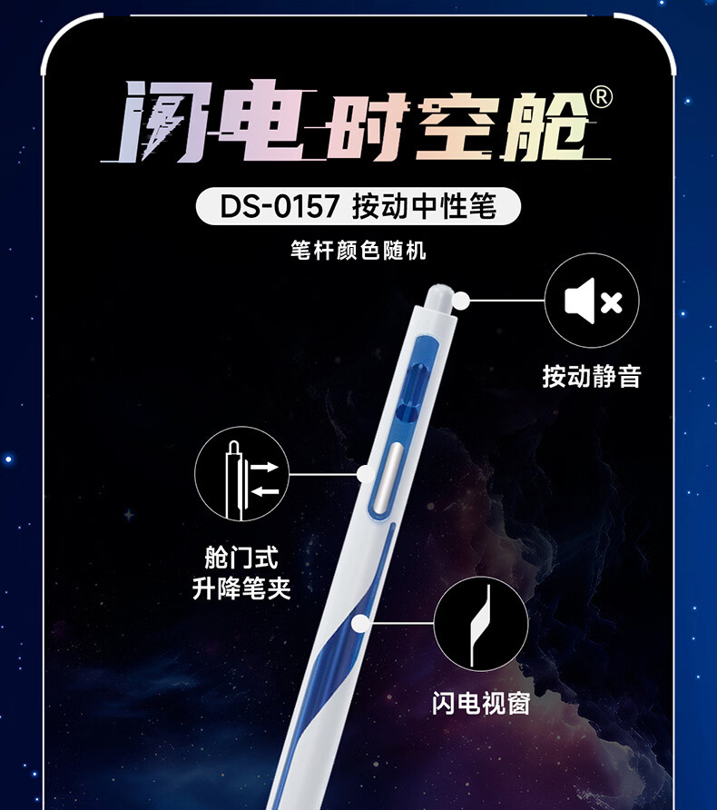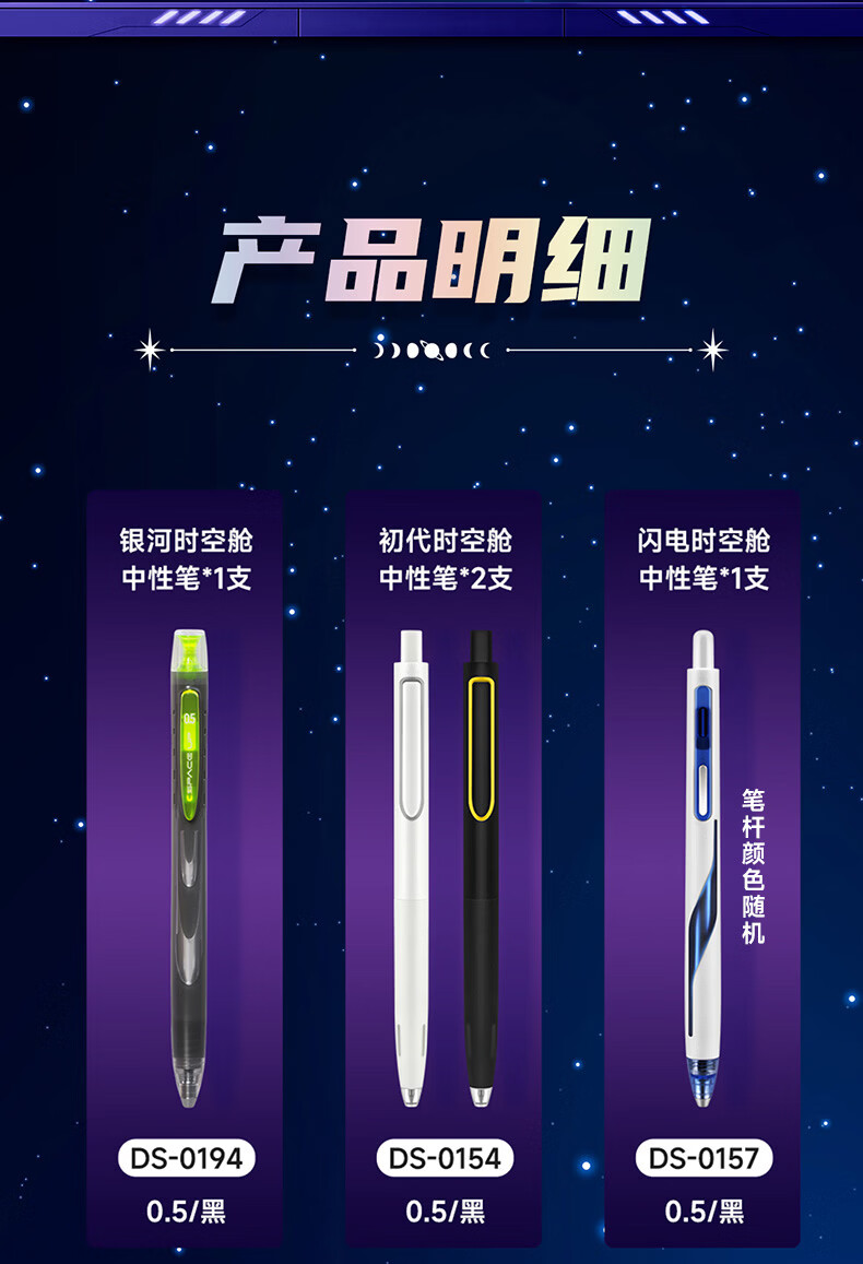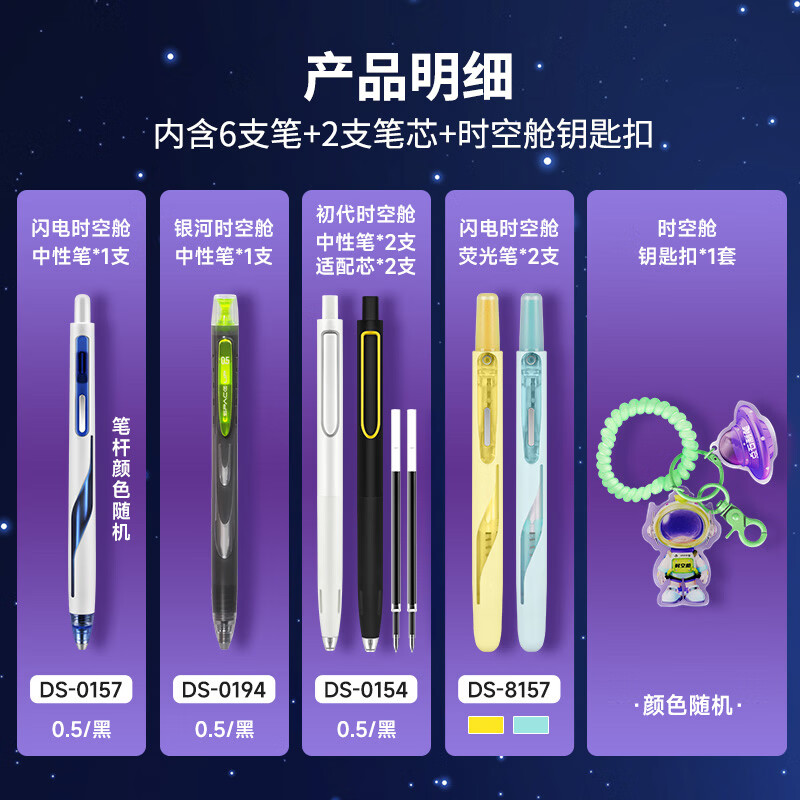 配置:闪电时空舱中性笔*1支 银河时空舱中性笔*1支 初代时空舱中性笔*2支适配芯*2支 闪电时空舱荧光笔*2支 时空舱钥匙扣*1套