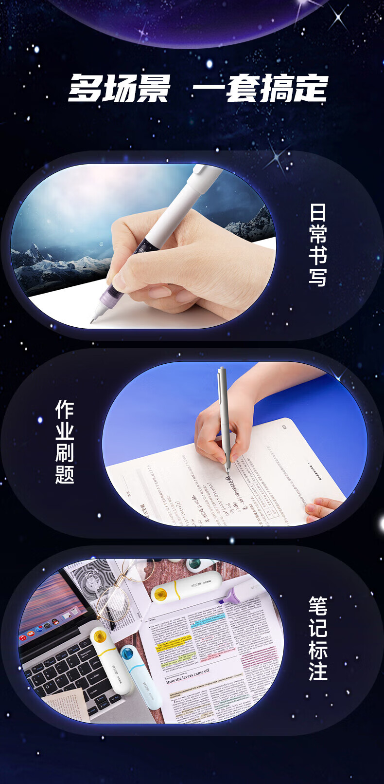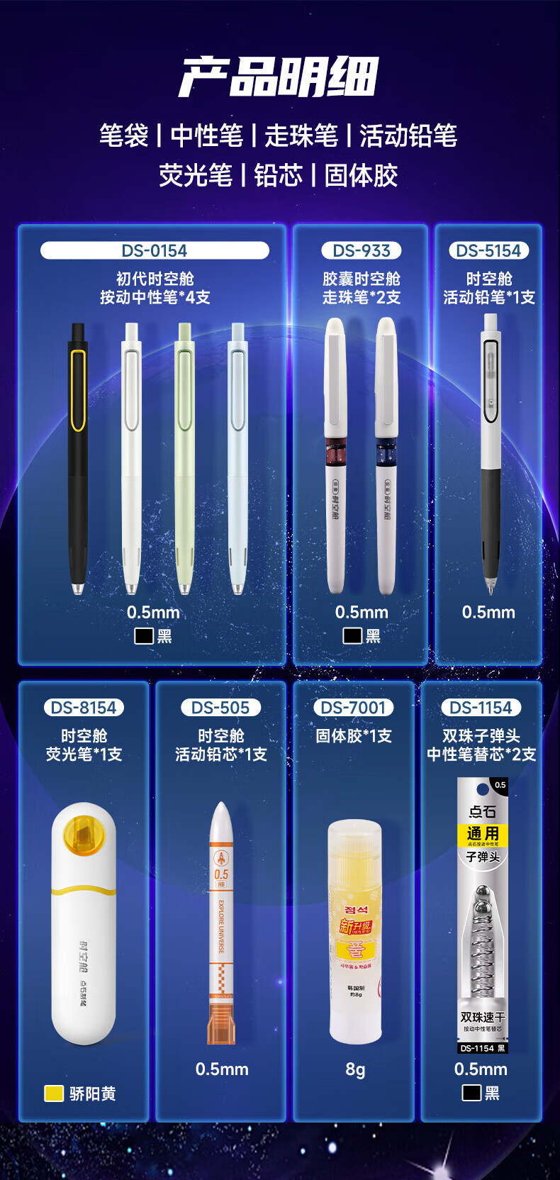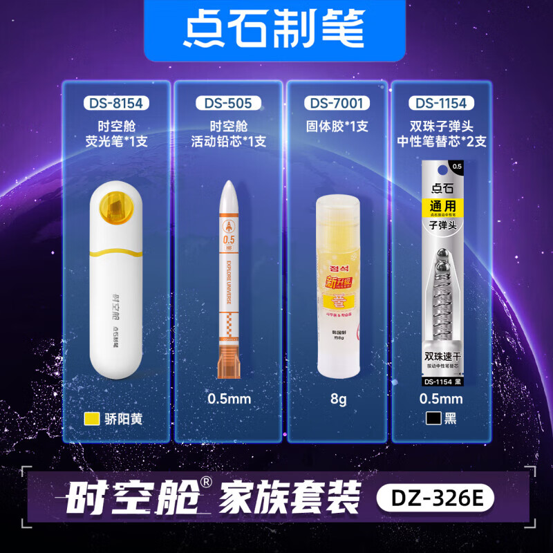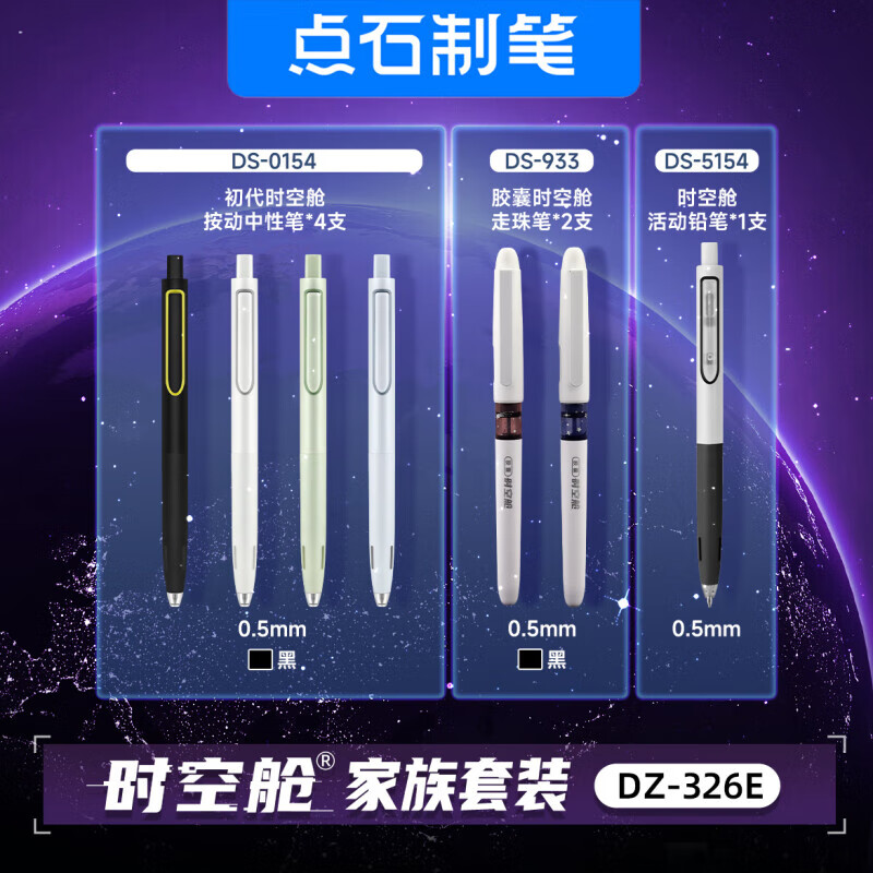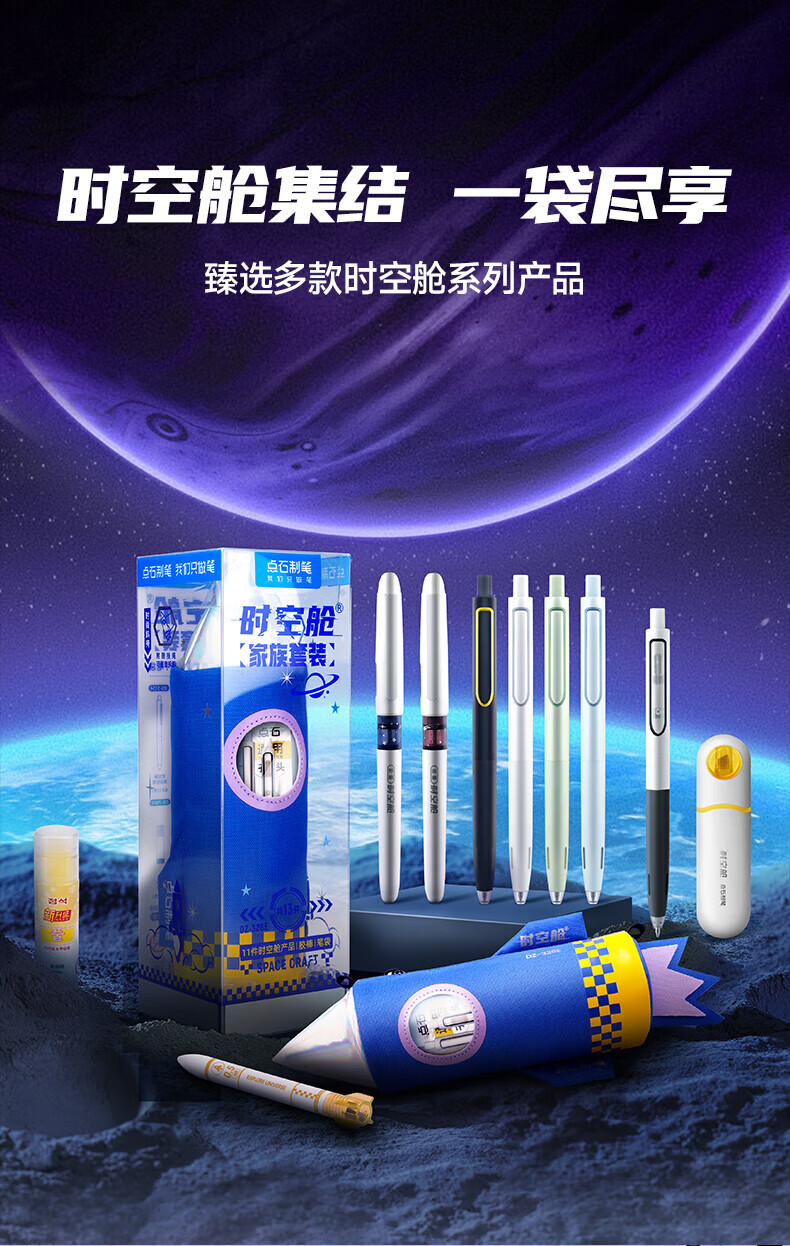 配置:初代时空舱按动中性笔*4支 胶囊时空舱走珠笔*2支 时空舱活动铅笔*1支 时空舱荧光笔*1支 时空舱活动铅芯1支 固体胶1支 双珠子弹头中性笔替芯*2支