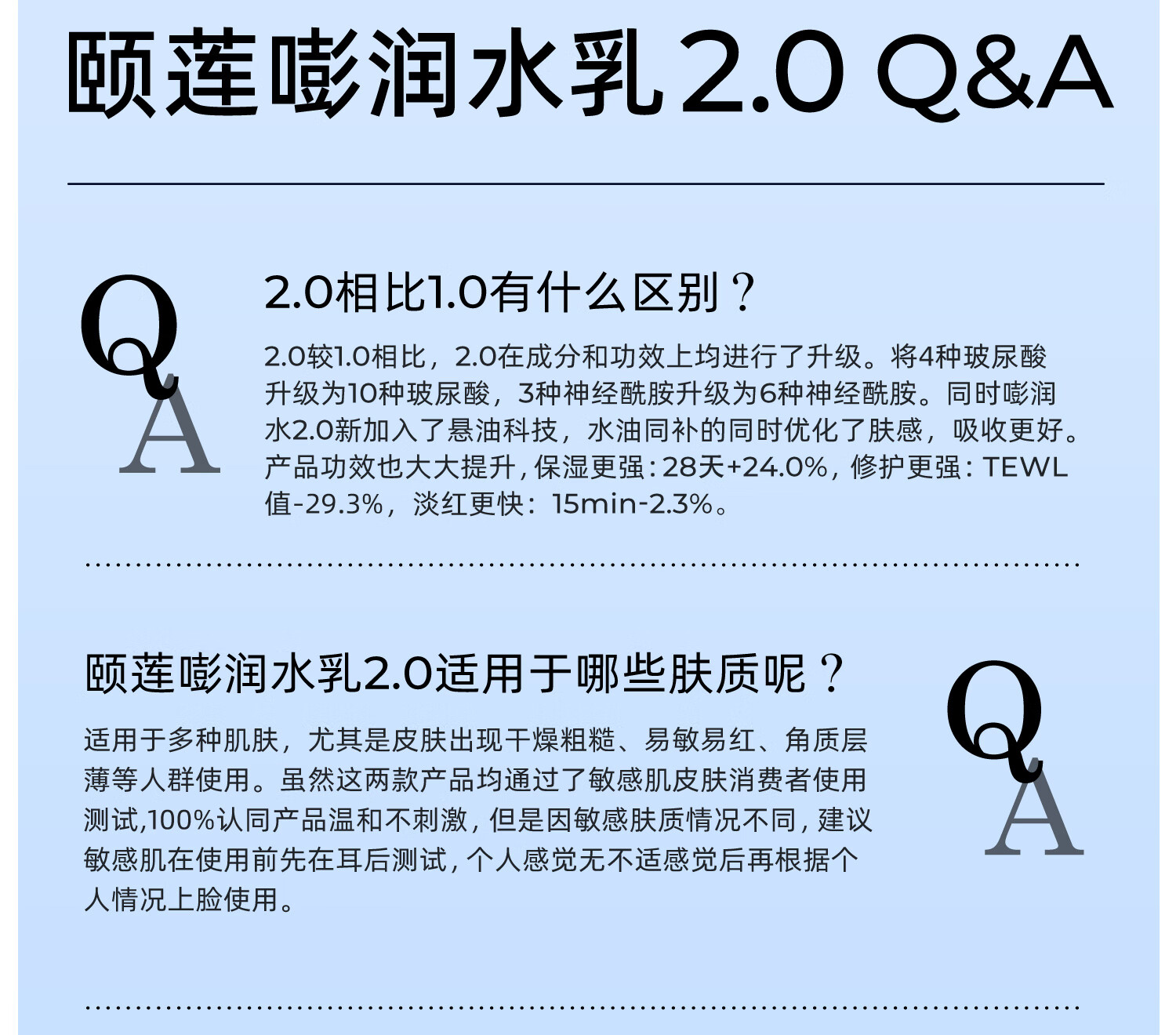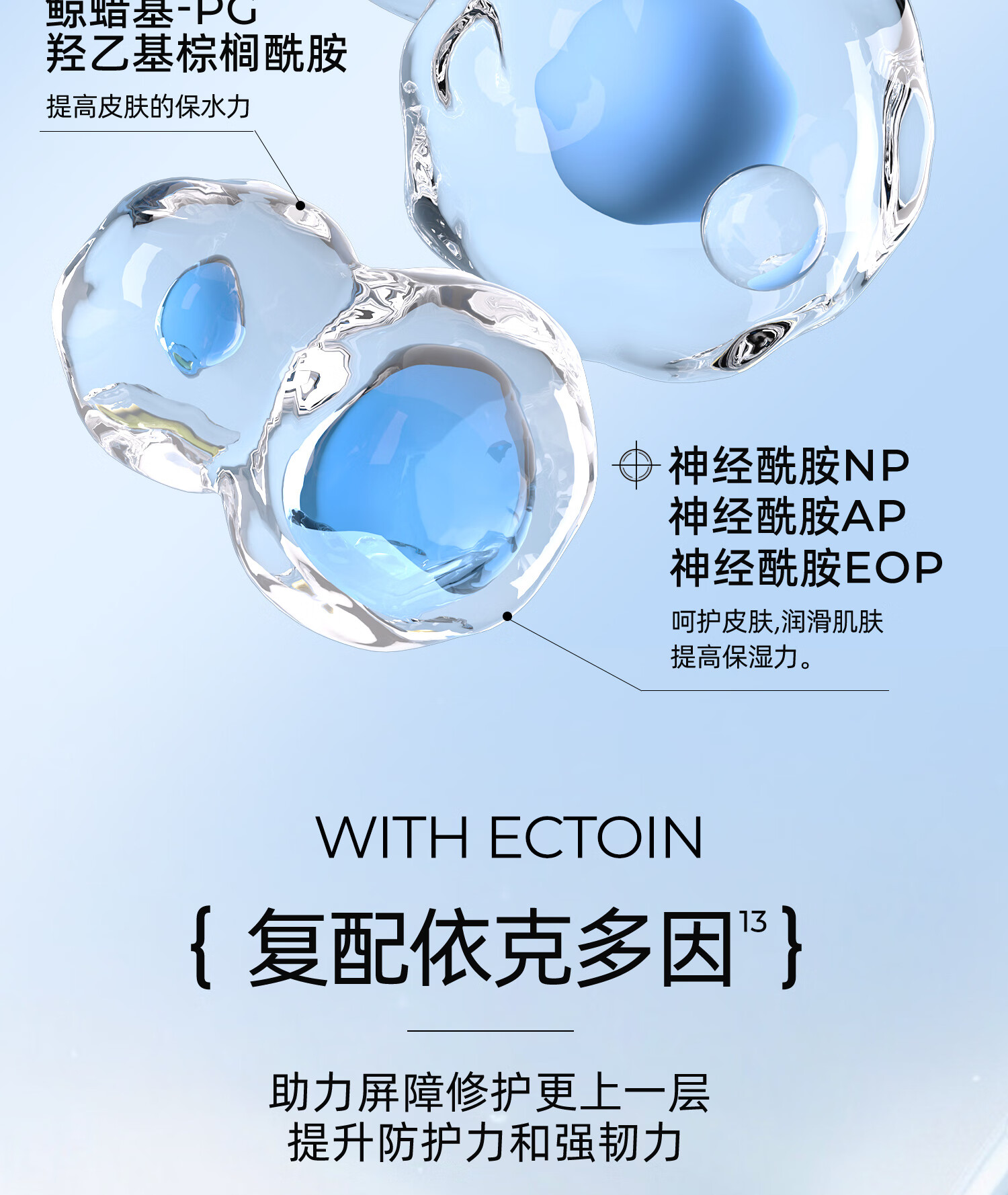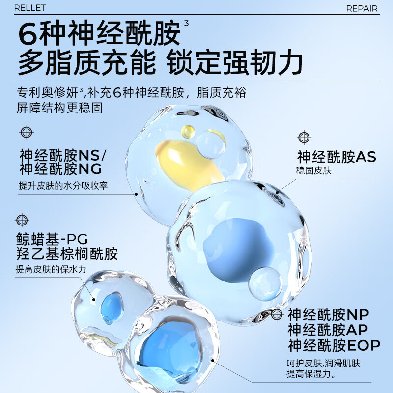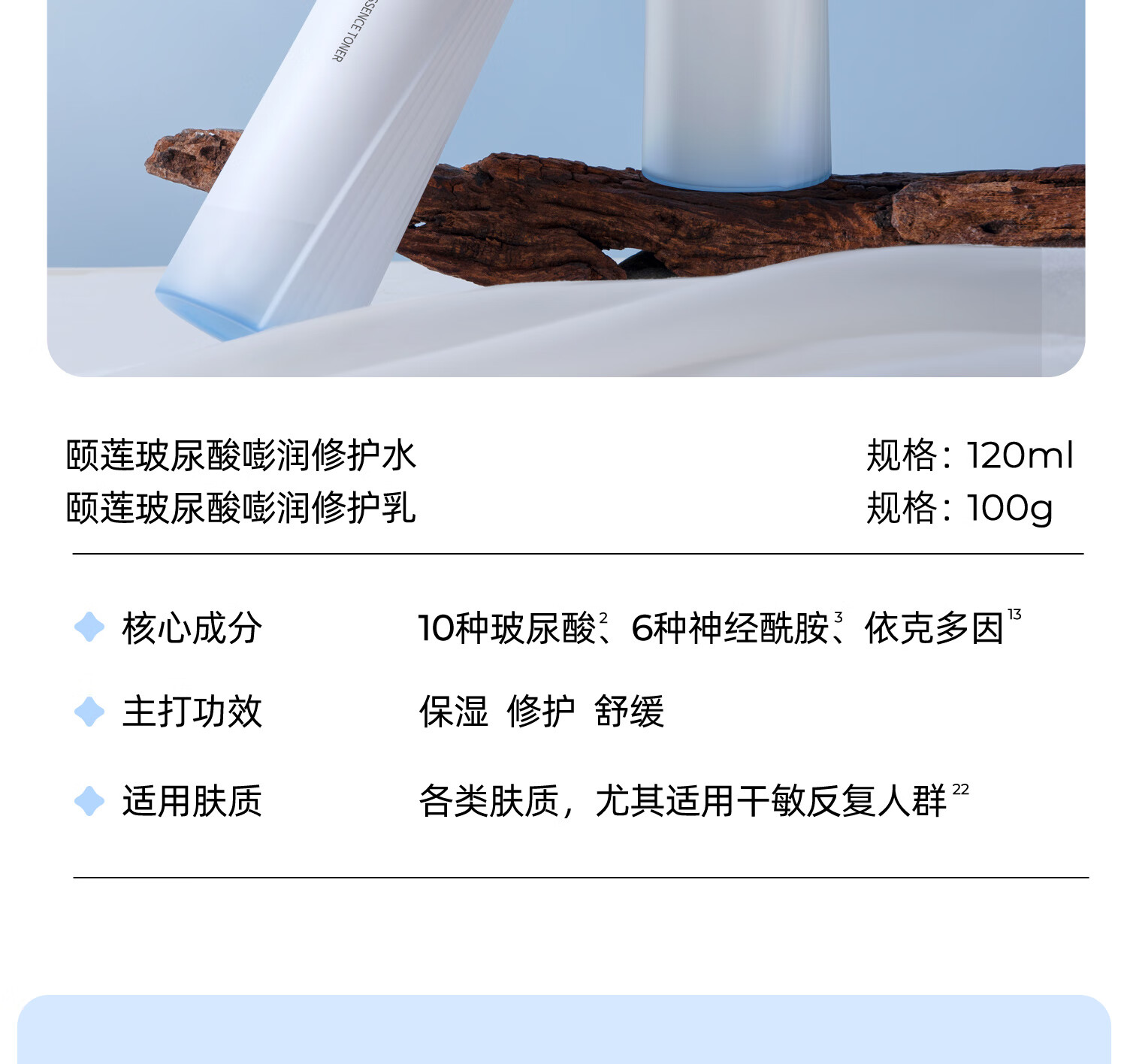 保湿 修护 舒缓;10种玻尿酸、6种神经酰胺、依克多因;各类肤质,尤其适用干敏反复人群