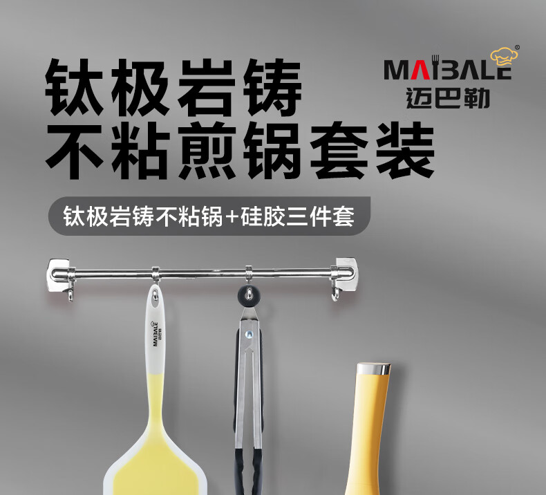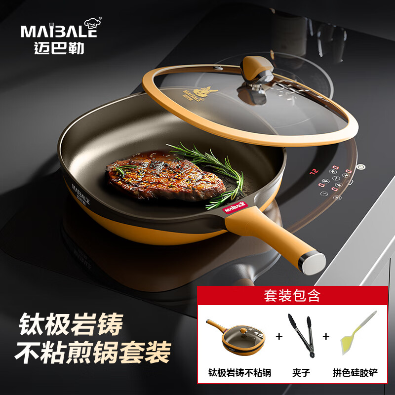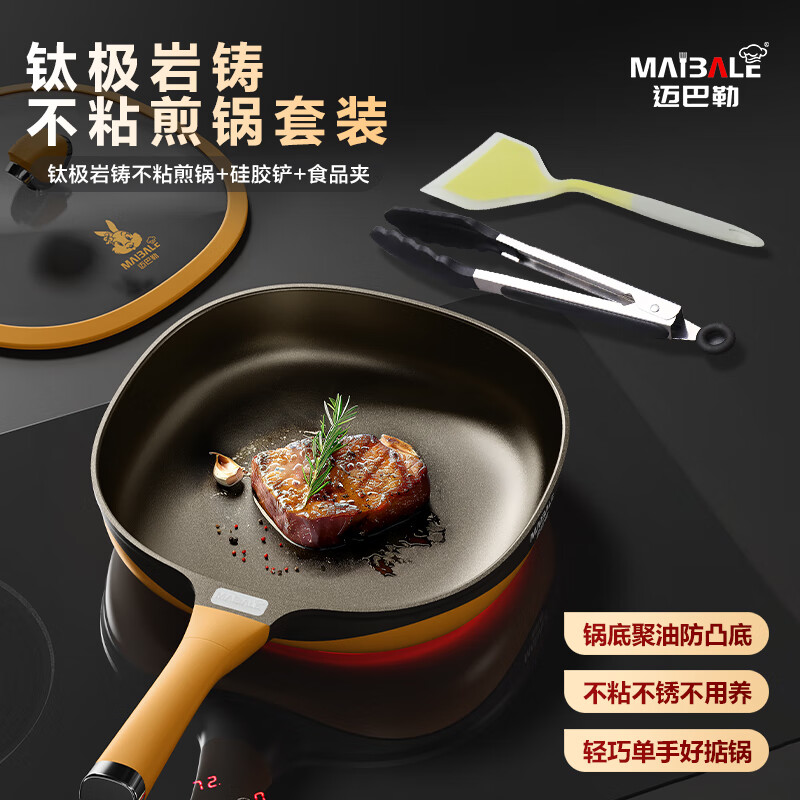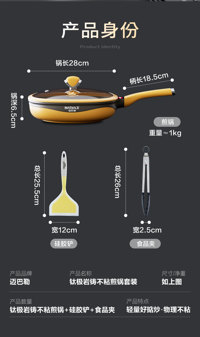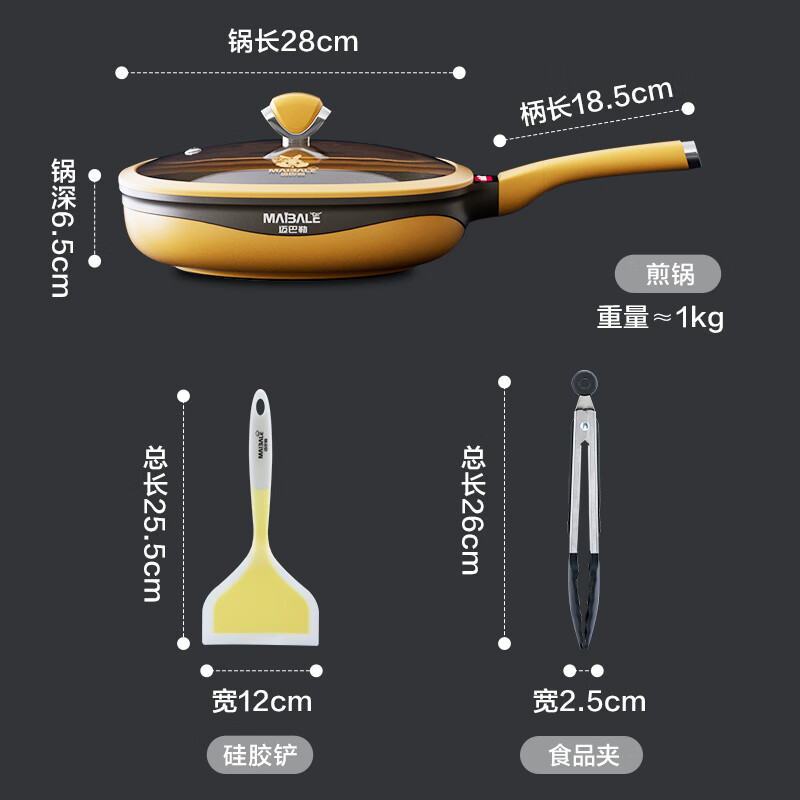 迈巴勒 聚油煎锅平底锅28cm+夹子M-2222LP+硅胶铲三件套