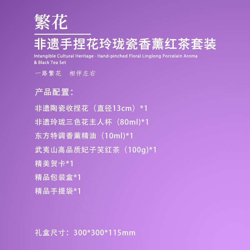 配置清单:非遗陶瓷收捏花(直径13cm)*1 非遗玲珑三色花主人杯(80ml)*1 东方特调香薰精油(10ml)*1 福鼎白茶(磻溪核心产区)寿眉(50g)*1 精美贺卡*1 精品包装盒*1 精品手提袋*1