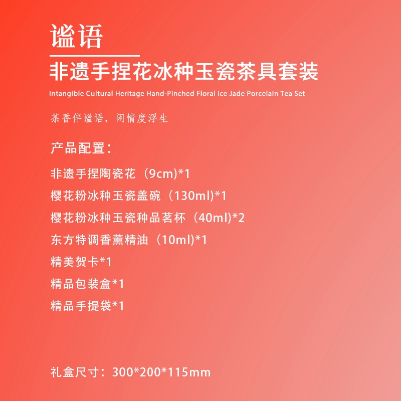 配置清单:非遗手捏陶瓷花(9cm)*1 樱花粉冰种玉瓷盖碗(130ml)*1 樱花粉冰种玉瓷种品茗杯(40ml)*2 东方特调香薰精油(10ml)*1 精美贺卡*1 精品包装盒*1 精品手提袋*1