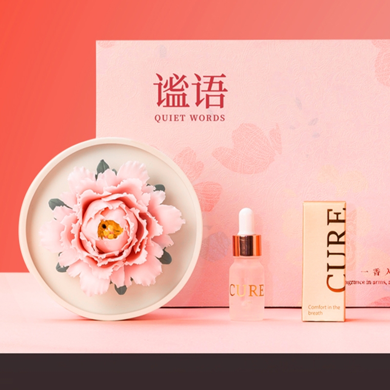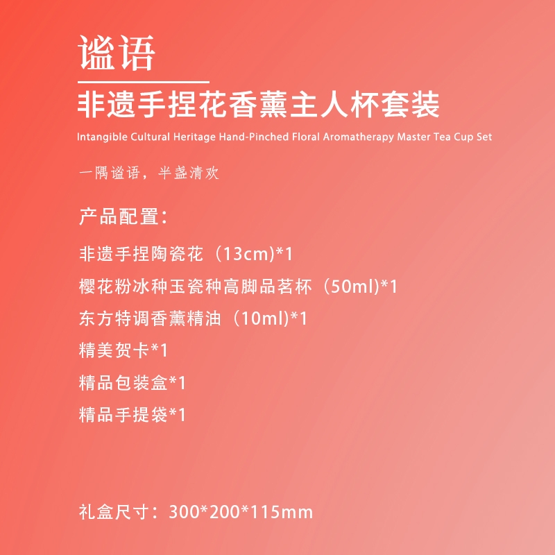 配置清单:非遗手捏陶瓷花(13cm)*1 樱花粉冰种玉瓷种高脚品茗杯(50ml)*1 东方特调香薰精油(10ml)*1 精美贺卡*1 精品包装盒*1 精品手提袋*1