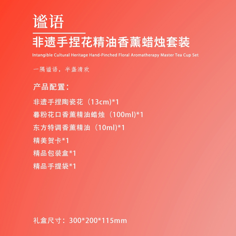 配置清单:非遗手捏陶瓷花(13cm)*1 暮粉花口香薰精油蜡烛(100ml)*1 东方特调香薰精油(10ml)*1 精美贺卡*1 精品包装盒*1 精品手提袋*1