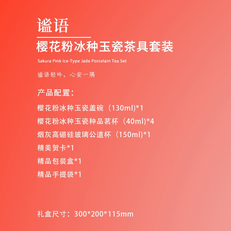 配置清单:樱花粉冰种玉瓷盖碗(130ml)*1 樱花粉冰种玉瓷种品茗杯(40ml)*4 烟灰高硼硅玻璃公道杯(150ml)*1 精美贺卡*1 精品包装盒*1 精品手提袋*1