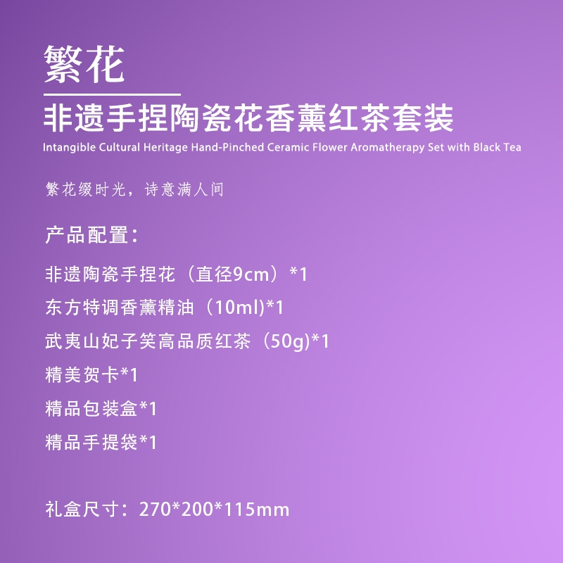 9cm 非遗手捏陶瓷花,兼具文化价值与艺术装饰性;武夷山妃子笑红茶,口感醇厚有保障;一套涵盖茶品与东方特调香薰,营造雅致生活氛围;“繁花” 主题 + 紫色调,传递诗意氛围感;配套精美包装与贺卡,仪式感拉满