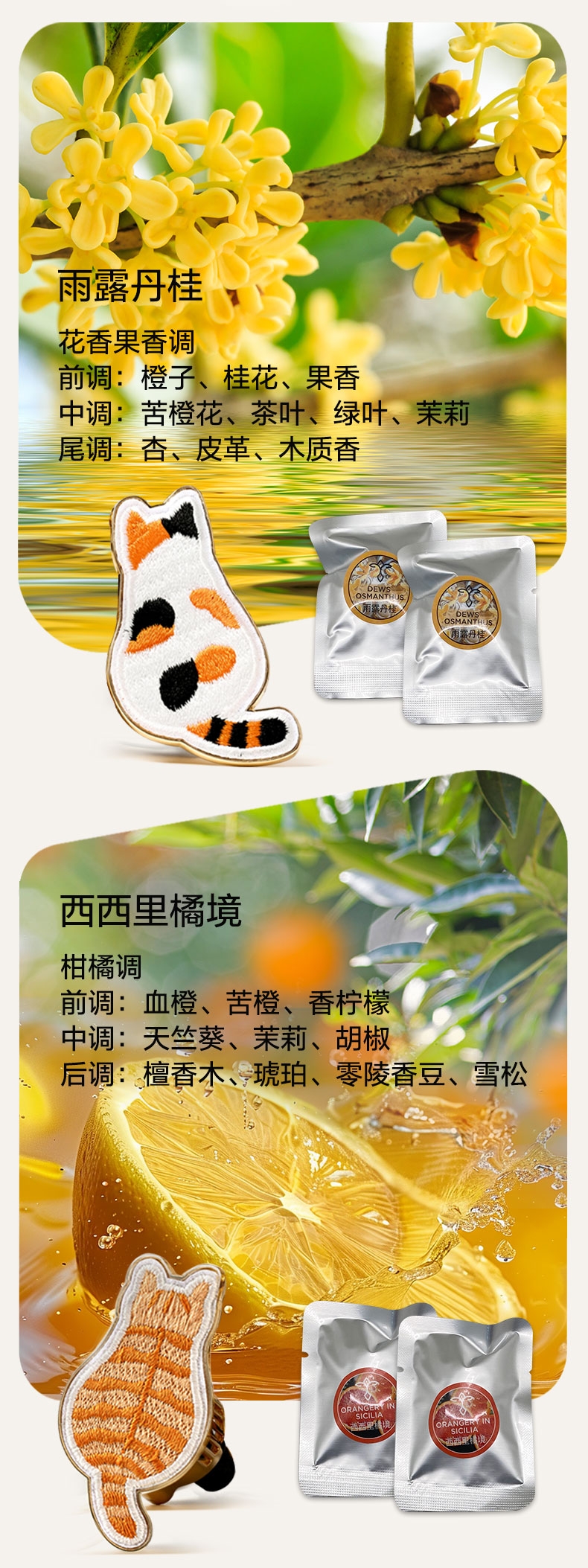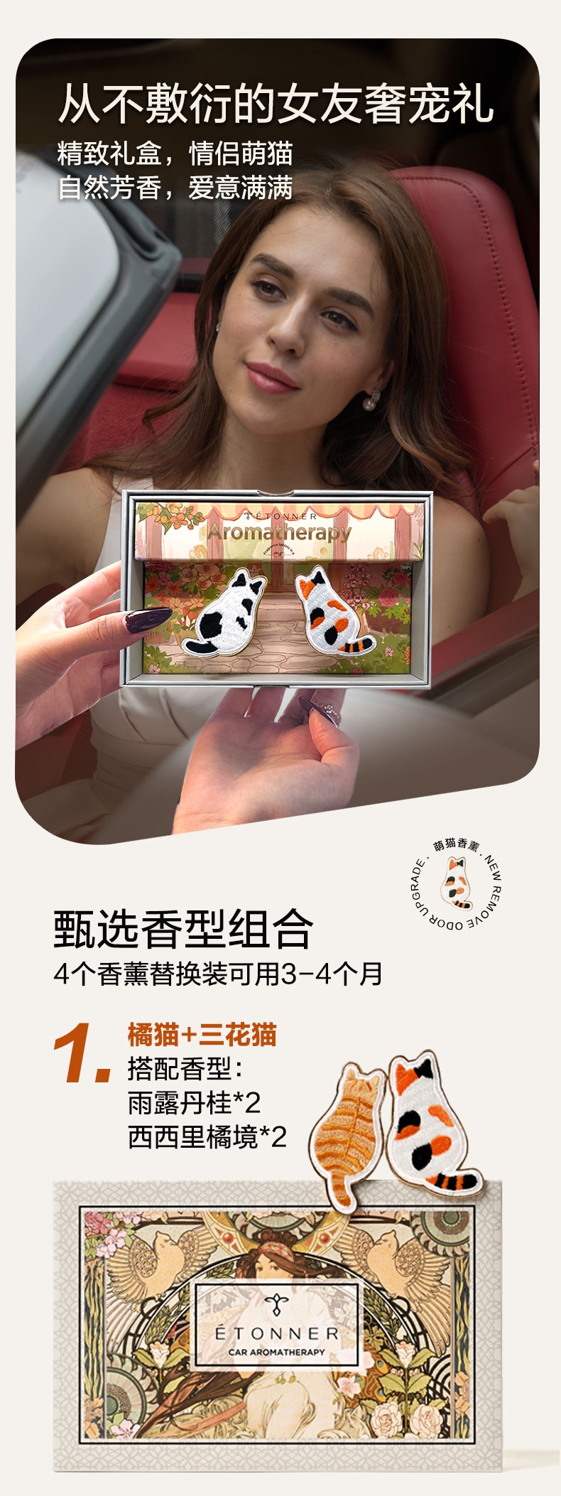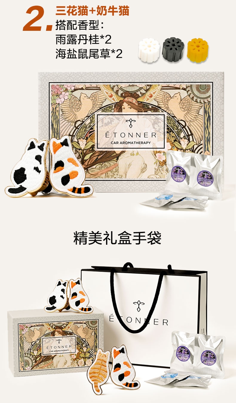 配置清单:萌猫出风口香薰-对装(橘猫+三花猫)高分子固体香块(海盐鼠尾草2+雨露丹桂2)礼盒+手袋