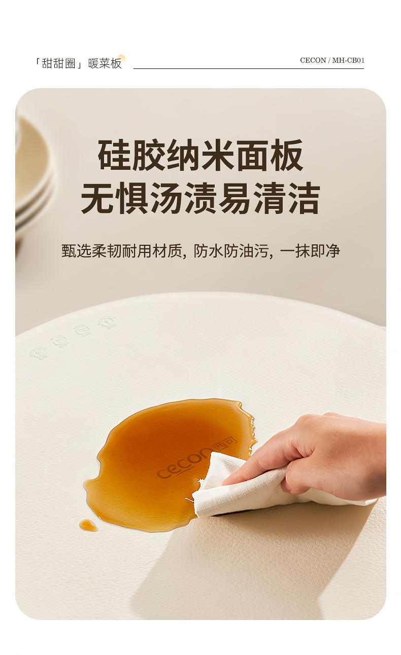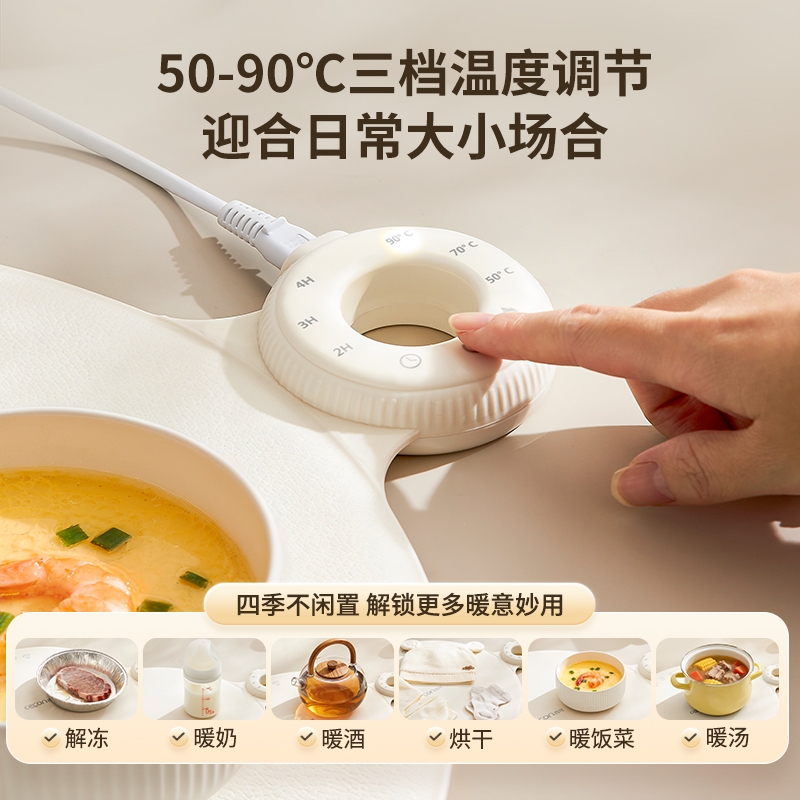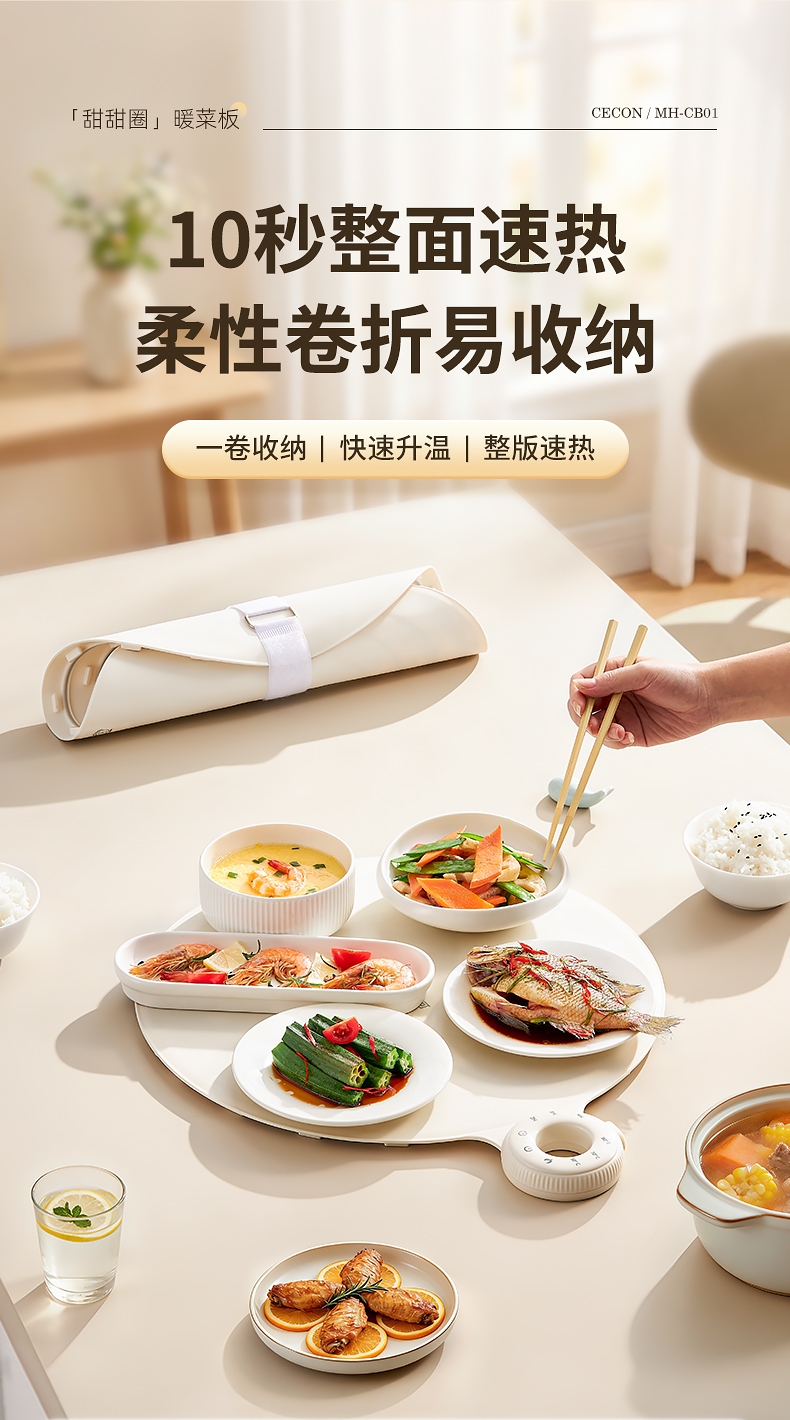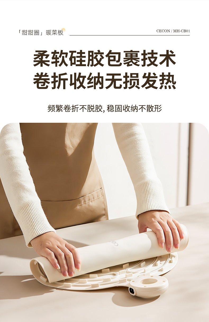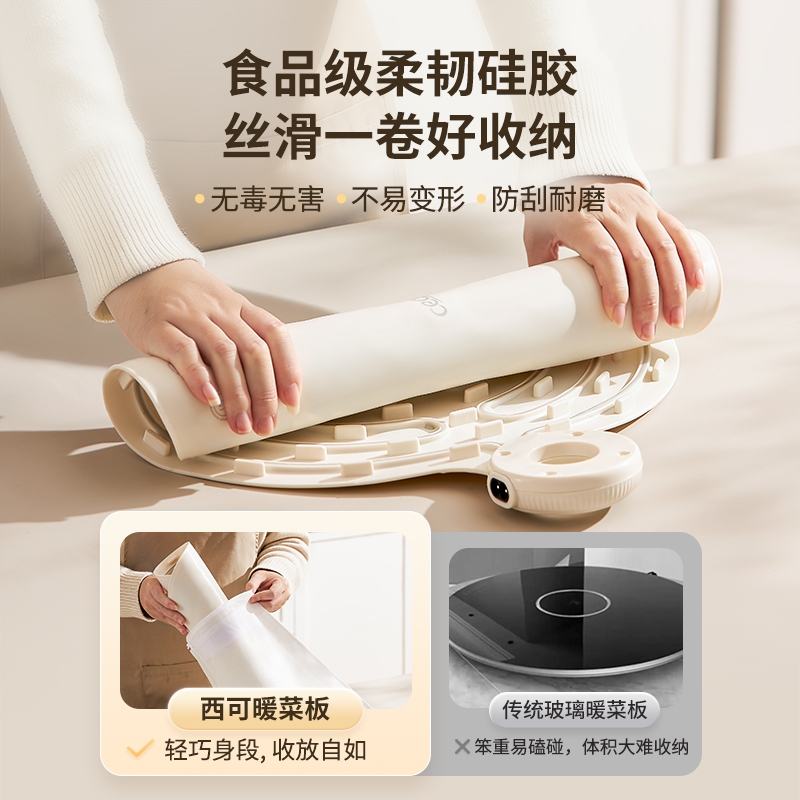 柔软硅胶包裹技术,卷折收纳无损发热;发热丝密集排布250W大功率快速热传递整版10s速;50℃-90℃3档温度调节;适应各种耐高温餐具,玻璃/砂锅/陶瓷/奶瓶/锡纸盘;胶纳米面板,柔韧耐用,防水防油污,一抹即净