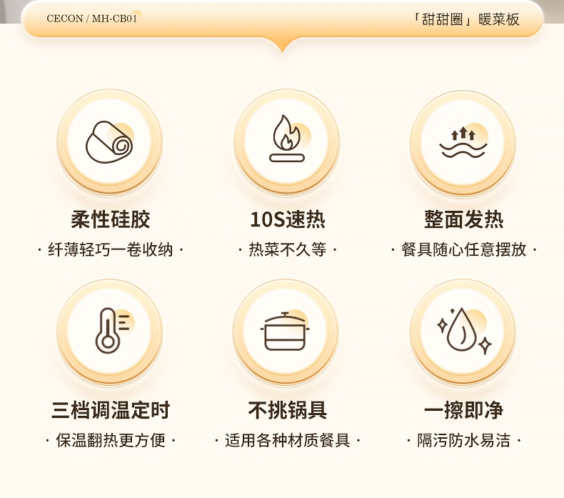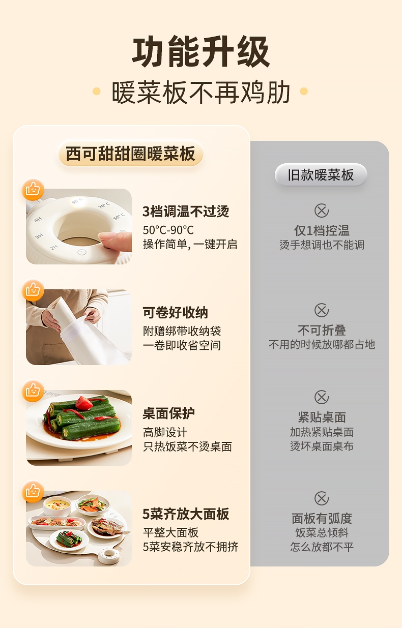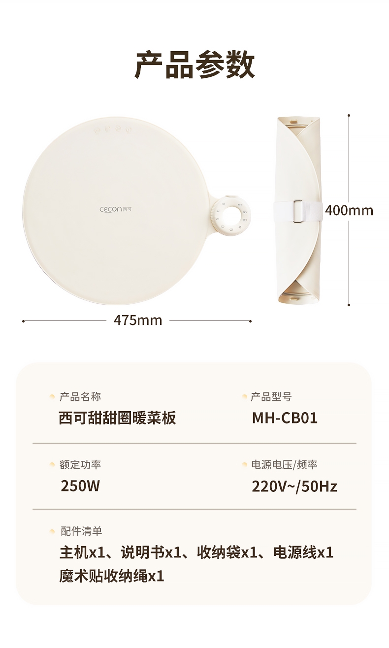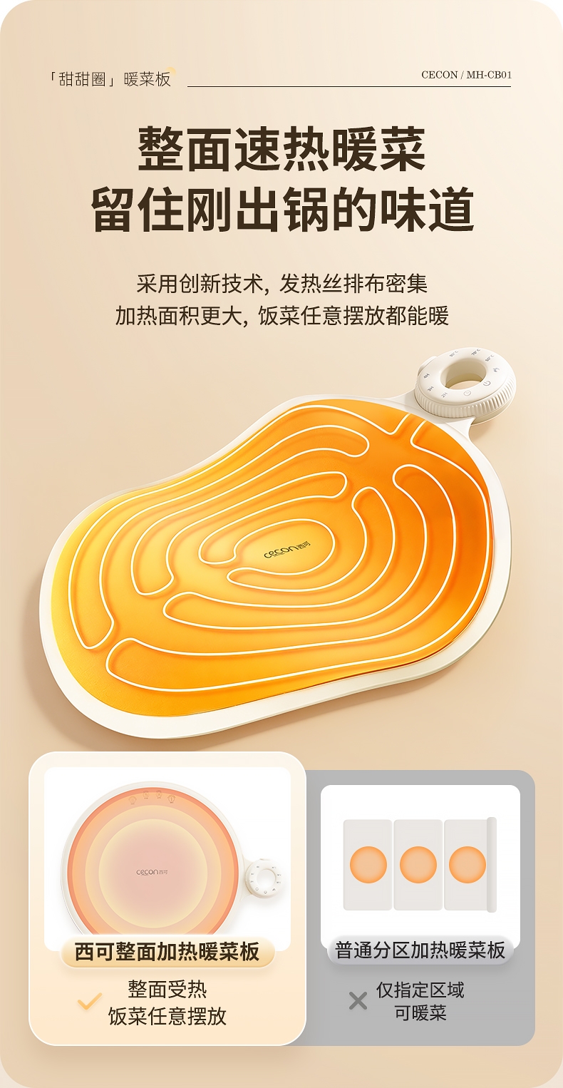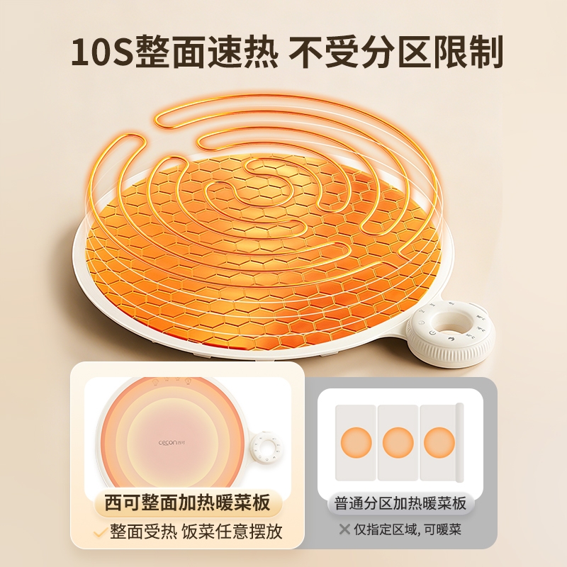 柔软硅胶包裹技术,卷折收纳无损发热;发热丝密集排布250W大功率快速热传递整版10s速;50℃-90℃3档温度调节;适应各种耐高温餐具,玻璃/砂锅/陶瓷/奶瓶/锡纸盘;胶纳米面板,柔韧耐用,防水防油污,一抹即净