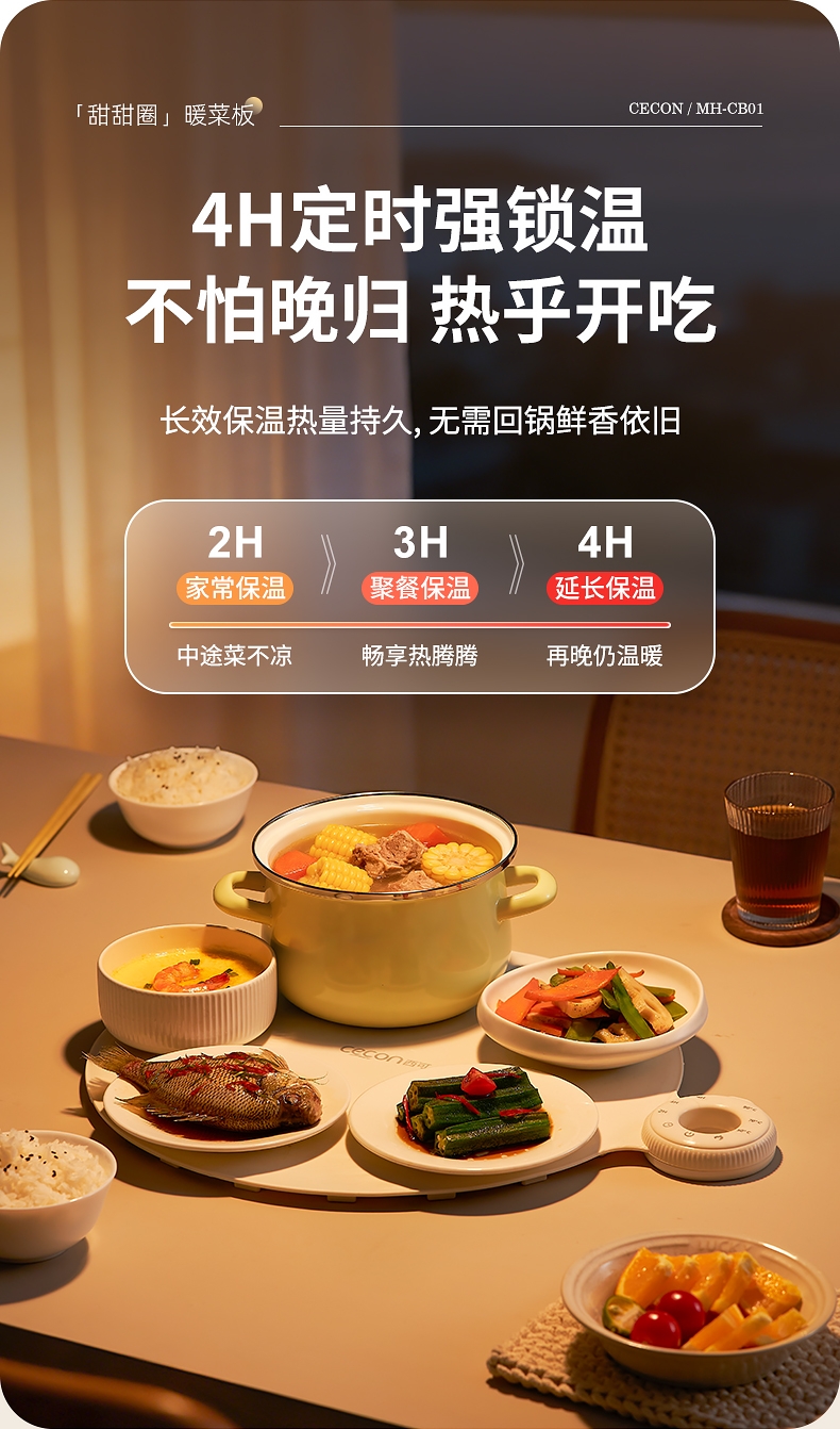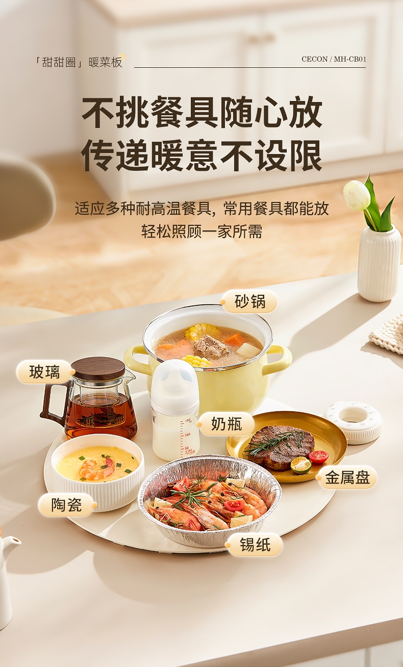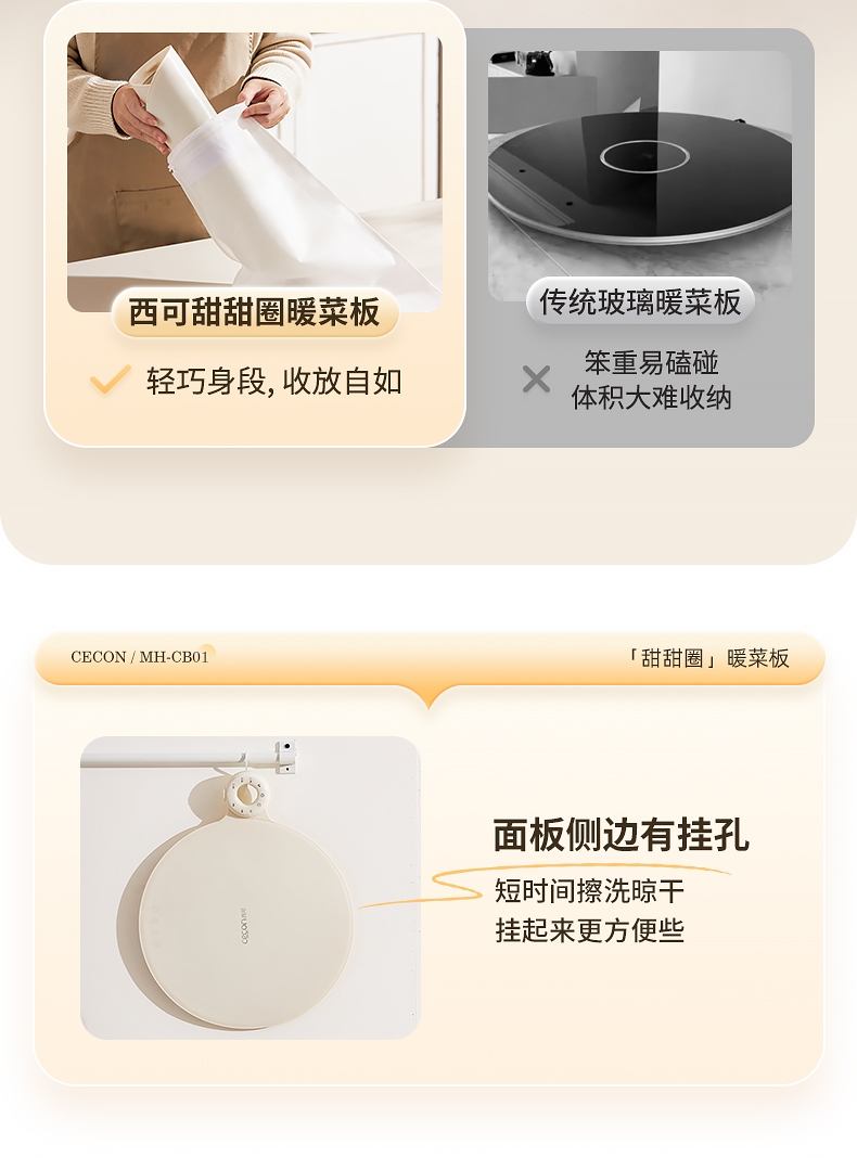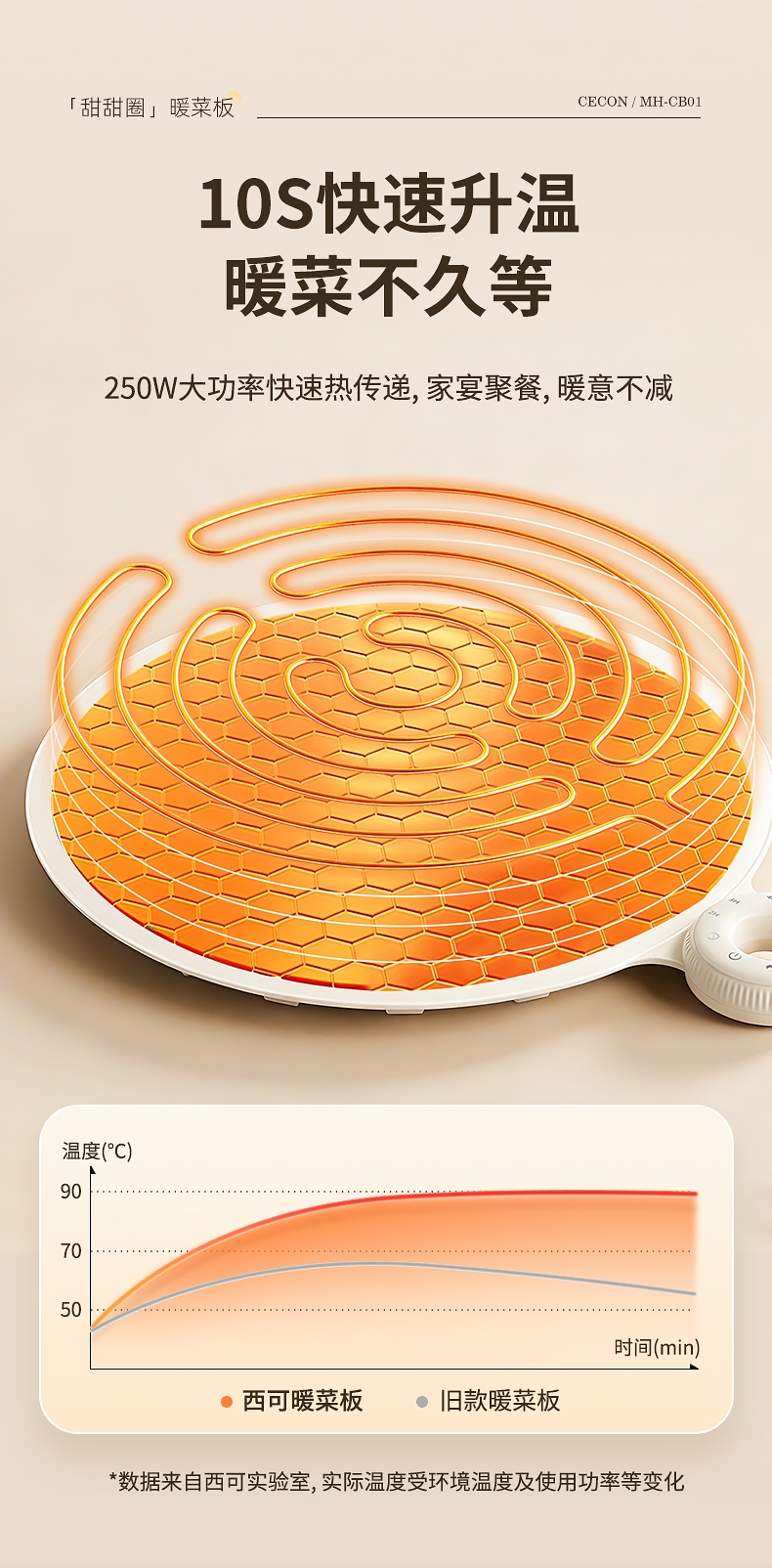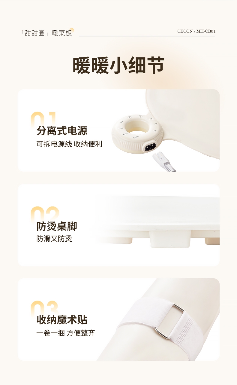 柔软硅胶包裹技术,卷折收纳无损发热;发热丝密集排布250W大功率快速热传递整版10s速;50℃-90℃3档温度调节;适应各种耐高温餐具,玻璃/砂锅/陶瓷/奶瓶/锡纸盘;胶纳米面板,柔韧耐用,防水防油污,一抹即净