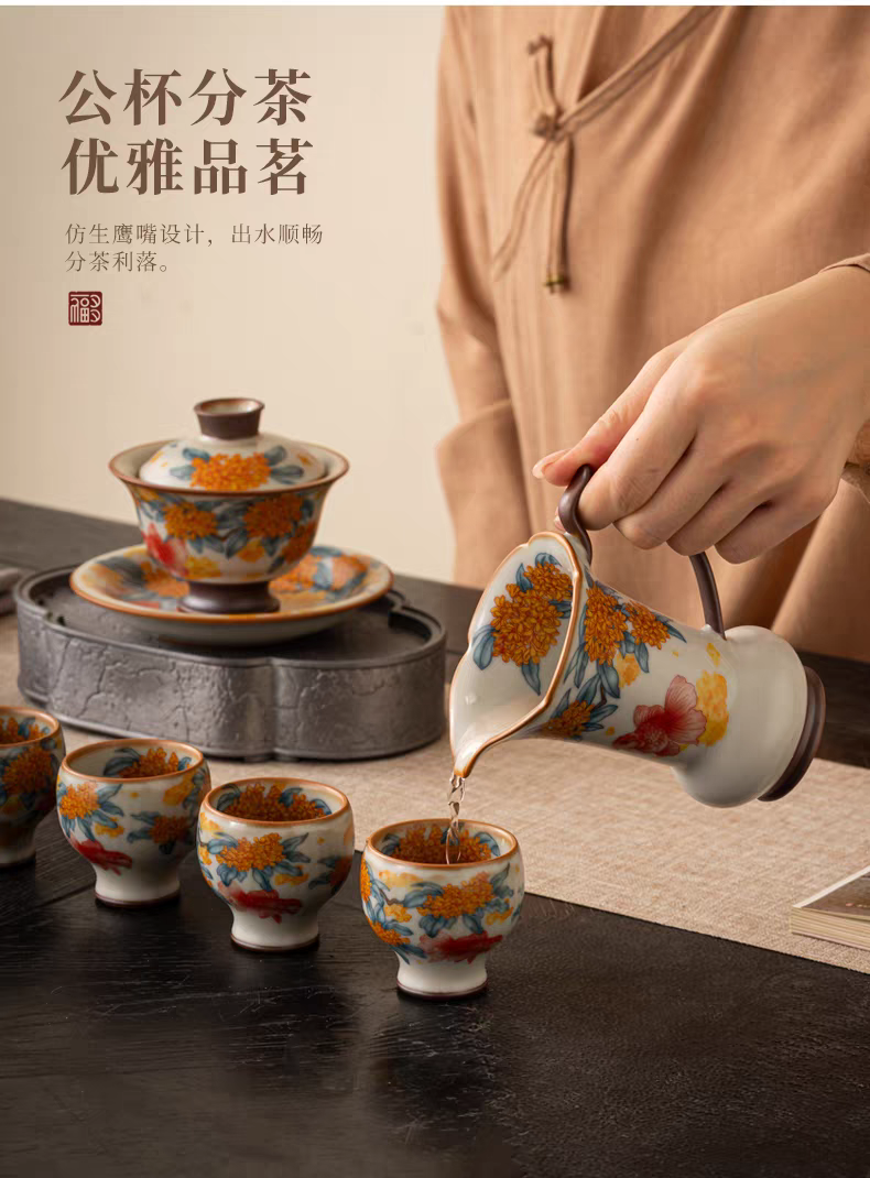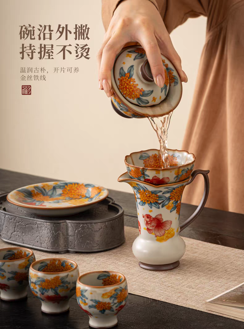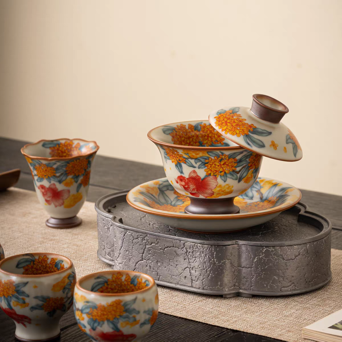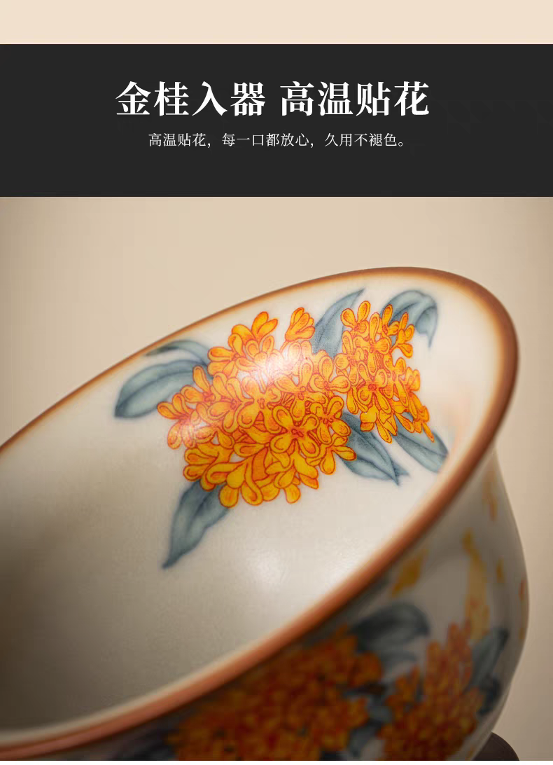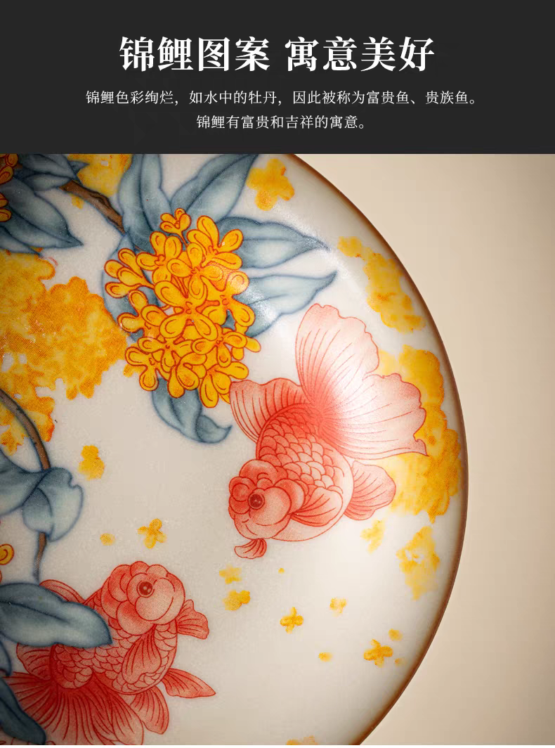 金鲤桂花,寓意金贵,连年有鱼。内外皆有画面;玛瑙入釉,蝉翼开片,家有千财万贯,不如汝窑一片;亚黄汝瓷,独家专利技术新品,采用高价优质瓷土,