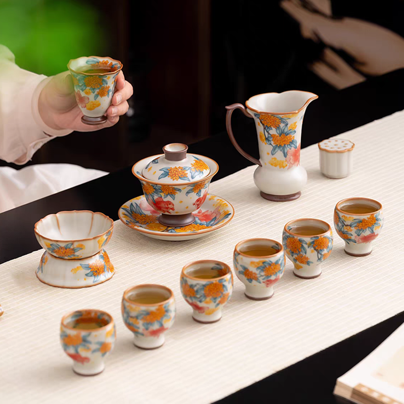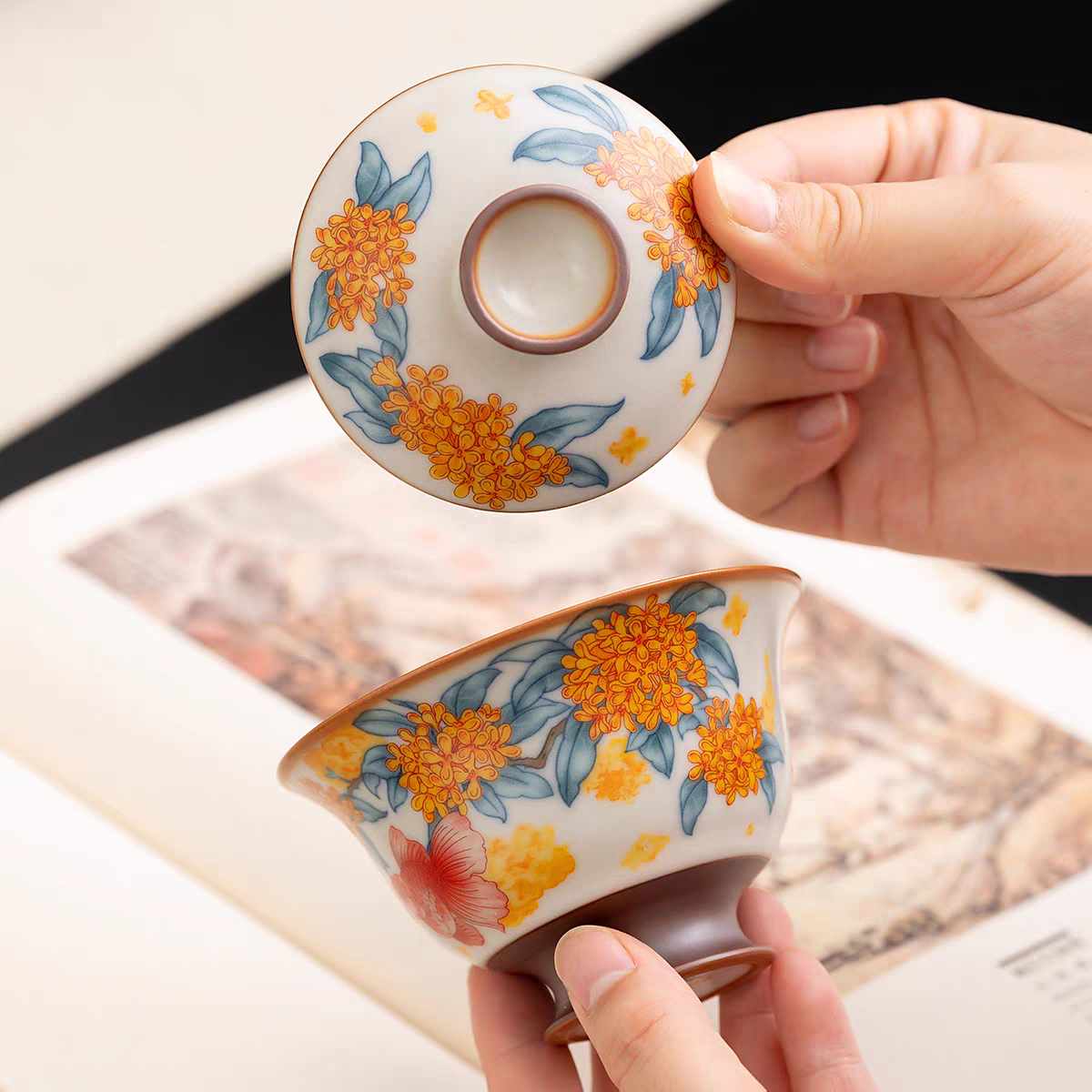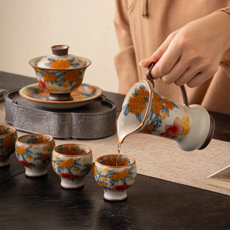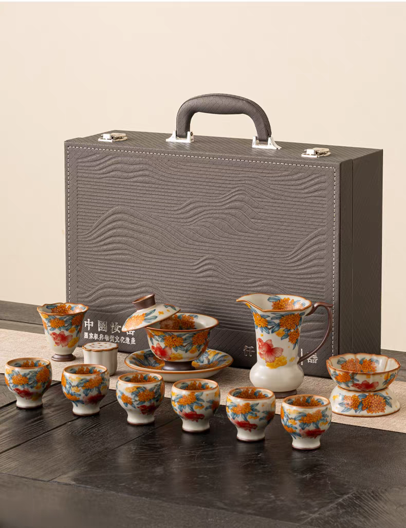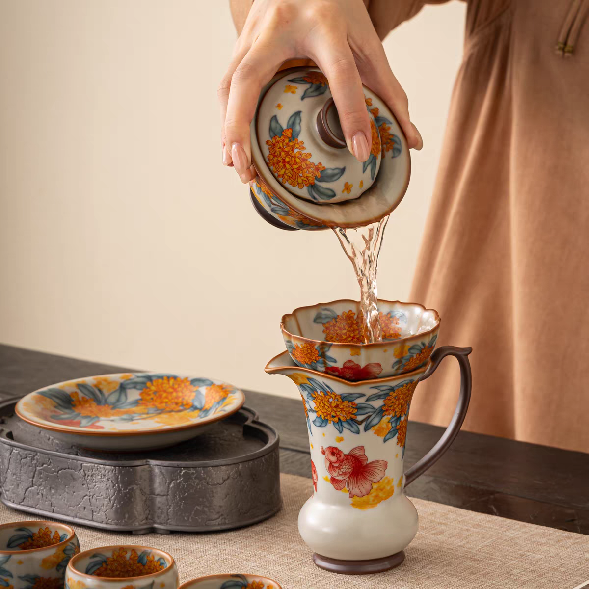 金鲤桂花,寓意金贵,连年有鱼。内外皆有画面;玛瑙入釉,蝉翼开片,家有千财万贯,不如汝窑一片;亚黄汝瓷,独家专利技术新品,采用高价优质瓷土,