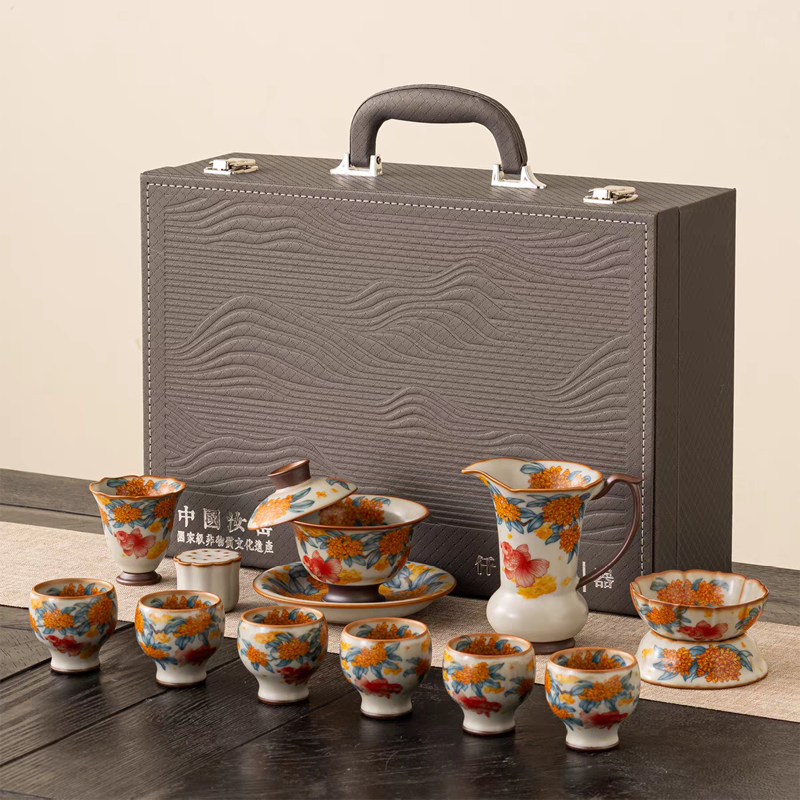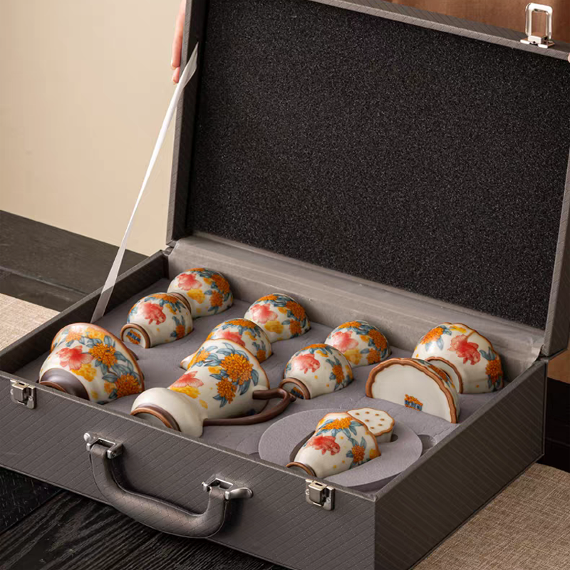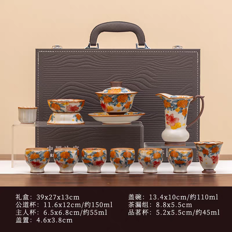 配制:1盖碗 6杯 1壶承 1主人杯 1盖置 1公道杯1茶托1茶漏 1收藏证书 1高档皮箱