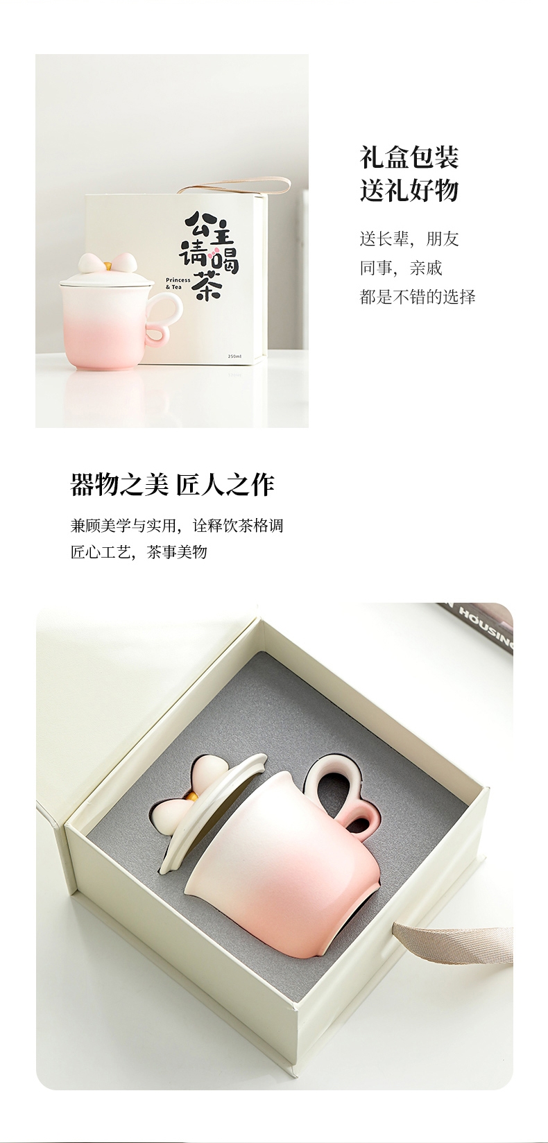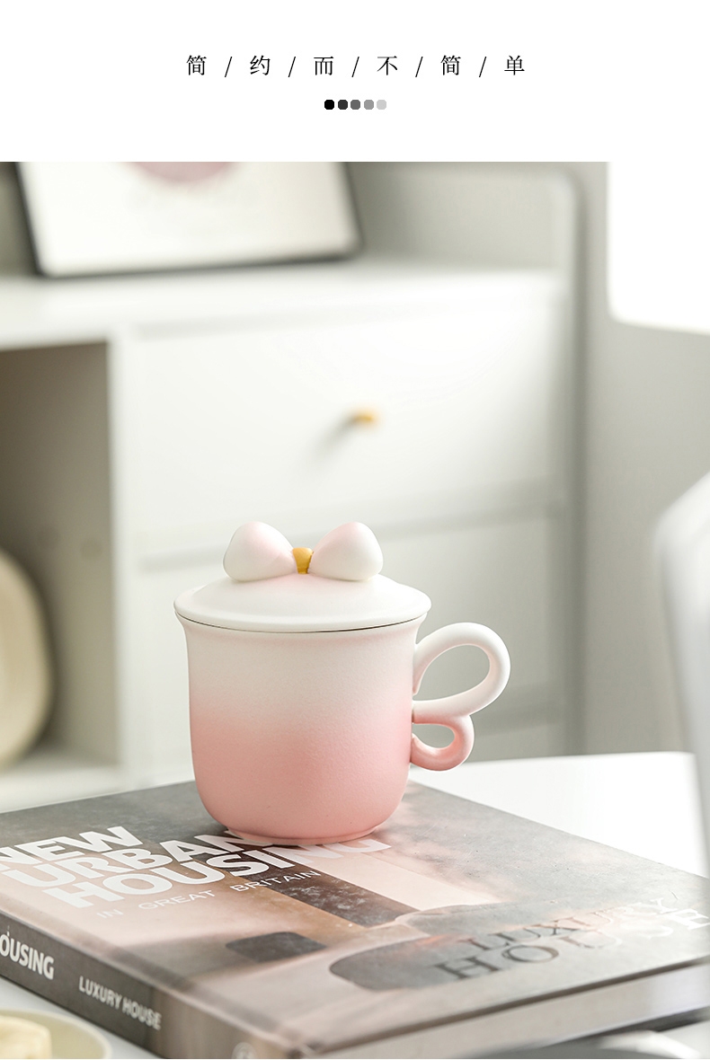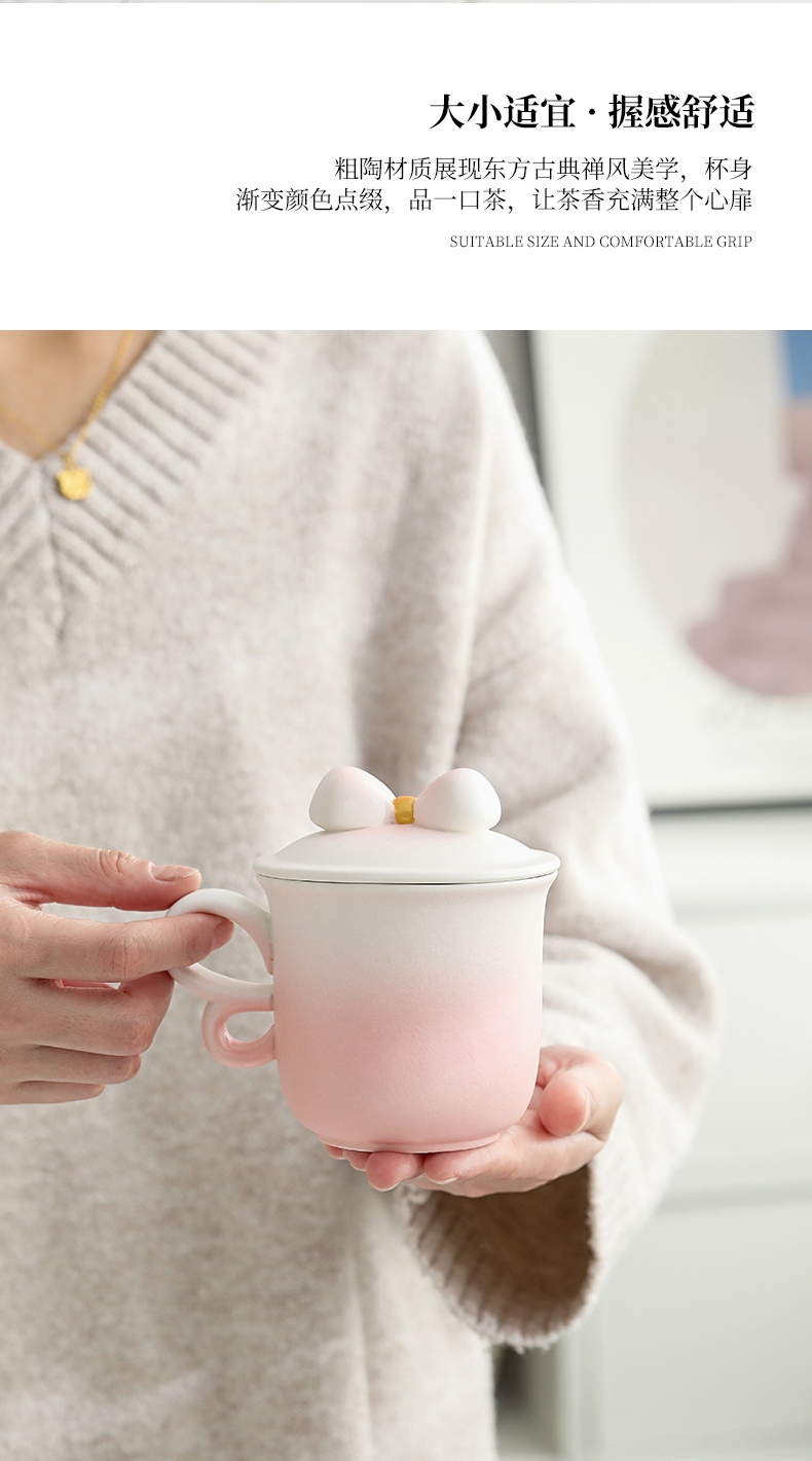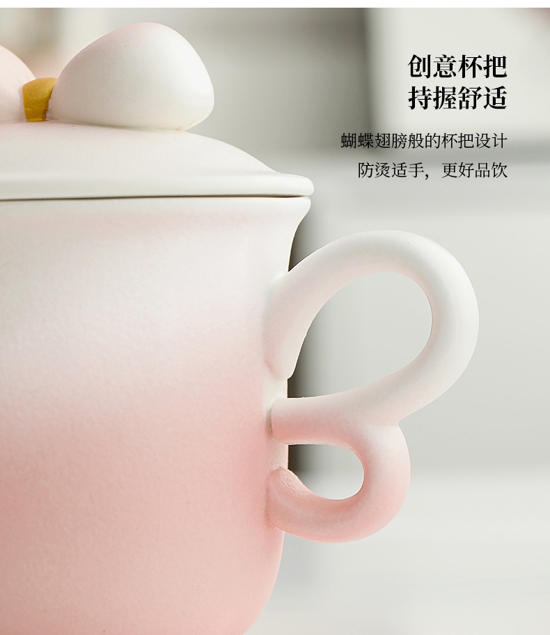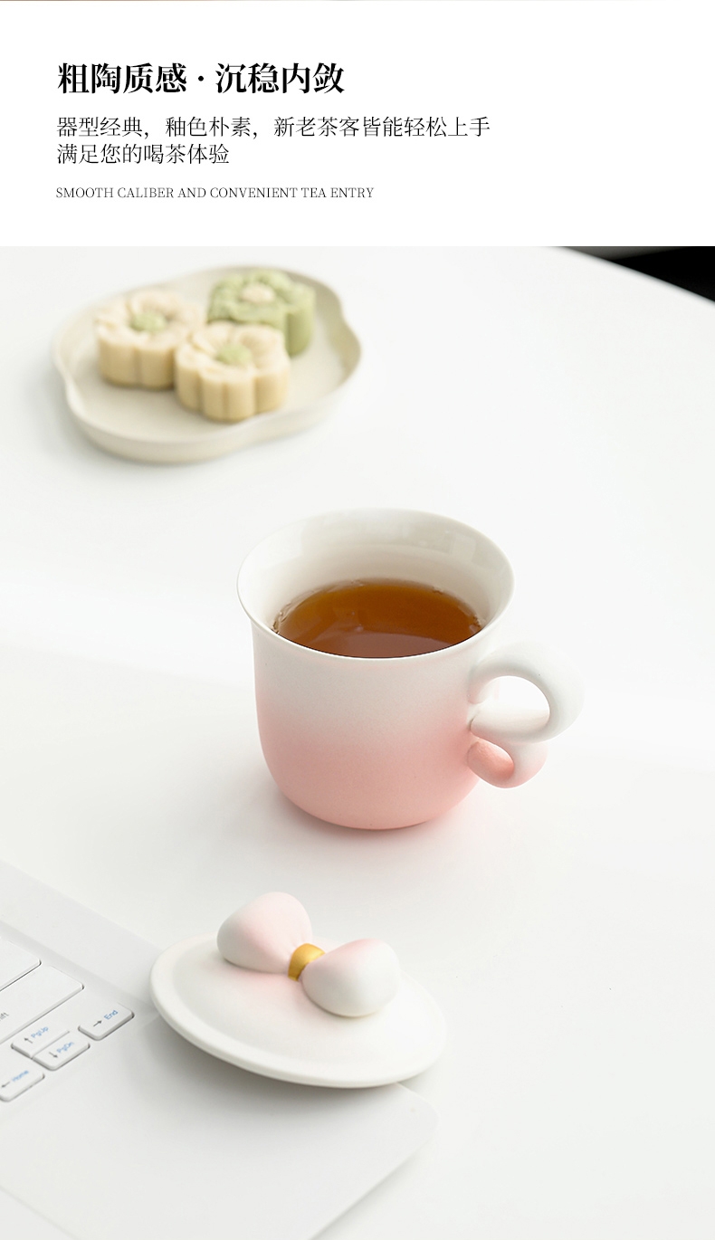 蝴蝶结盖粒及粗陶材质,融合渐变色彩;创意蝴蝶翅膀般的杯把设计防烫适手,更好品饮;新颖时尚与东方古典美学结合,带来愉悦的喝茶体验。