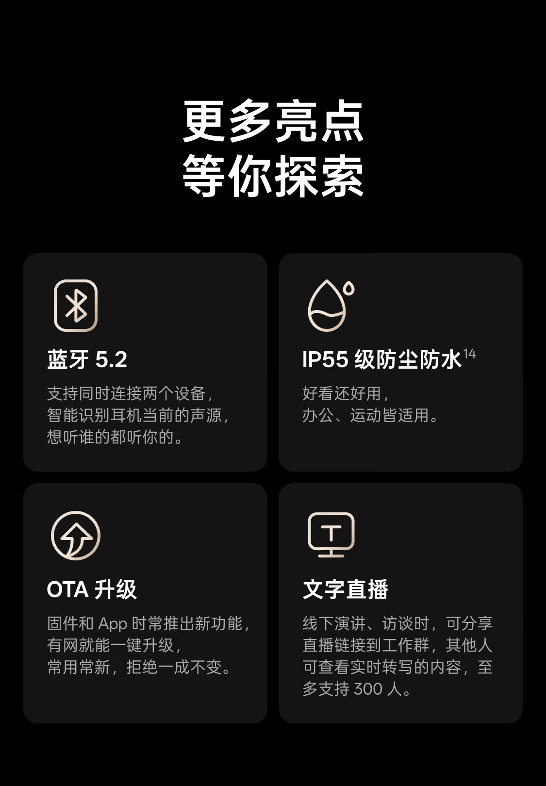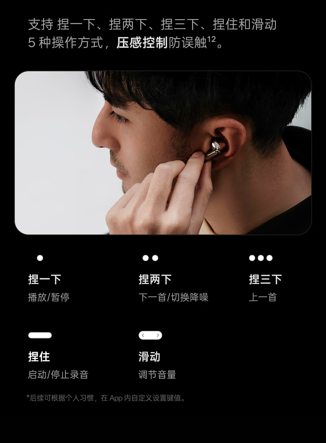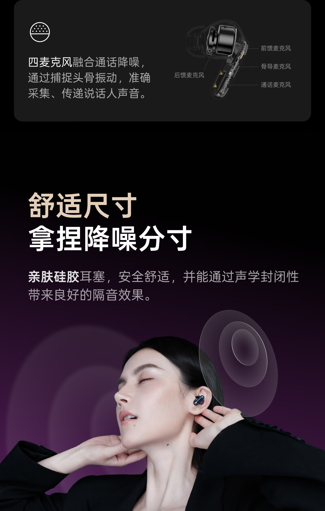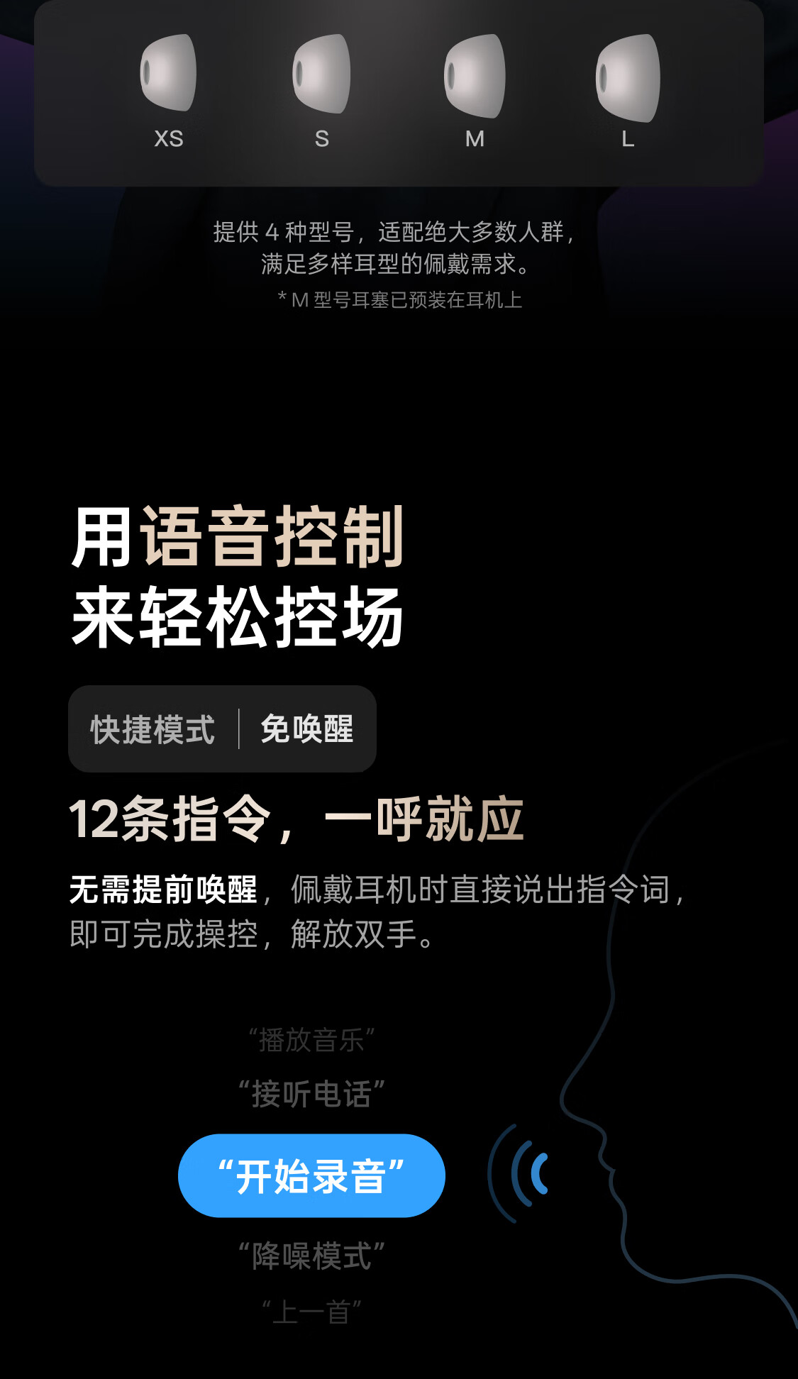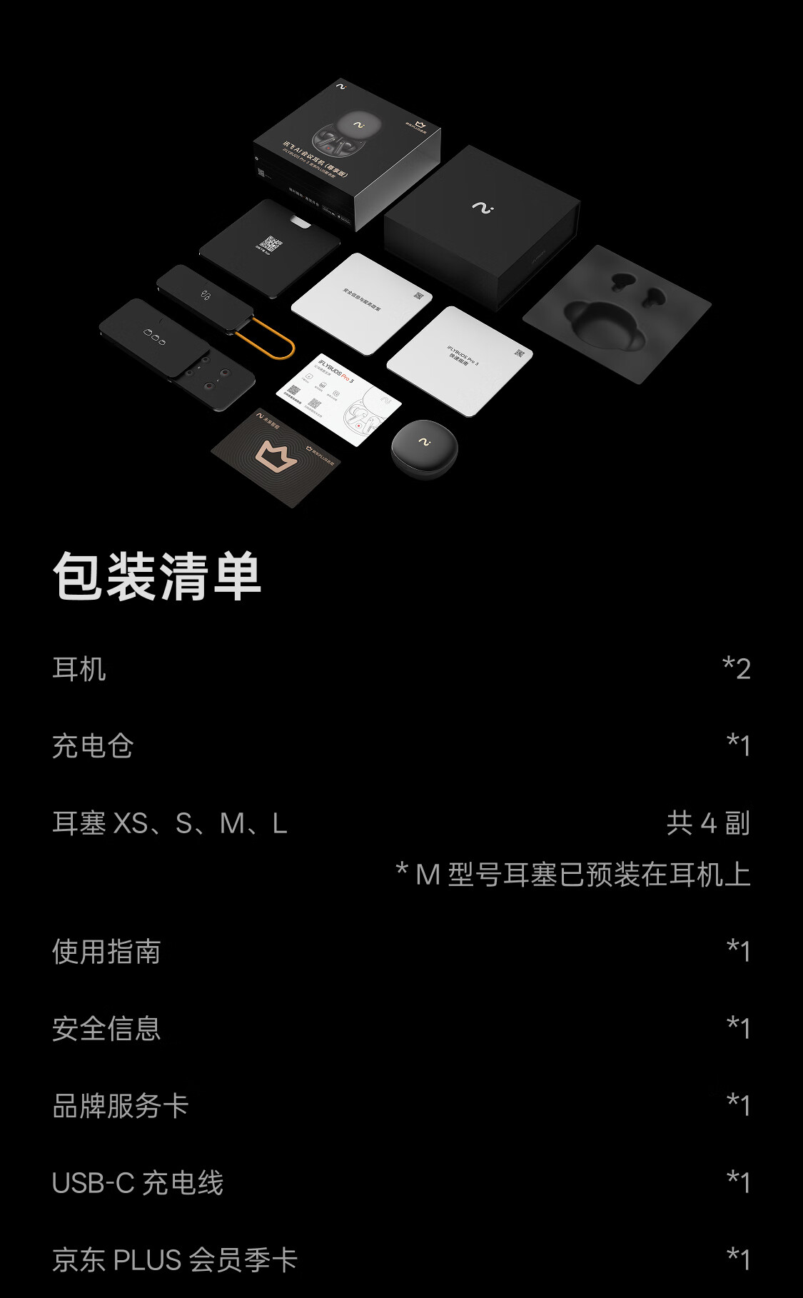 配置清单:耳机*2 充电盒*1 产品手册*1 耳塞XS、S、M、L共4副(耳机已预装M号) USB充电线 (C to C)*1