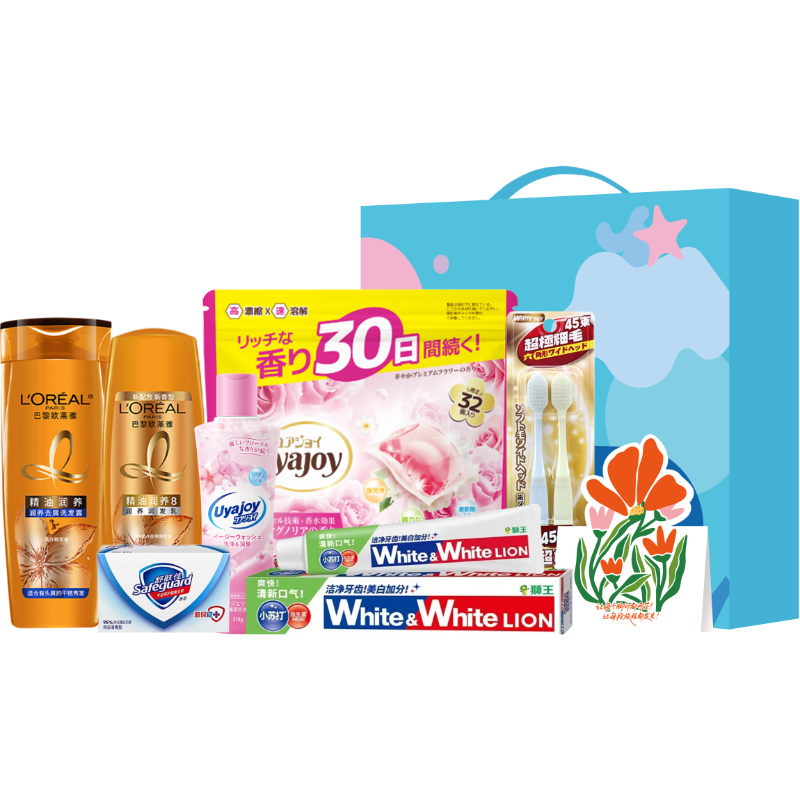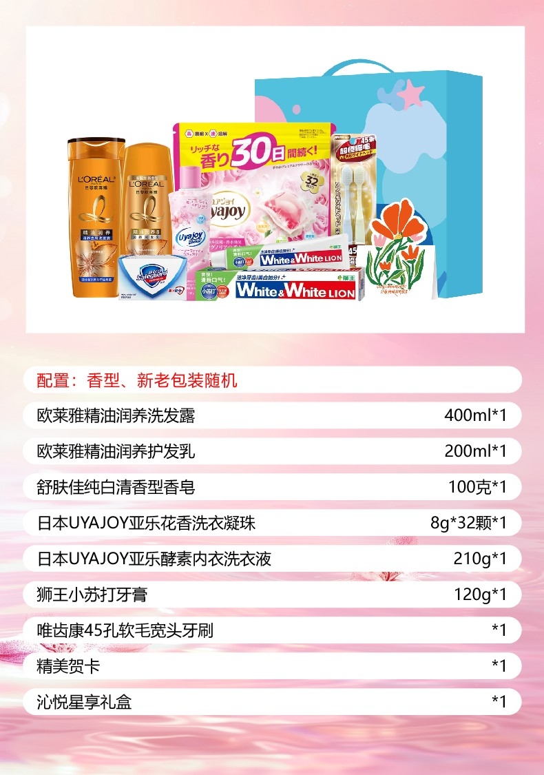 配置清单:欧莱雅精油润养洗发露400ml*1 欧莱雅精油润养护发乳200ml*1 舒肤佳纯白清香型香皂100克*1 日本UYAJOY亚乐花香洗衣凝珠8g*32颗*1 日本UYAJOY亚乐酵素内衣洗衣液210g*1 狮王(Lion)小苏打牙膏120g*1 唯齿康45孔软毛宽头牙刷(2支装)*1 精美贺卡*1 沁悦星享礼盒ZS226*1