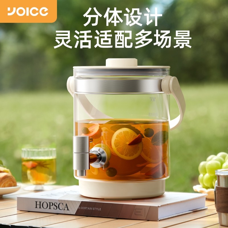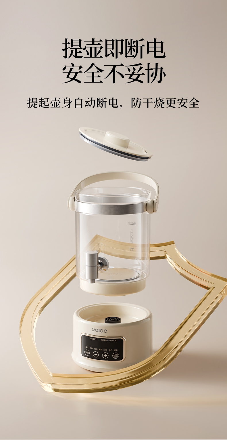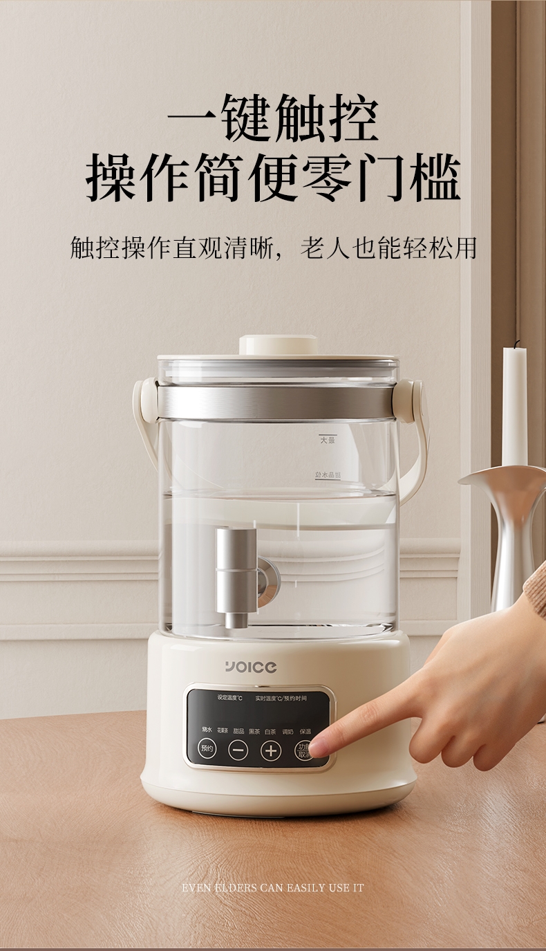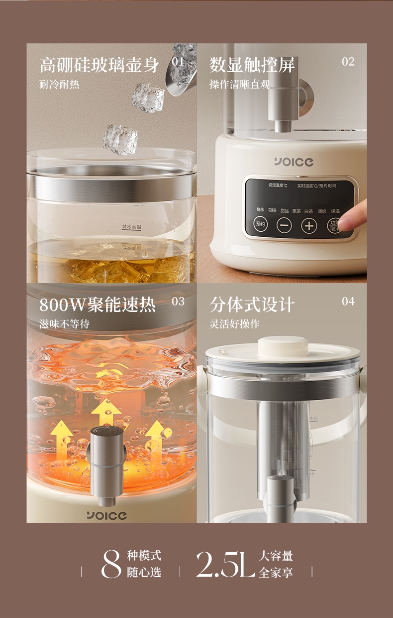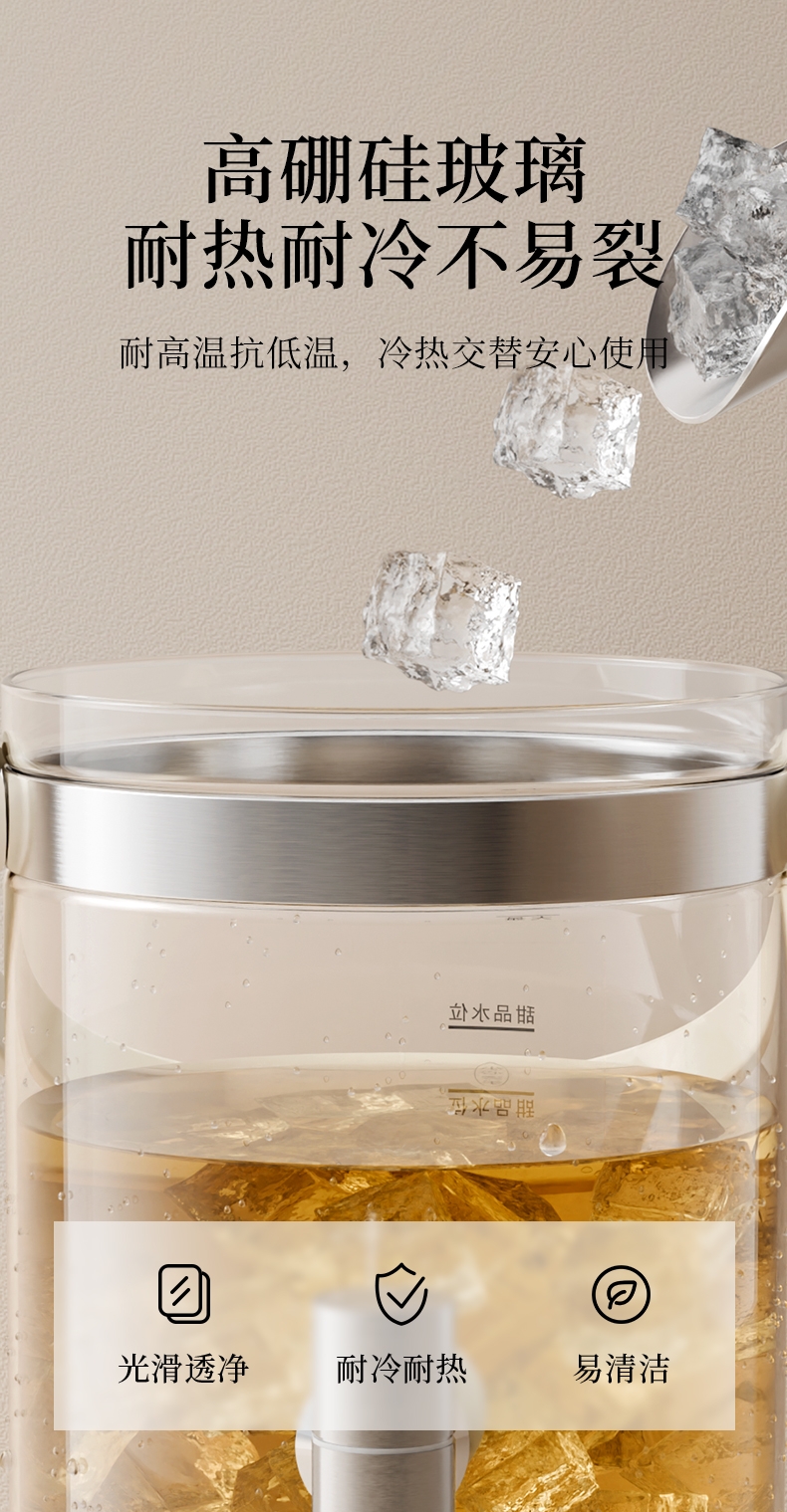 .高硼硅玻璃壶身,健康有保障;2.5L大容量,可满足家庭需求;智能温控器,安全防溢防干烧;壶体设置水龙头,取水方便;智能操控面板,分体式设计,方便加水、清洗