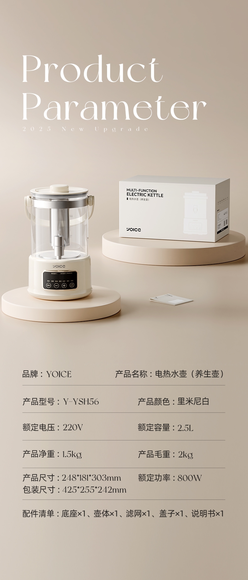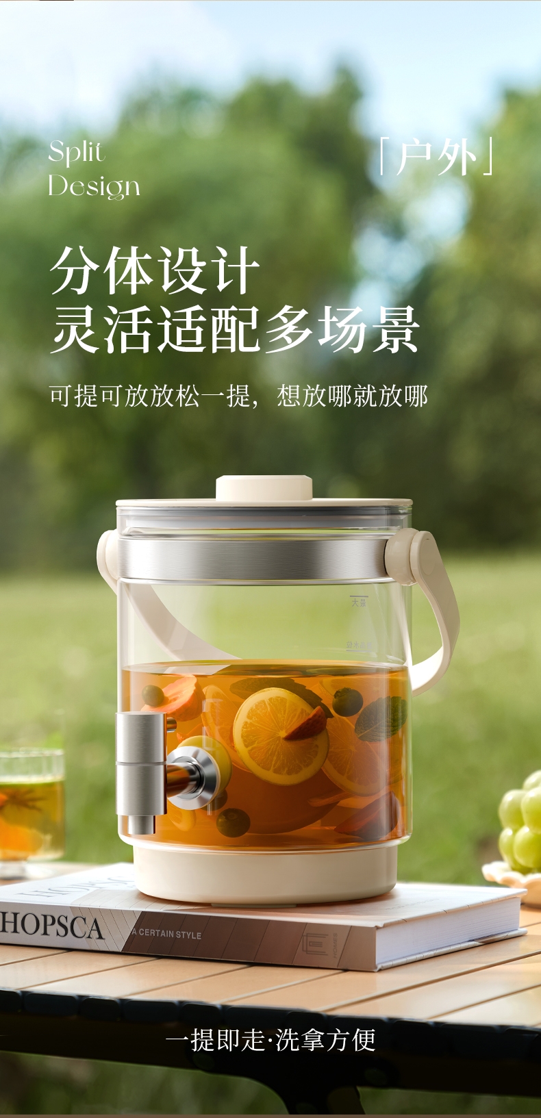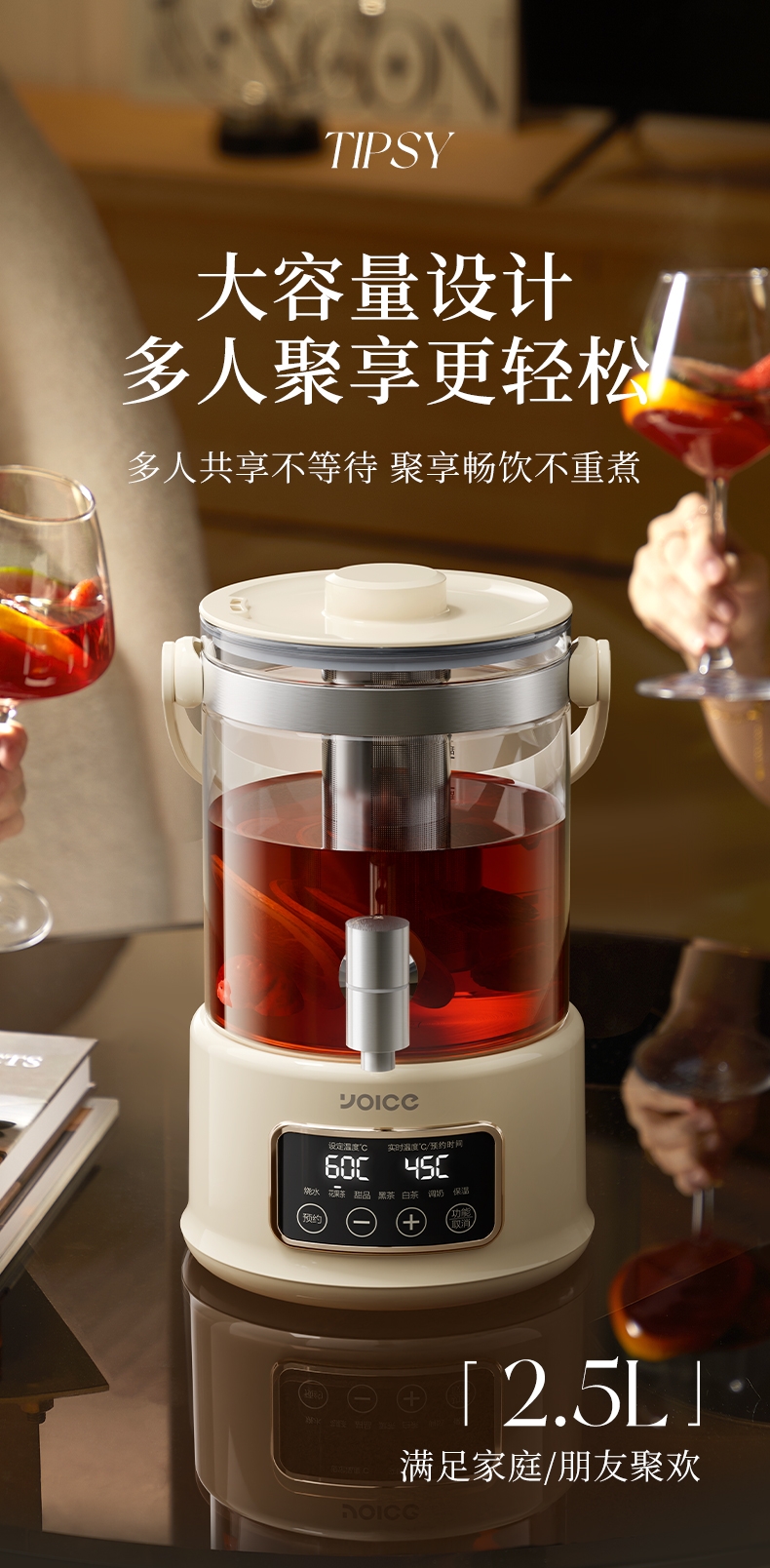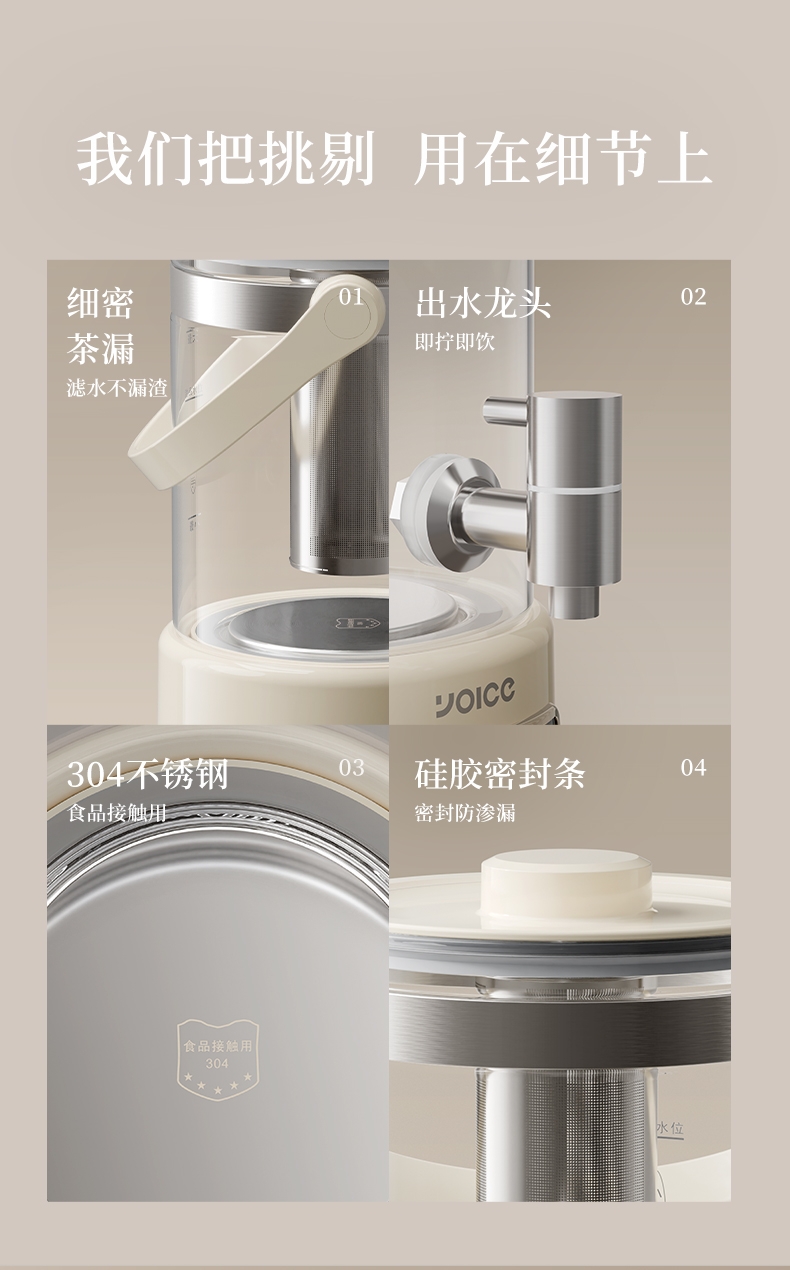 .高硼硅玻璃壶身,健康有保障;2.5L大容量,可满足家庭需求;智能温控器,安全防溢防干烧;壶体设置水龙头,取水方便;智能操控面板,分体式设计,方便加水、清洗