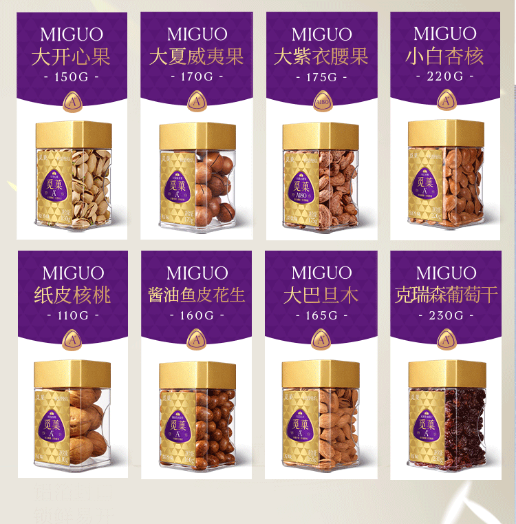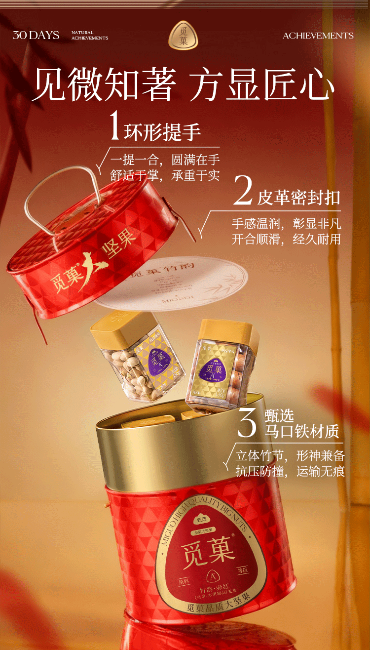 双层设计, 美观大气;八款产品内配, 一盒尽享山河味;坚果独有的口感和香气,让您回味无穷