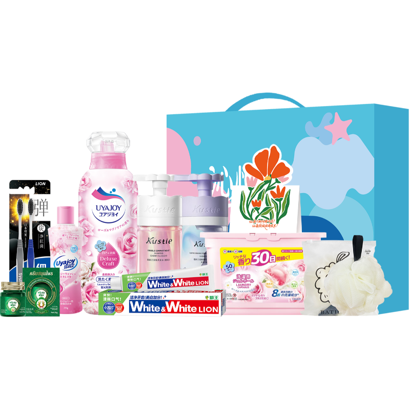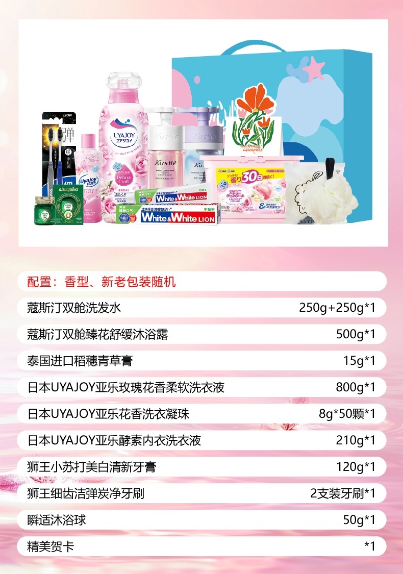 配置清单:蔻斯汀双舱洗发水250g+250g*1 蔻斯汀双舱臻花舒缓沐浴露500g*1 泰国进口稻穗青草膏15g*1 日本UYAJOY亚乐玫瑰花香柔软洗衣液800g*1 日本UYAJOY亚乐花香洗衣凝珠8g*50颗*1 日本UYAJOY亚乐酵素内衣洗衣液210g*1 狮王(Lion)小苏打美白清新牙膏120g*1狮王(lion)细齿洁弹炭净牙刷2支装牙刷*1 Sunshey瞬适绵润焕肤沐浴球*1 精美贺卡*1 沁悦星享礼盒ZS228*1