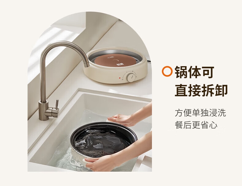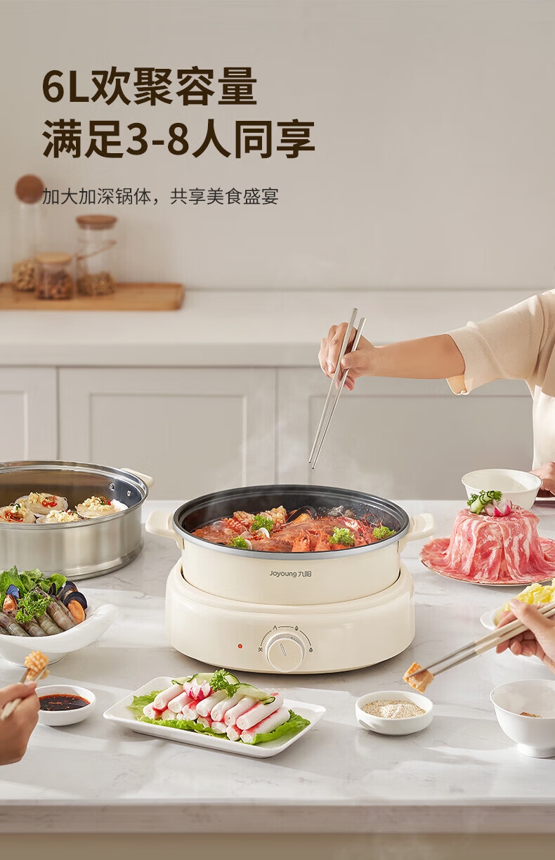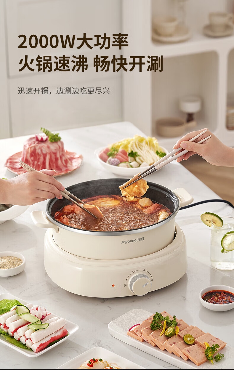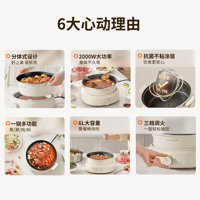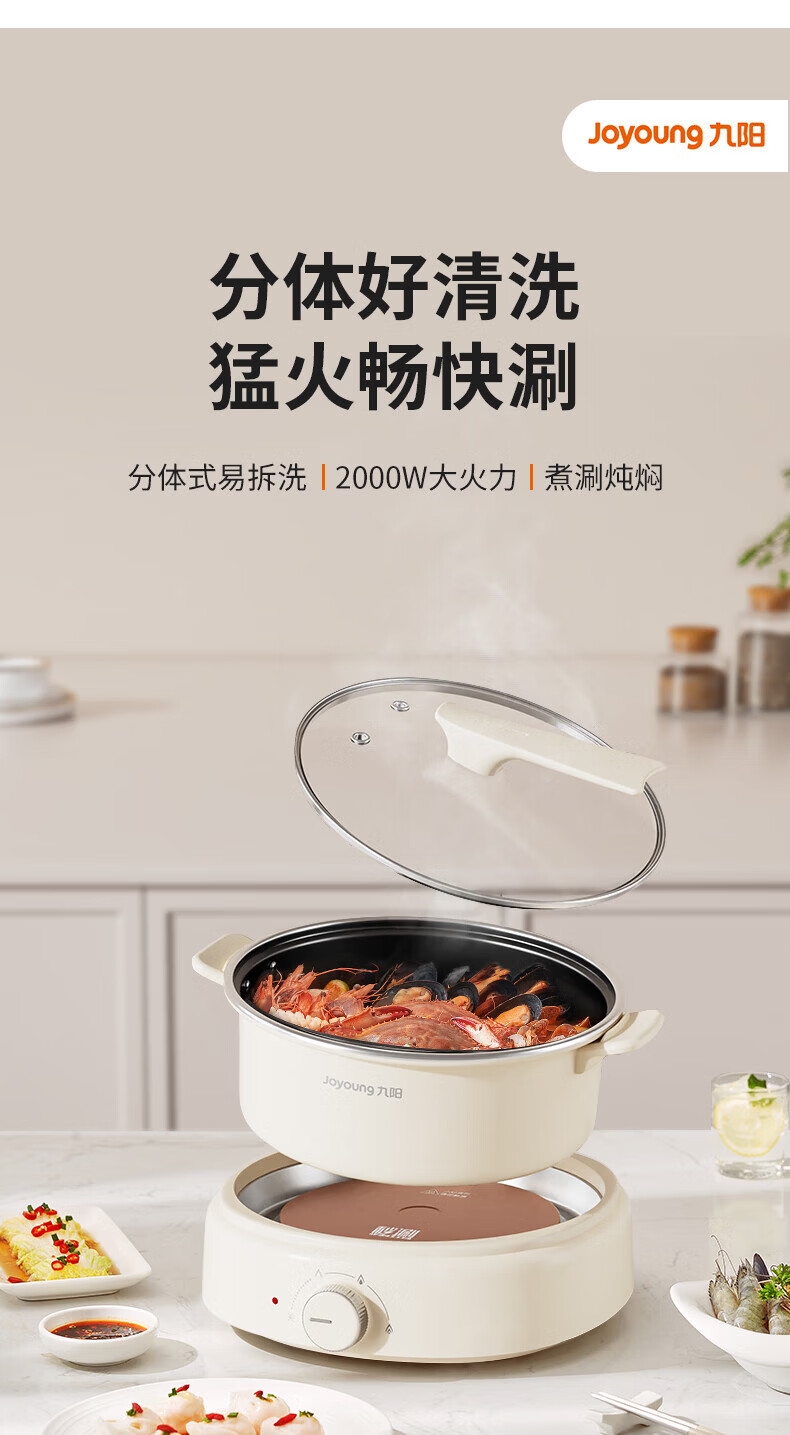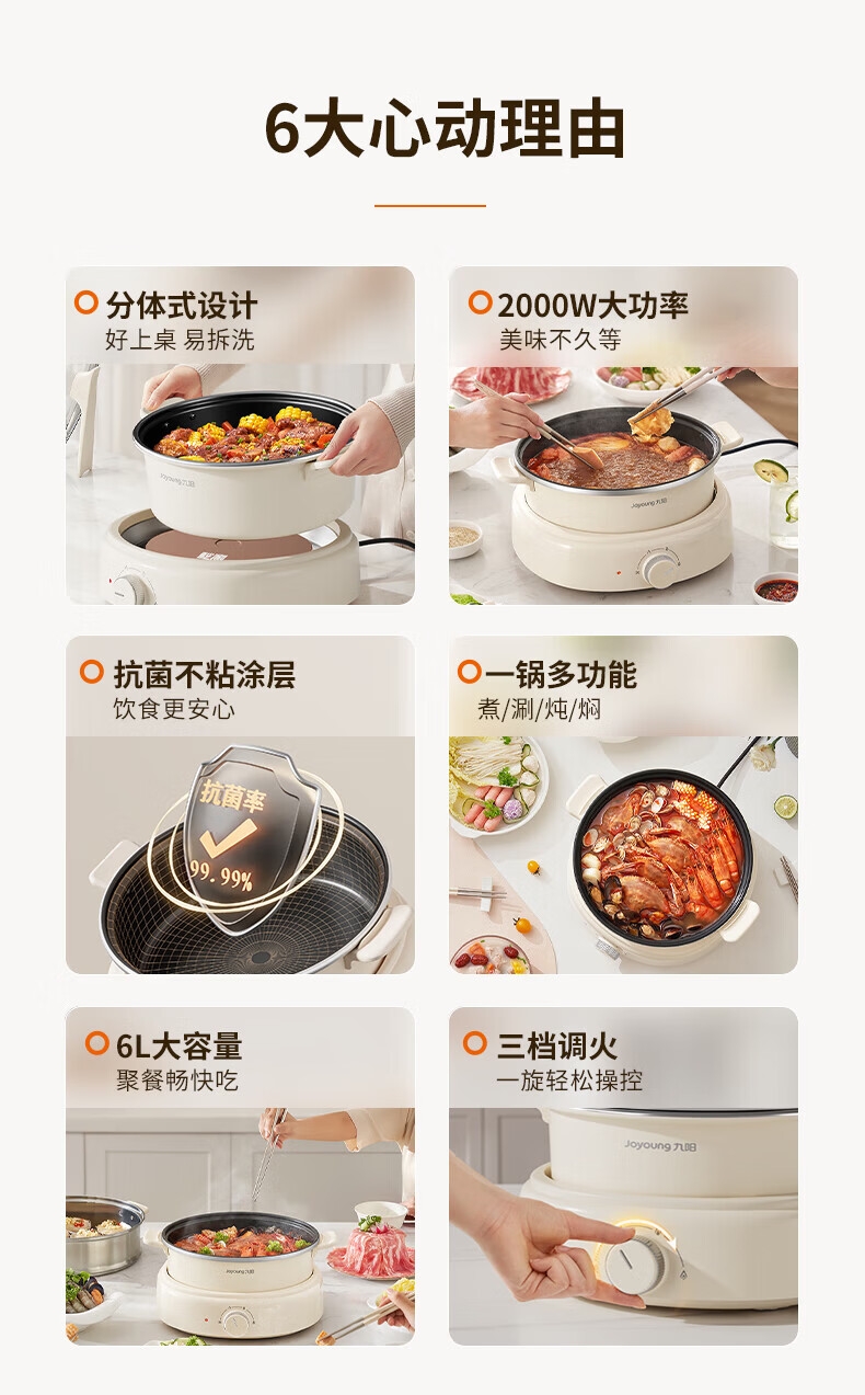 2000W秒涮猛火,开锅不久等;6升大容量,109mm深锅畅快涮;分体可拆好清洗,锅体可浸泡一冲即净