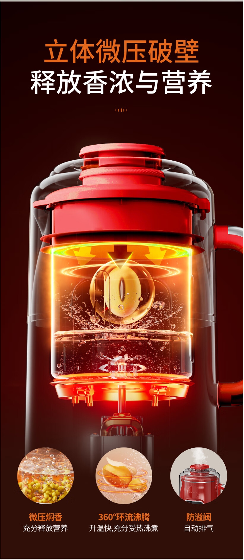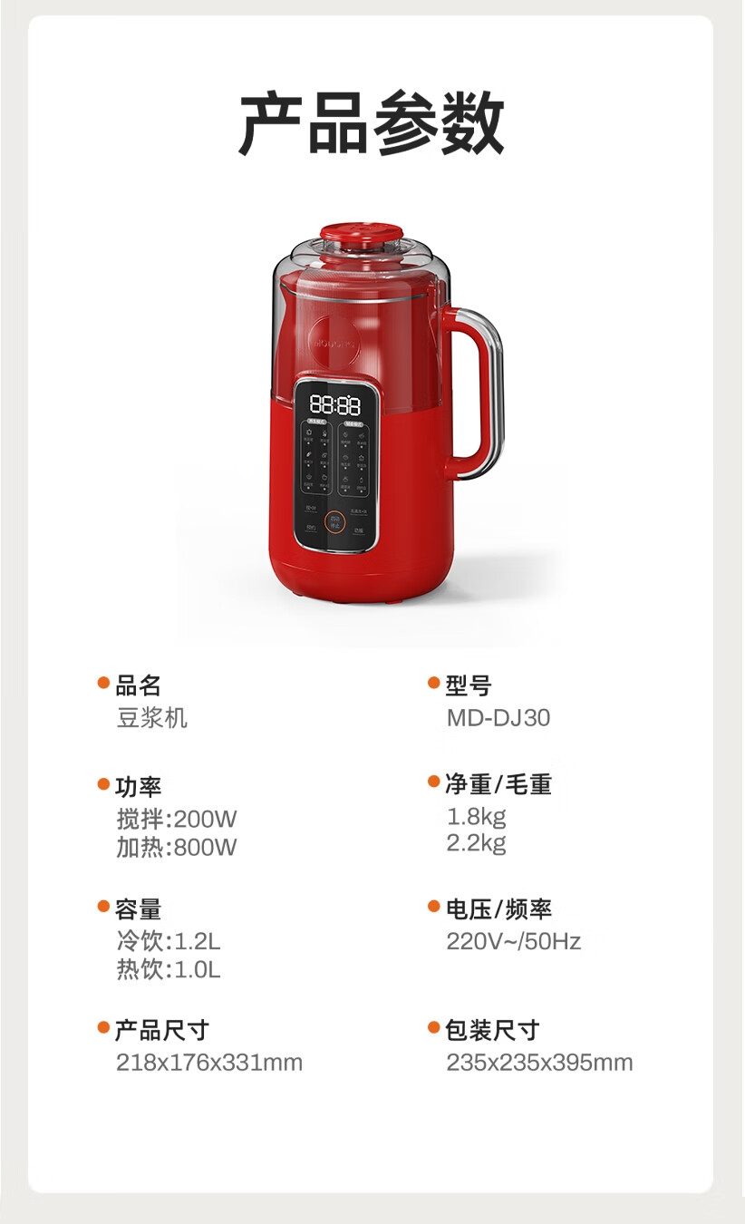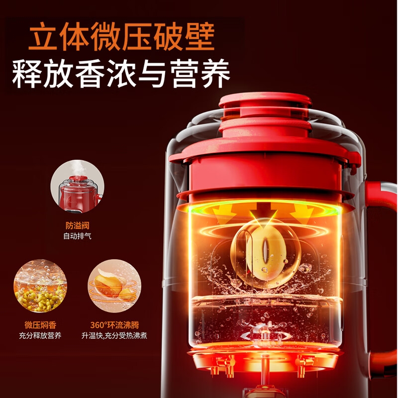 立体微压破壁360°匀热软化豆芯,豆浆口感更香浓细;外置防护隔音仓告别装修式破壁,早晚搅打不扰人;24H智能预约自动保温8小时,低温定频搅打