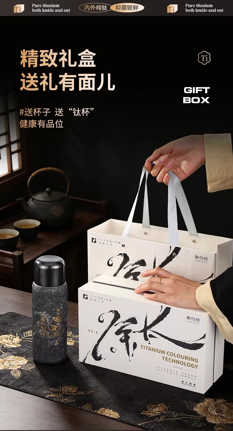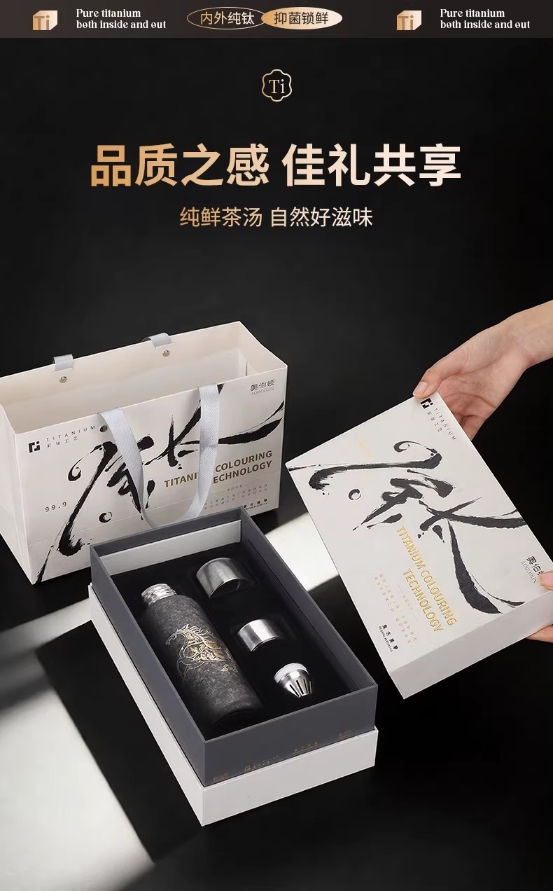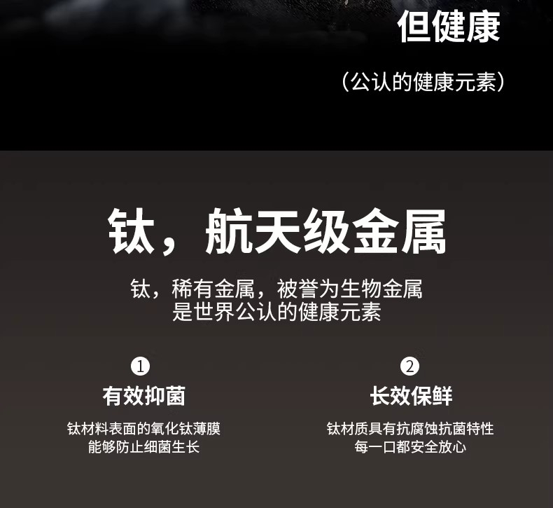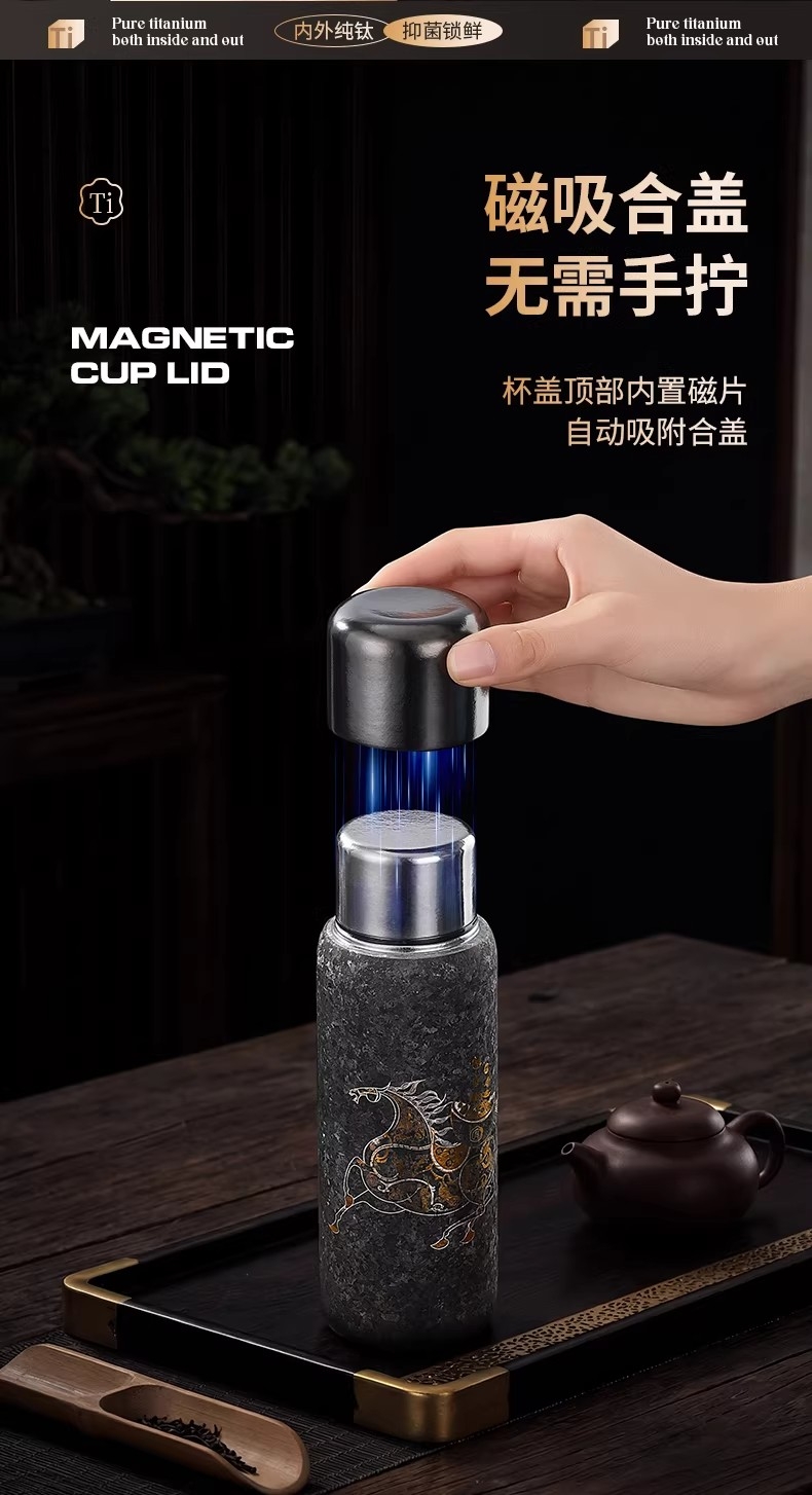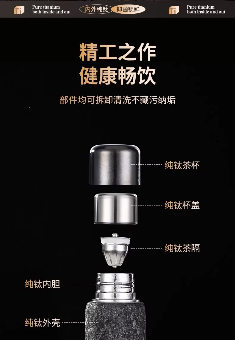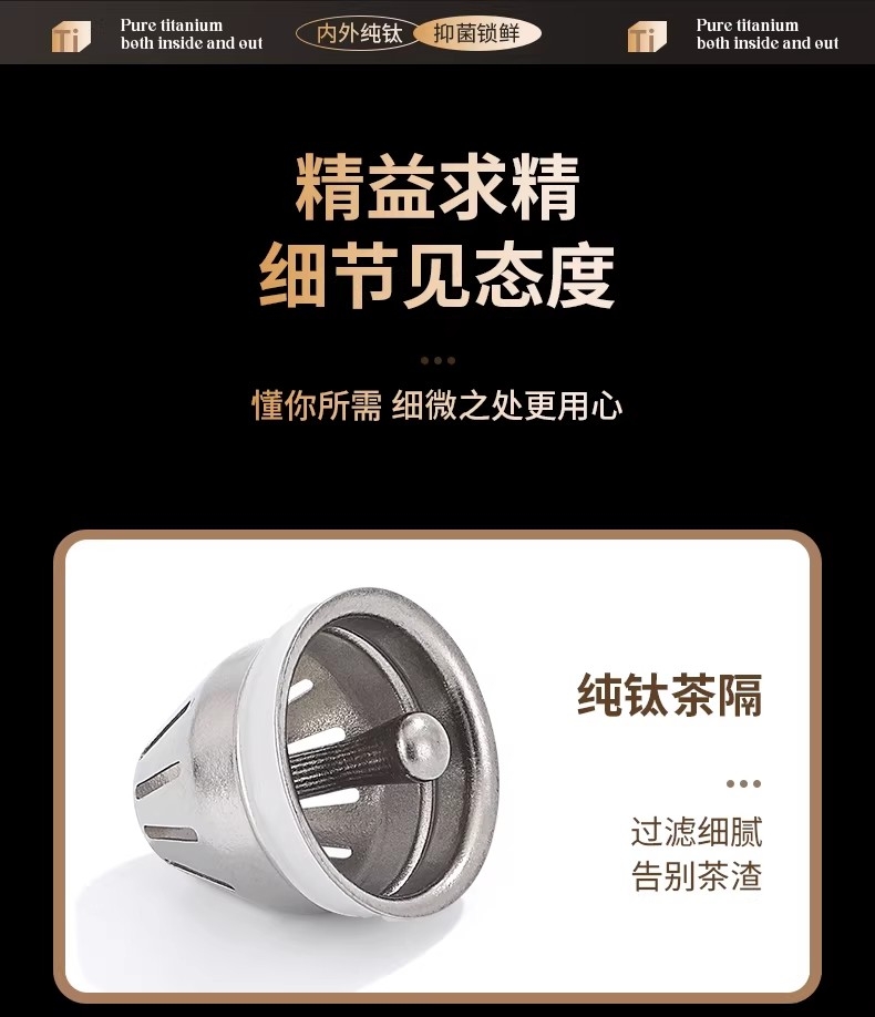 有效抑菌 钛材料表面的氧化钛薄膜能够防止细菌生长;纯钛金属耐酸碱不影响饮品本身风味与性质;彩钛工艺历经高温涅槃 Ti 不含喷漆,纯粹健康;纯钛茶隔喝茶不吐茶叶,自带茶隔 快速分离茶汤;双层全钛磁吸盖,一盖两用不易烫手,细品慢饮