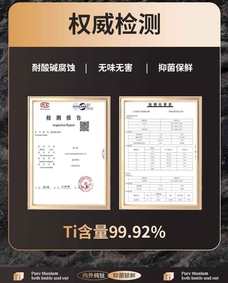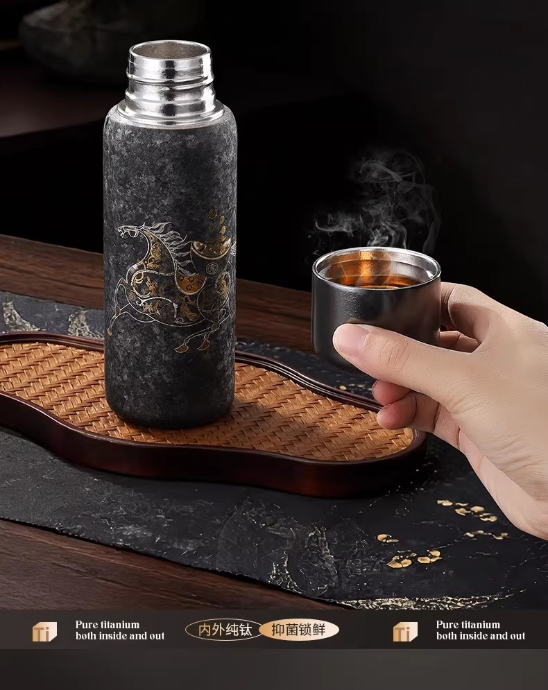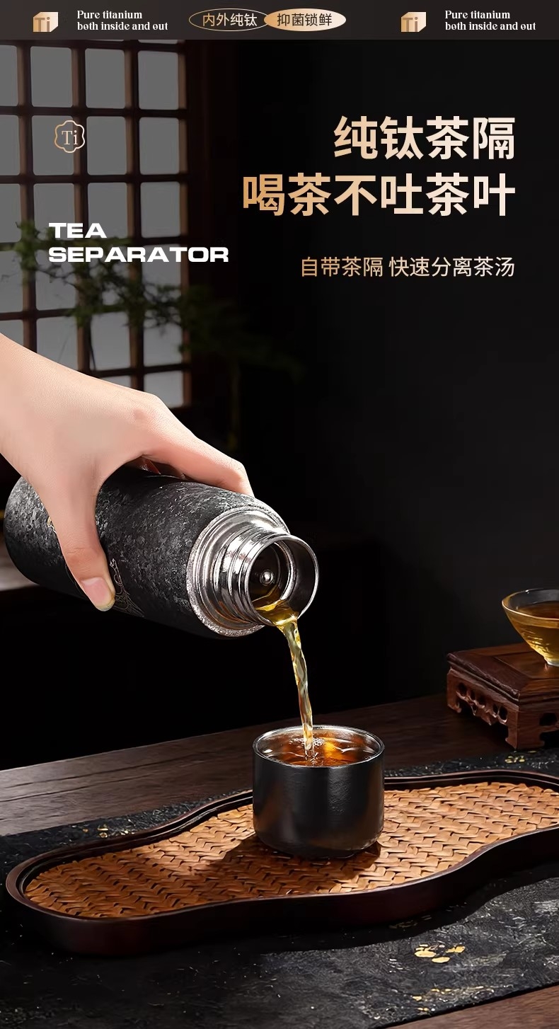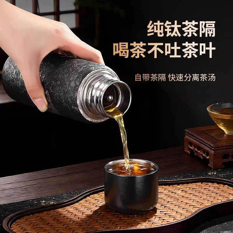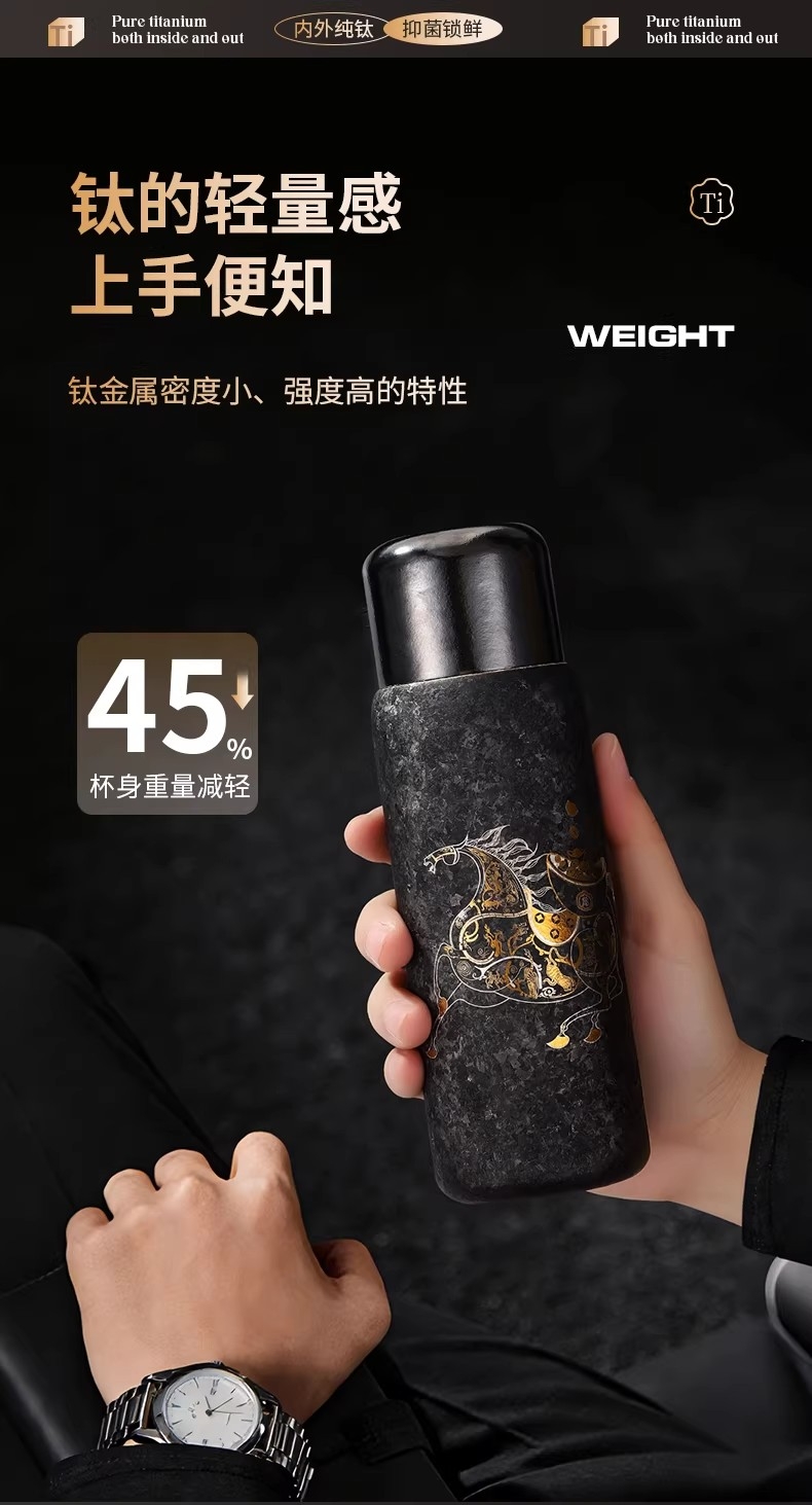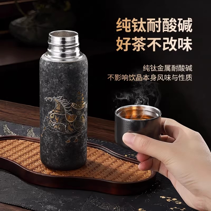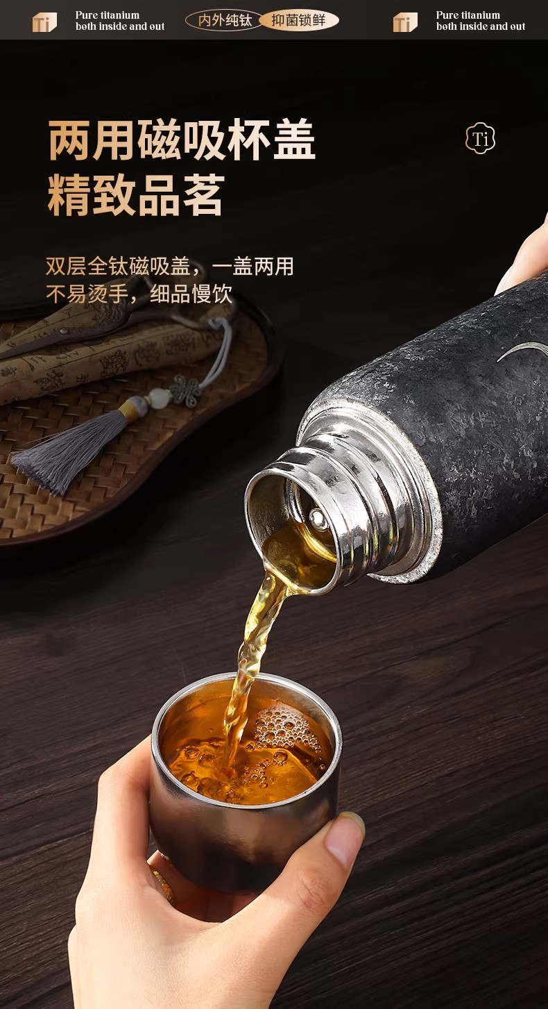 有效抑菌 钛材料表面的氧化钛薄膜能够防止细菌生长;纯钛金属耐酸碱不影响饮品本身风味与性质;彩钛工艺历经高温涅槃 Ti 不含喷漆,纯粹健康;纯钛茶隔喝茶不吐茶叶,自带茶隔 快速分离茶汤;双层全钛磁吸盖,一盖两用不易烫手,细品慢饮