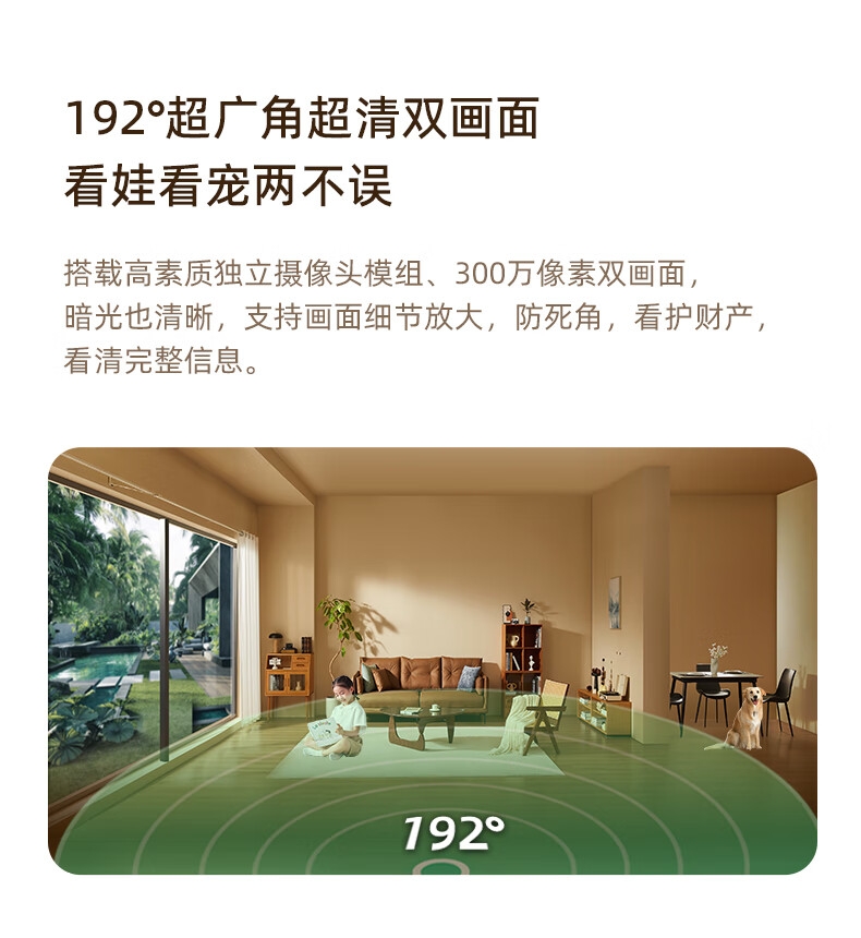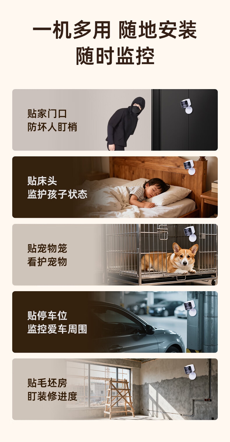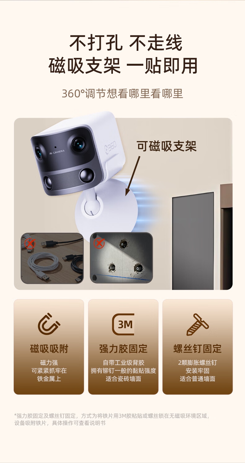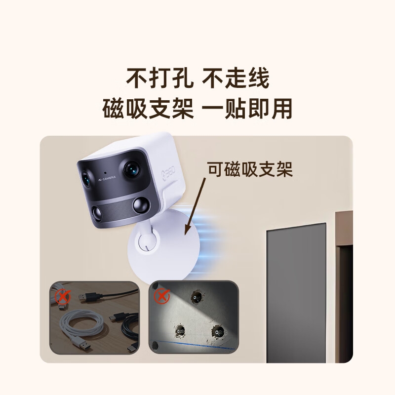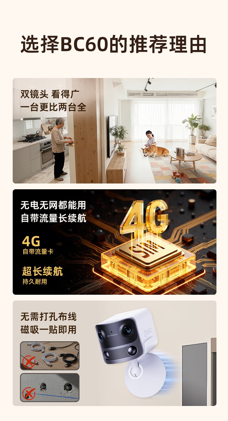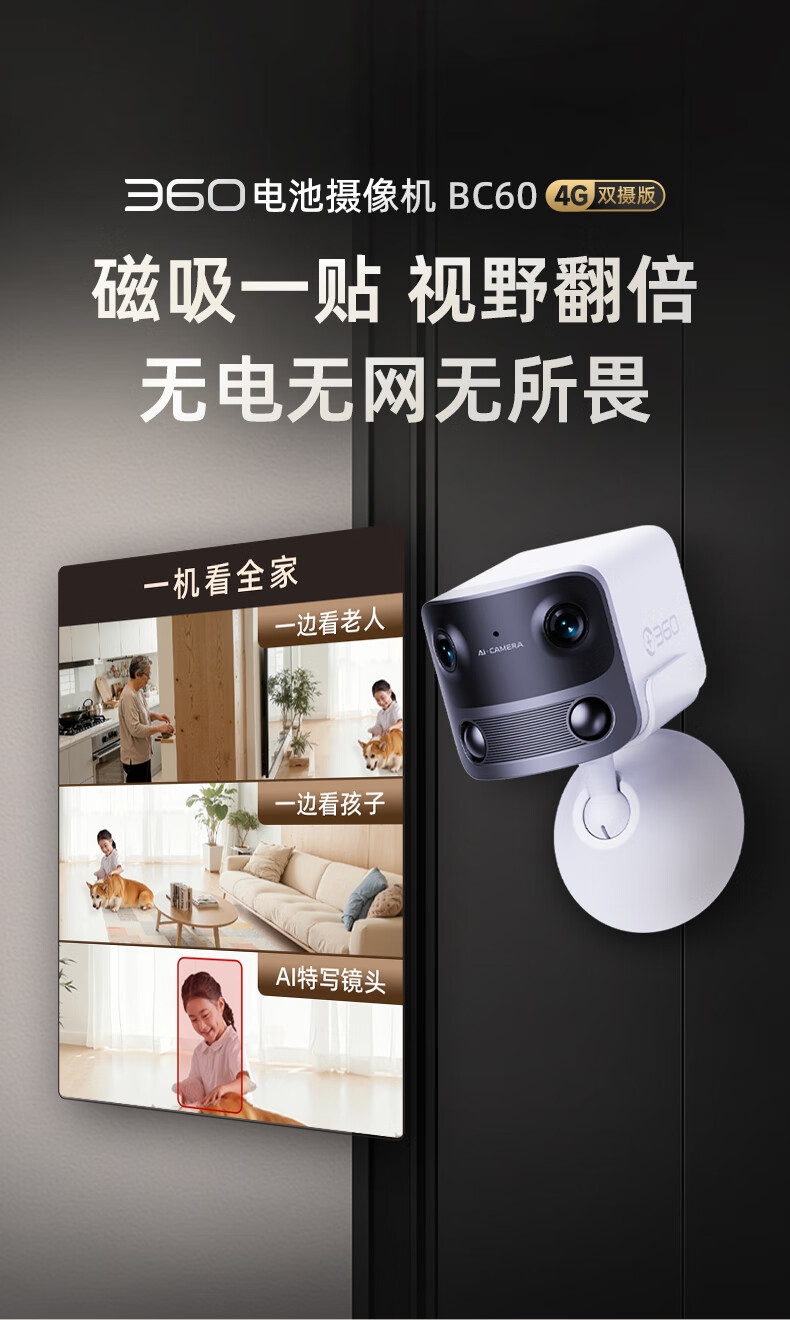 双镜头,看的广,无电无网都能用,自带流量长续航。;一机多用,随地安装,随时监控。;不打孔,不走线,磁吸支架一贴即用,