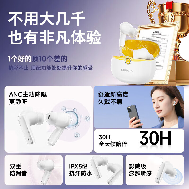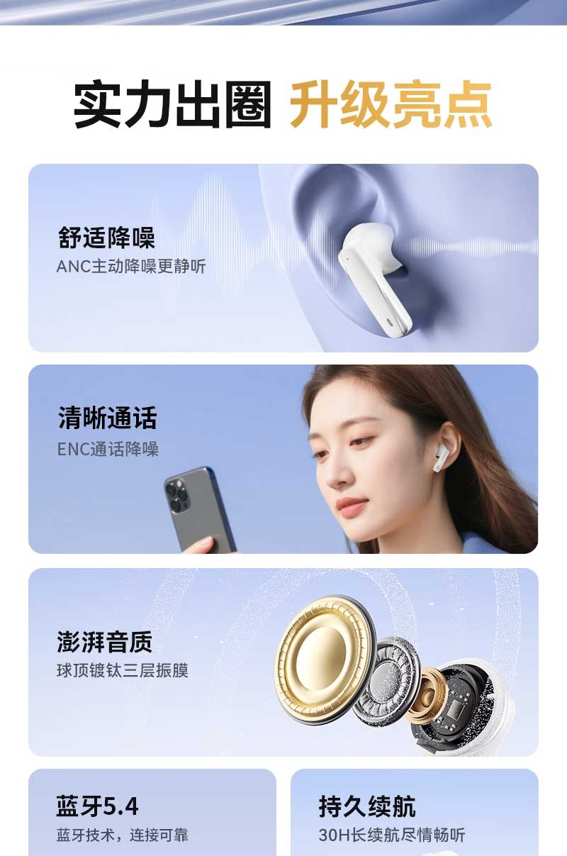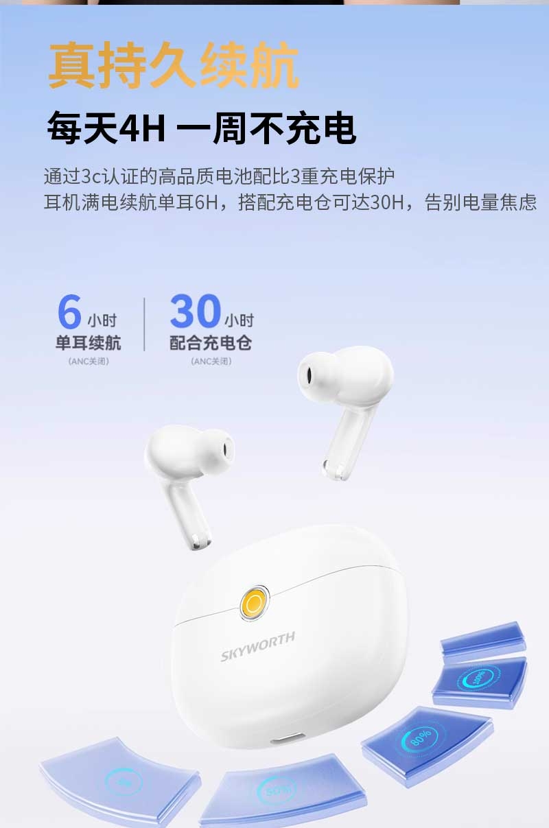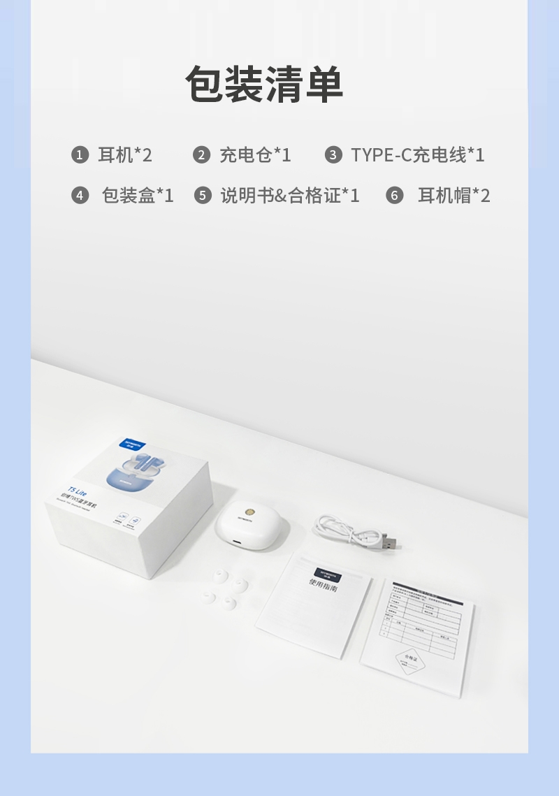 配置清单:耳机× 1、充电线× 1、替换耳帽 × 2对、说明书 × 1