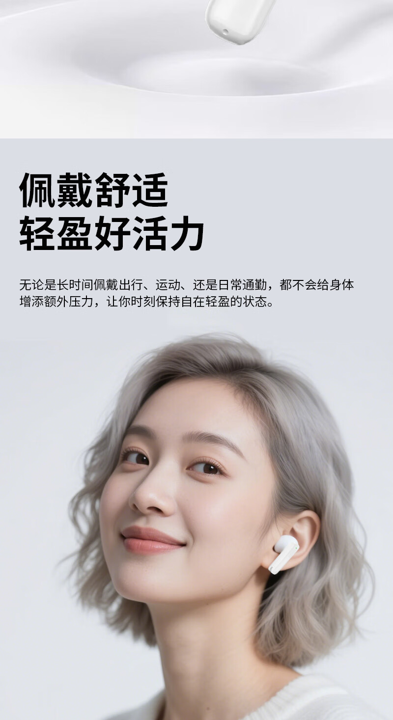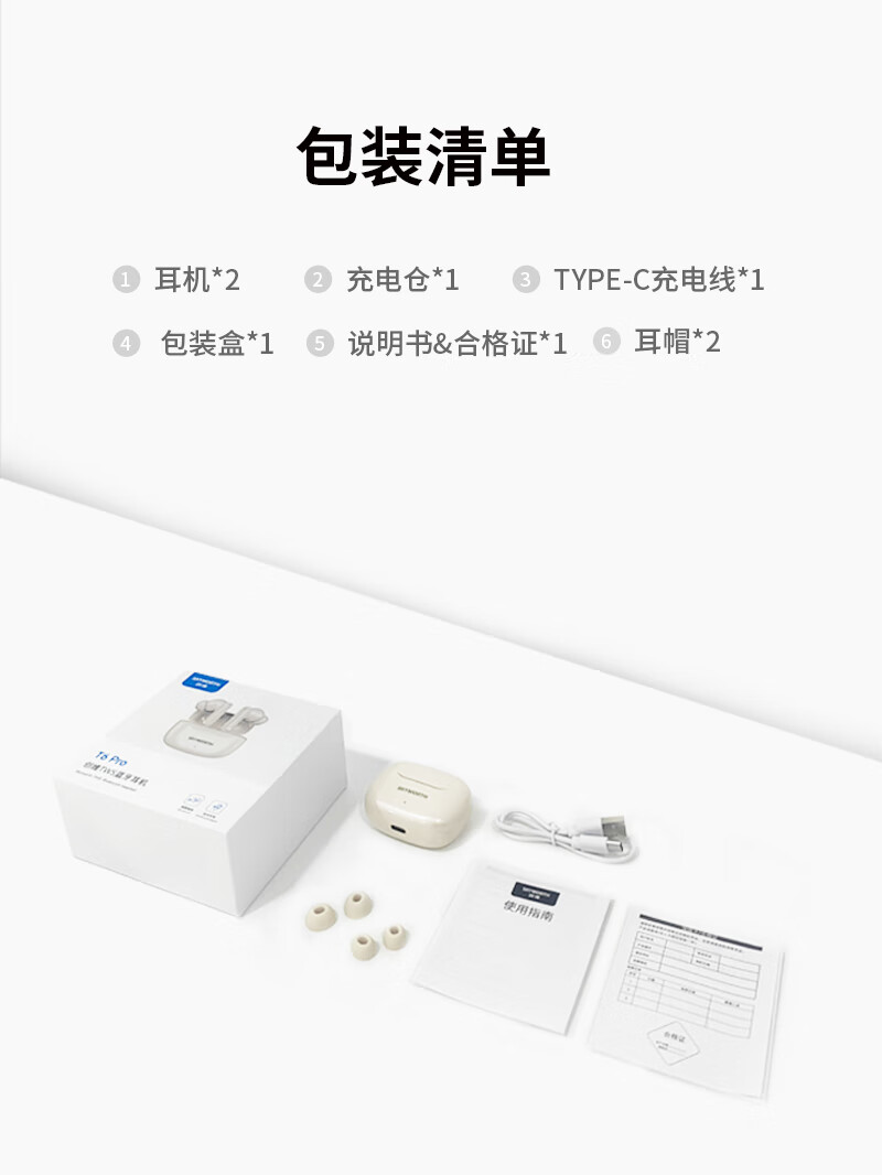 配置清单:耳机× 1、充电线× 1、替换耳帽 × 2对、说明书 × 1