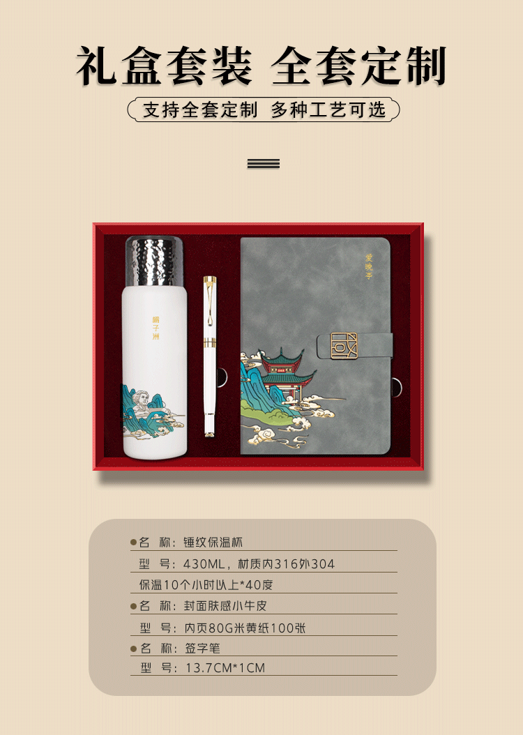 配置清单:316不锈钢保温杯*1,金属签字本*·1,100克100张加厚笔记本*1,礼盒礼袋*1