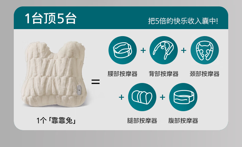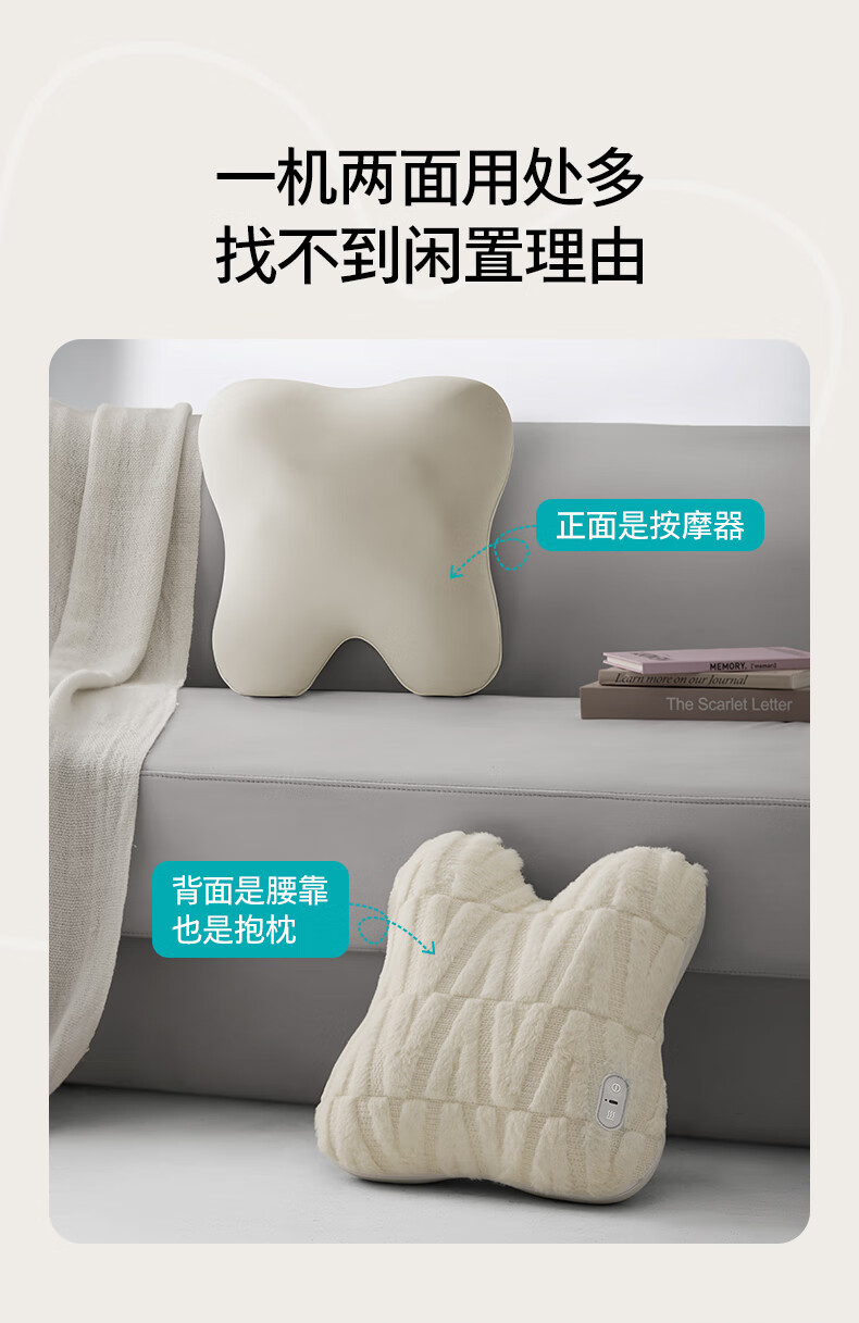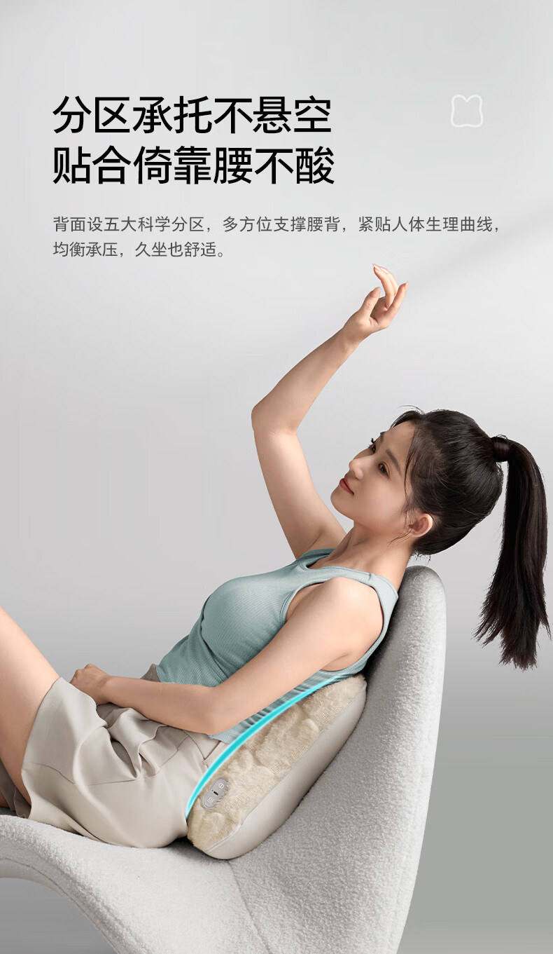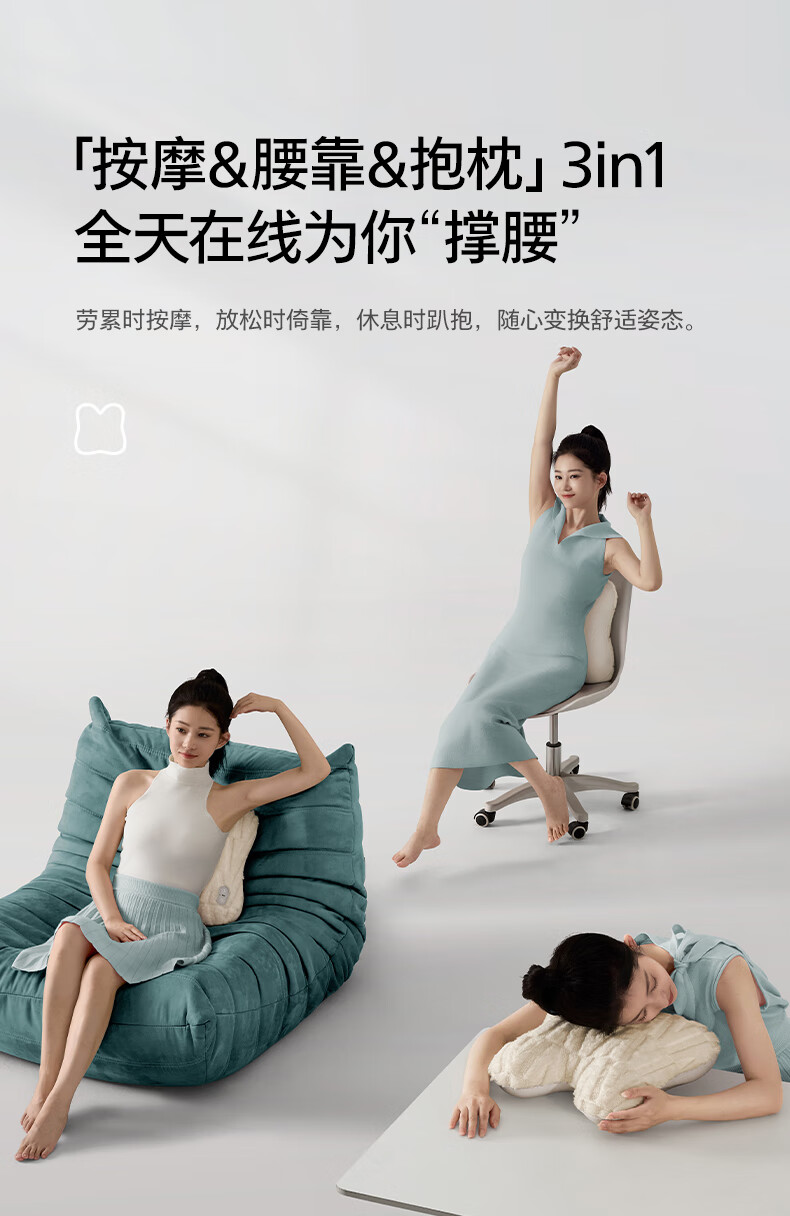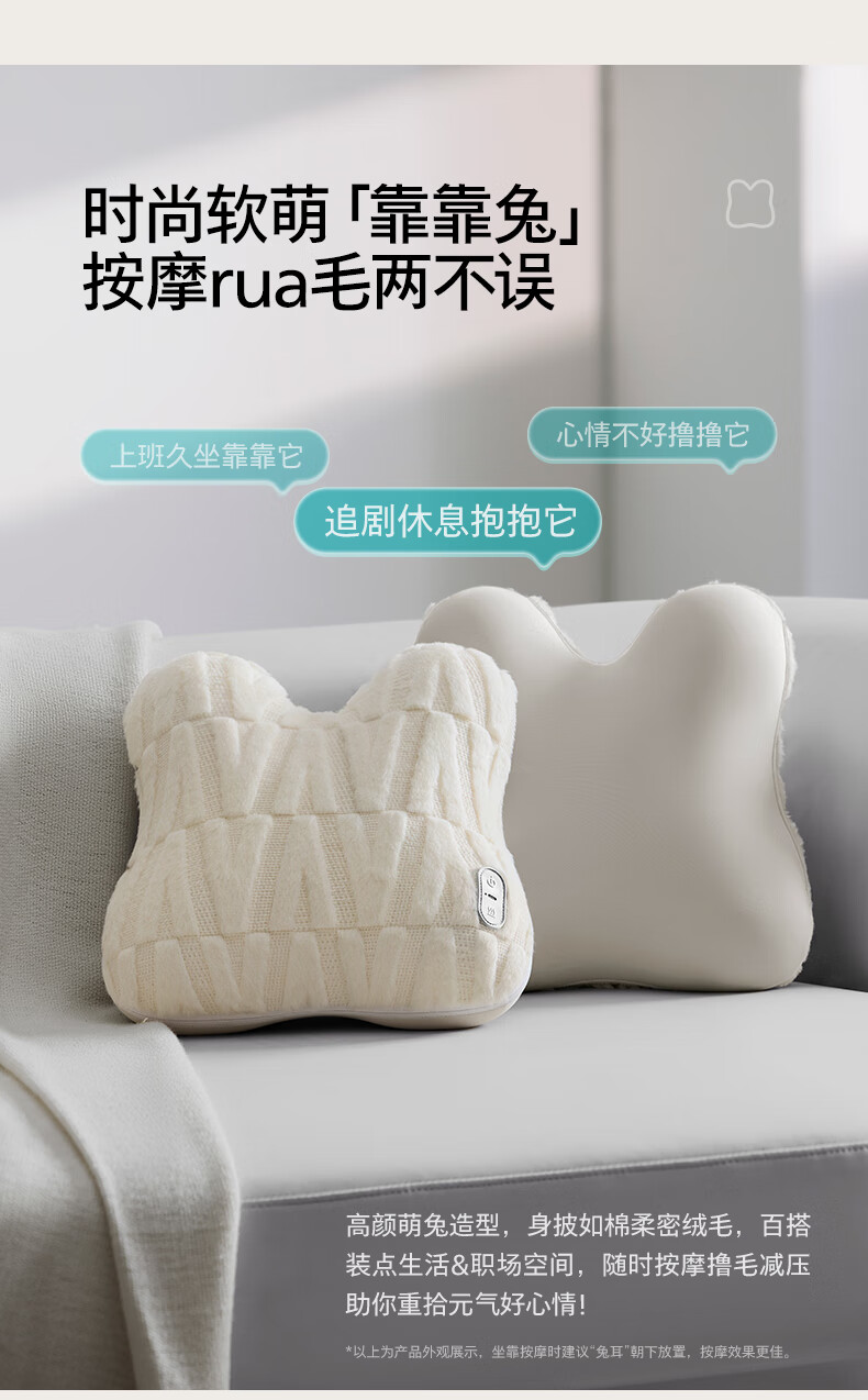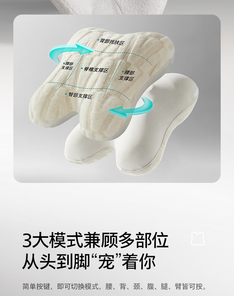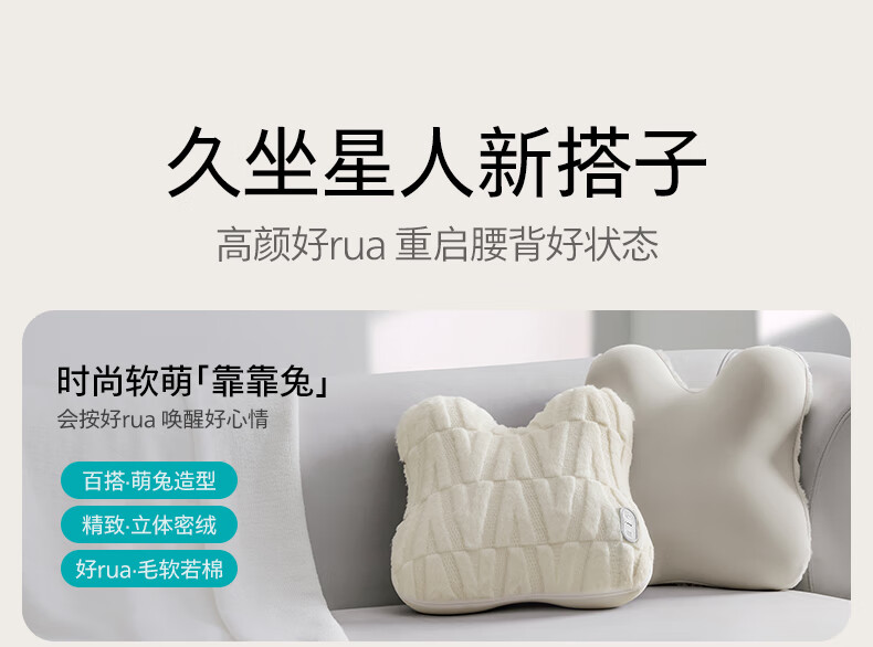 仿生“兔掌”按摩头还原掌揉x指压多手法 ;按摩&腰靠&抱枕3in1 一机两面多用不闲置;云感慢回弹记忆棉 自适应紧贴承托腰背;分区承托不悬空贴合倚靠腰不酸;1台顶5台 5倍的快乐收入囊中! 2000mAh大