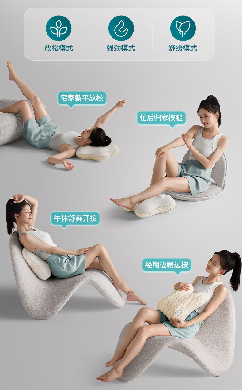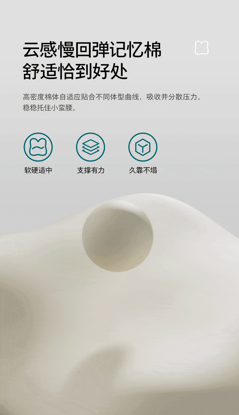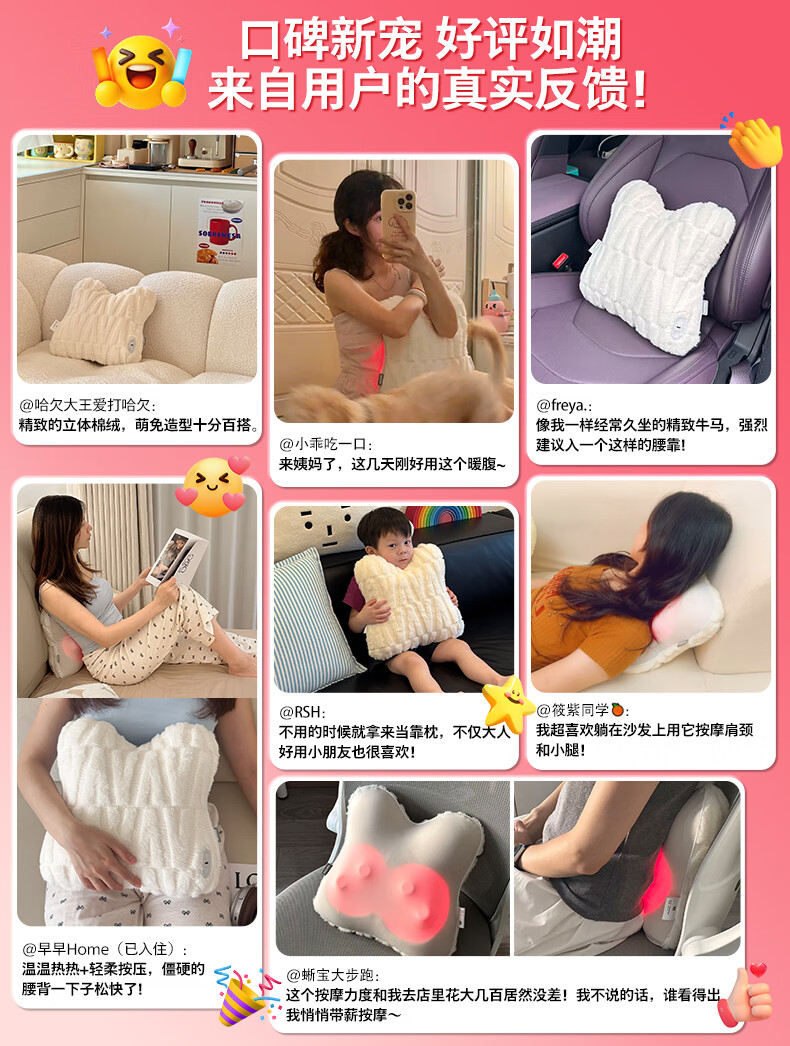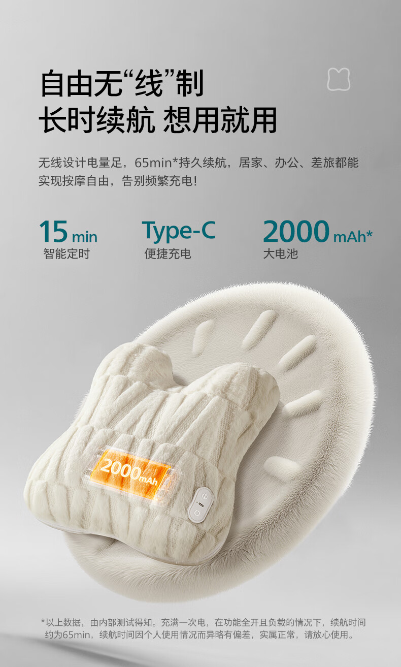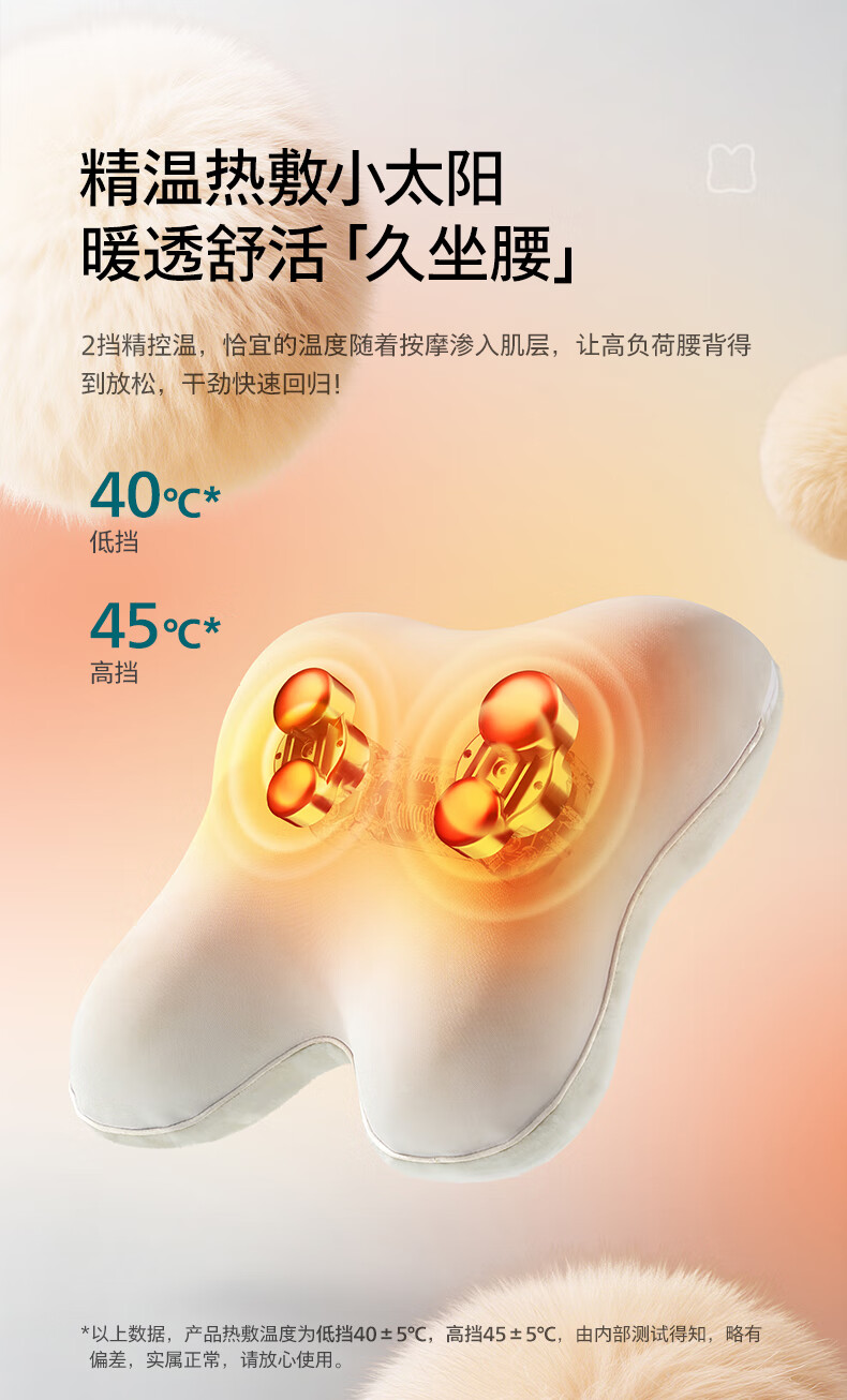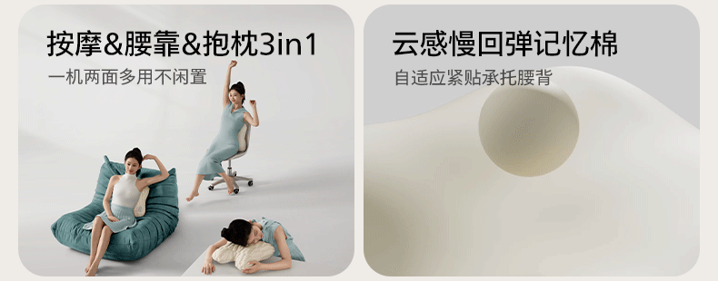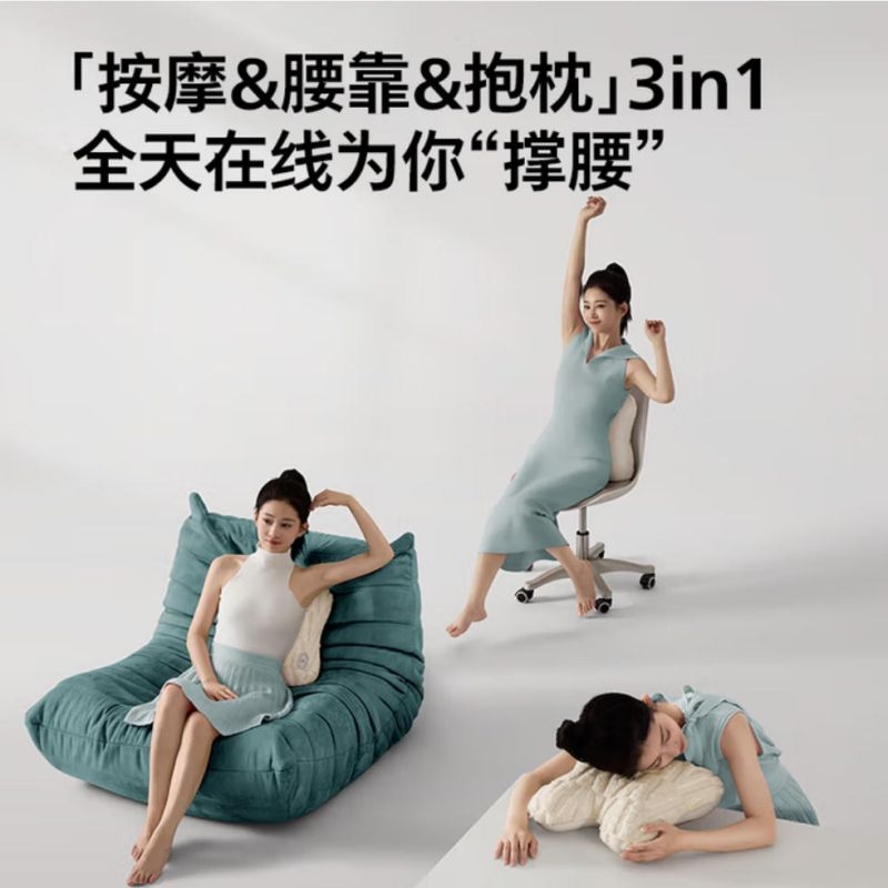 仿生“兔掌”按摩头还原掌揉x指压多手法 ;按摩&腰靠&抱枕3in1 一机两面多用不闲置;云感慢回弹记忆棉 自适应紧贴承托腰背;分区承托不悬空贴合倚靠腰不酸;1台顶5台 5倍的快乐收入囊中! 2000mAh大