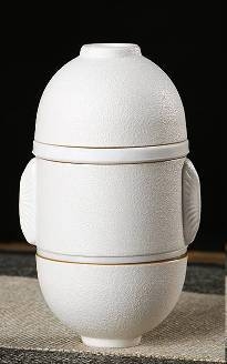 两个杯子可与壶上下重叠组合,茶隔也放置其中。;方便携带,简单实用。高雅时尚。简洁大方;表面有珍珠般细小颗粒,触感舒适。