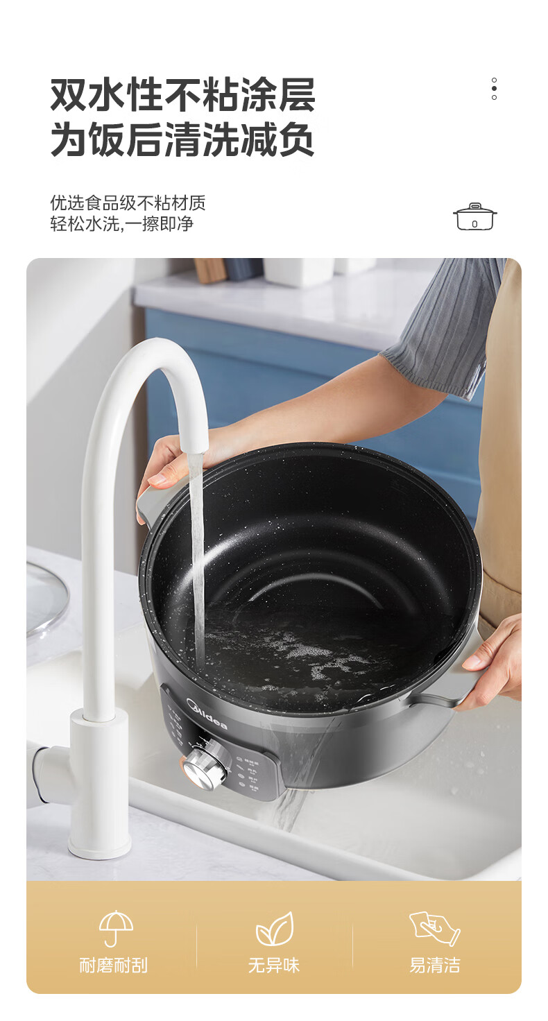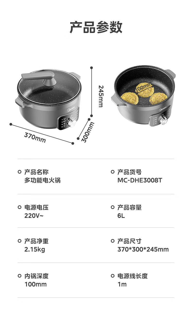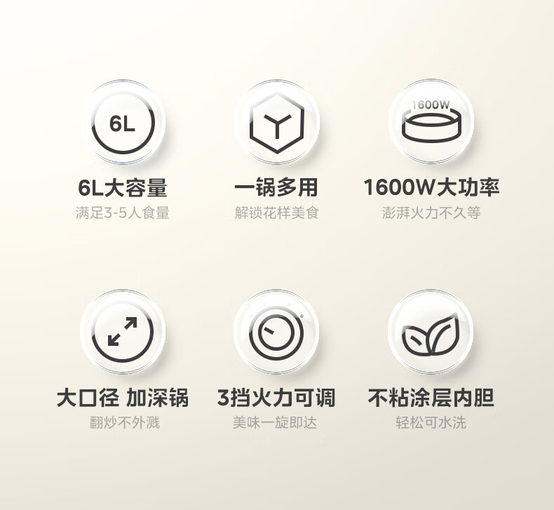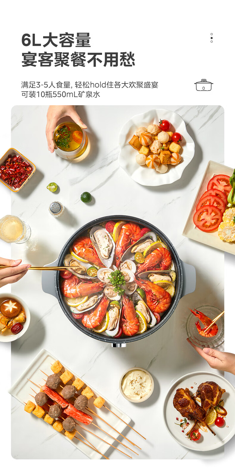 双水性不粘涂层,符合国家一级不粘标准;6L家庭享大容量,10cm加深锅;一米加长电源线,开吃不受“线”