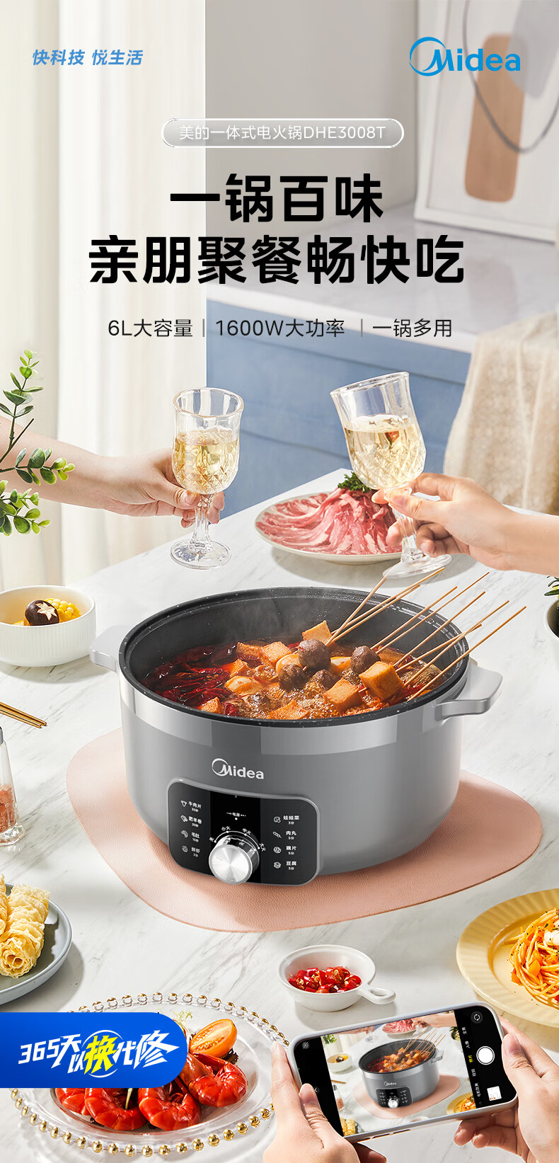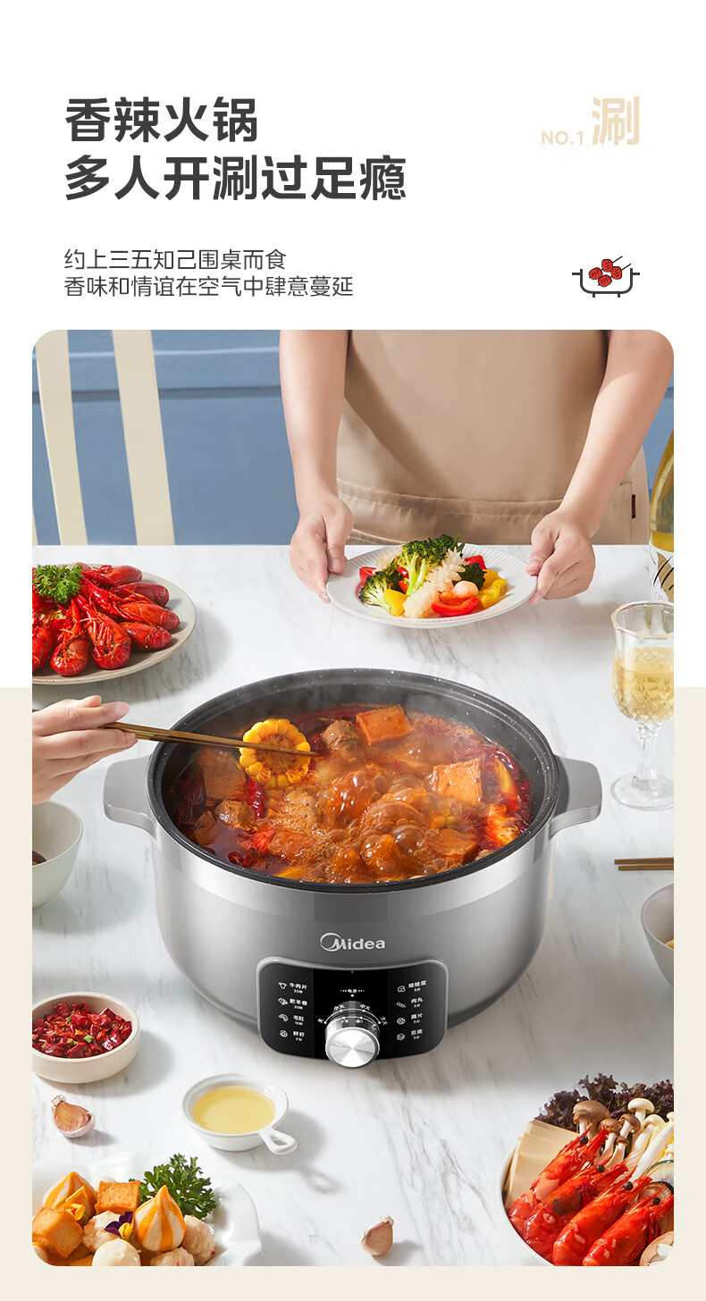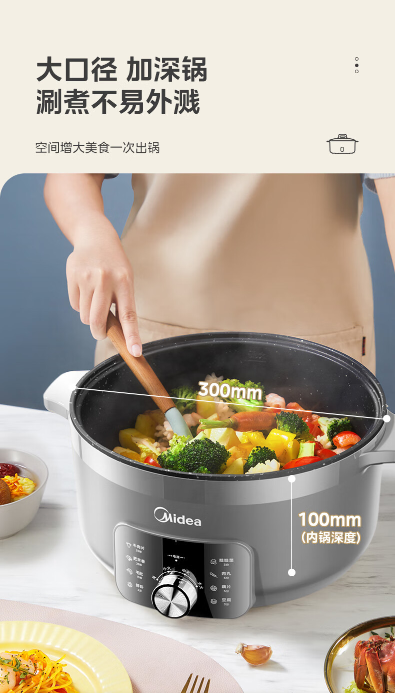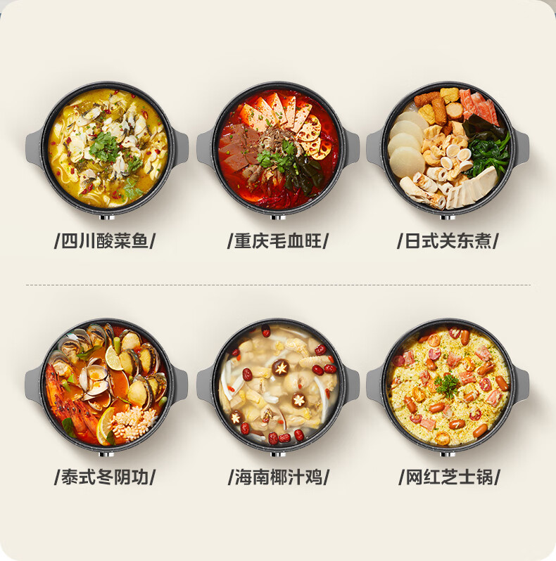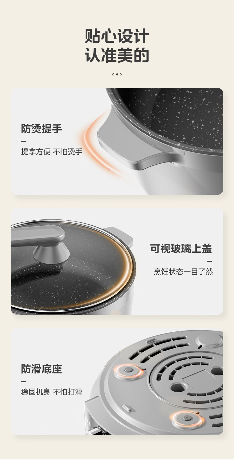 双水性不粘涂层,符合国家一级不粘标准;6L家庭享大容量,10cm加深锅;一米加长电源线,开吃不受“线”