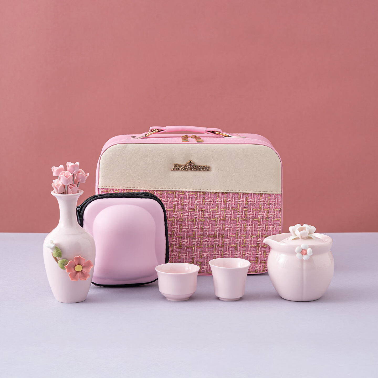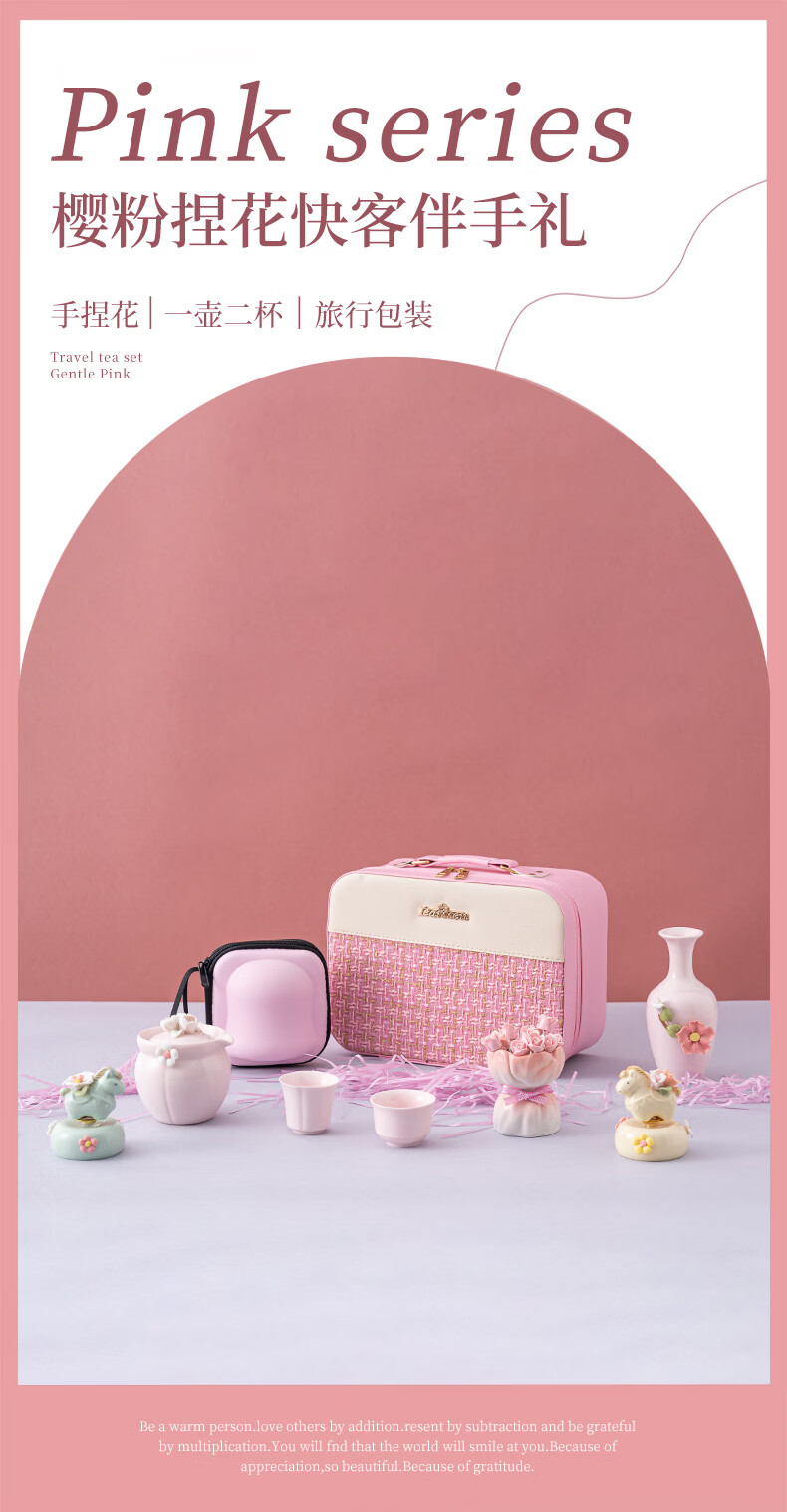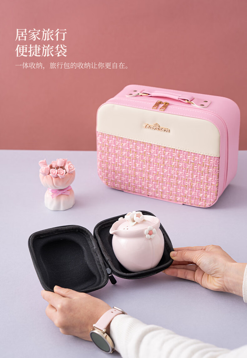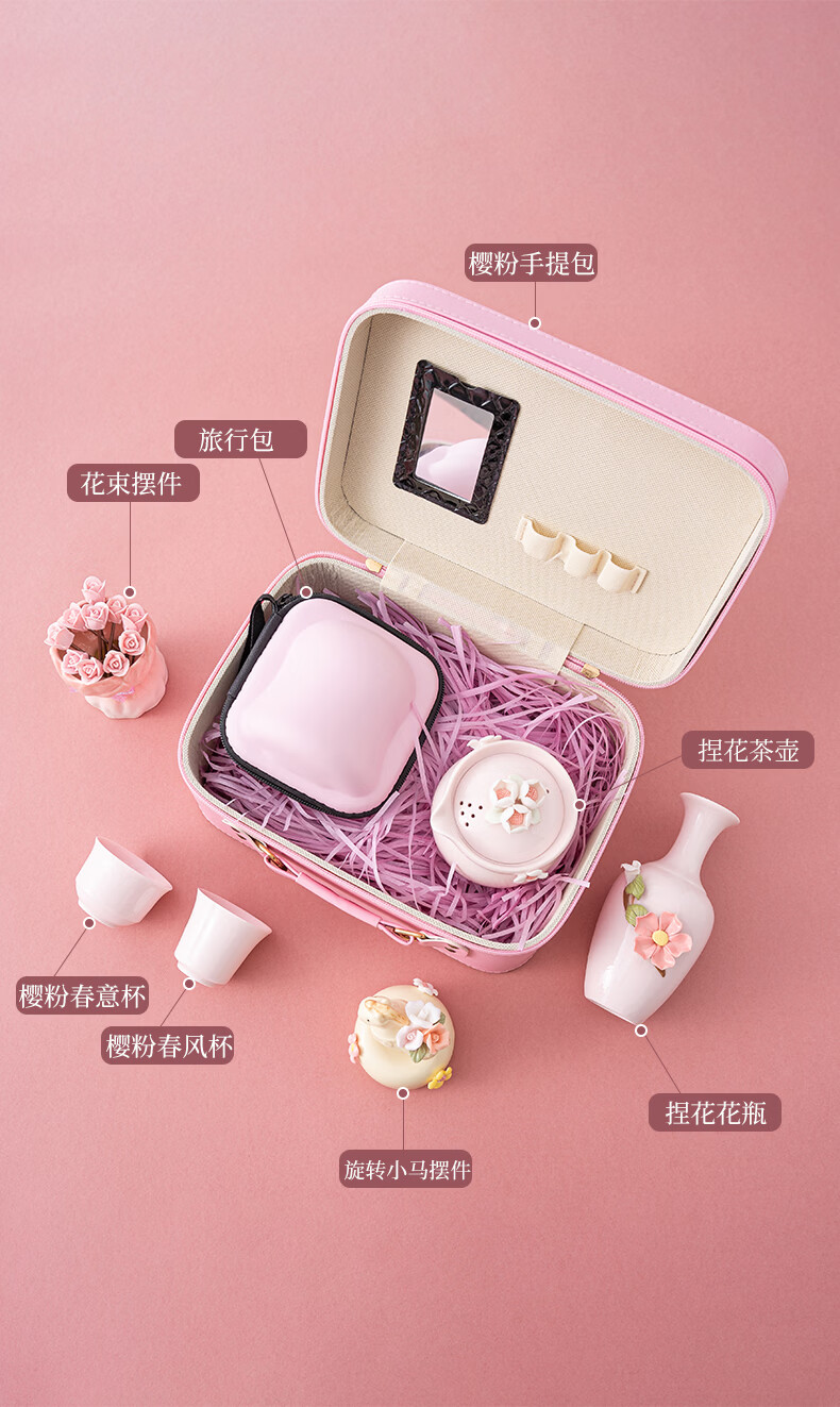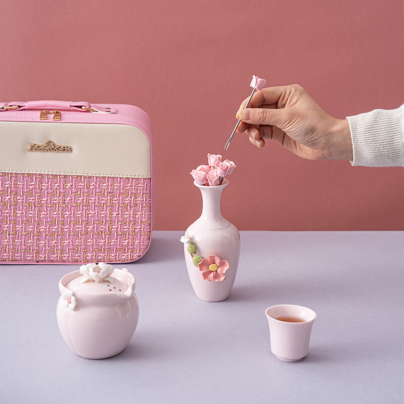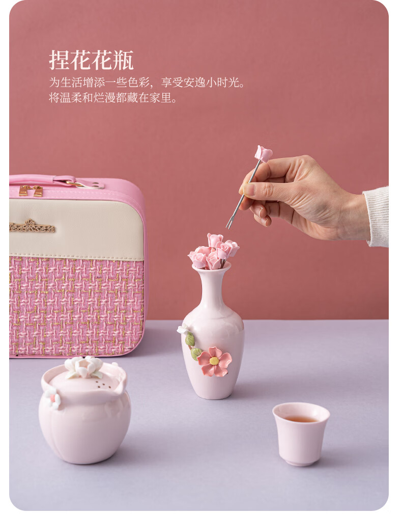 配置清单:一壶二杯 手工捏花美人花瓶 8支玫瑰水果叉 旅行包