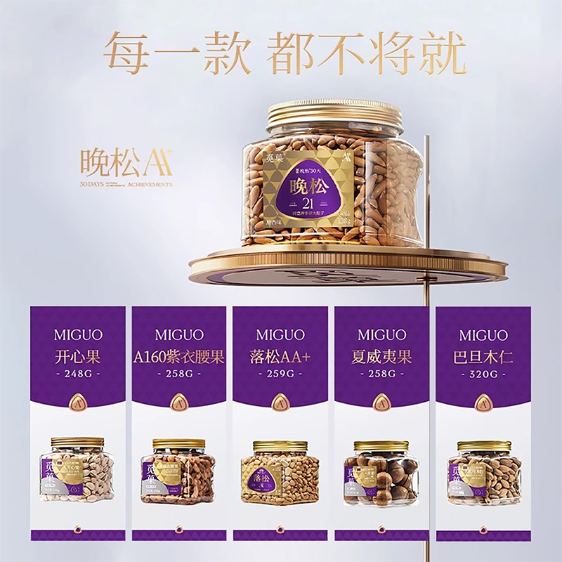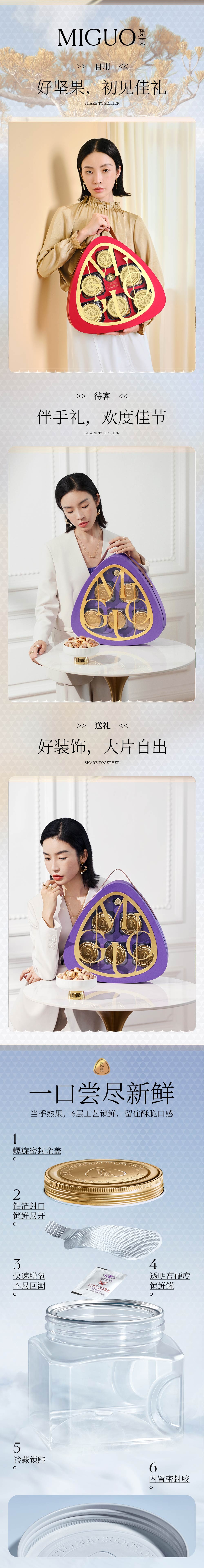 6罐纯坚果搭配合理营养美味,镂空设计品质坚果一目了;坚果独有的口感和香气,让您回味无穷;每一颗都经过精心挑选,保证新鲜和品质