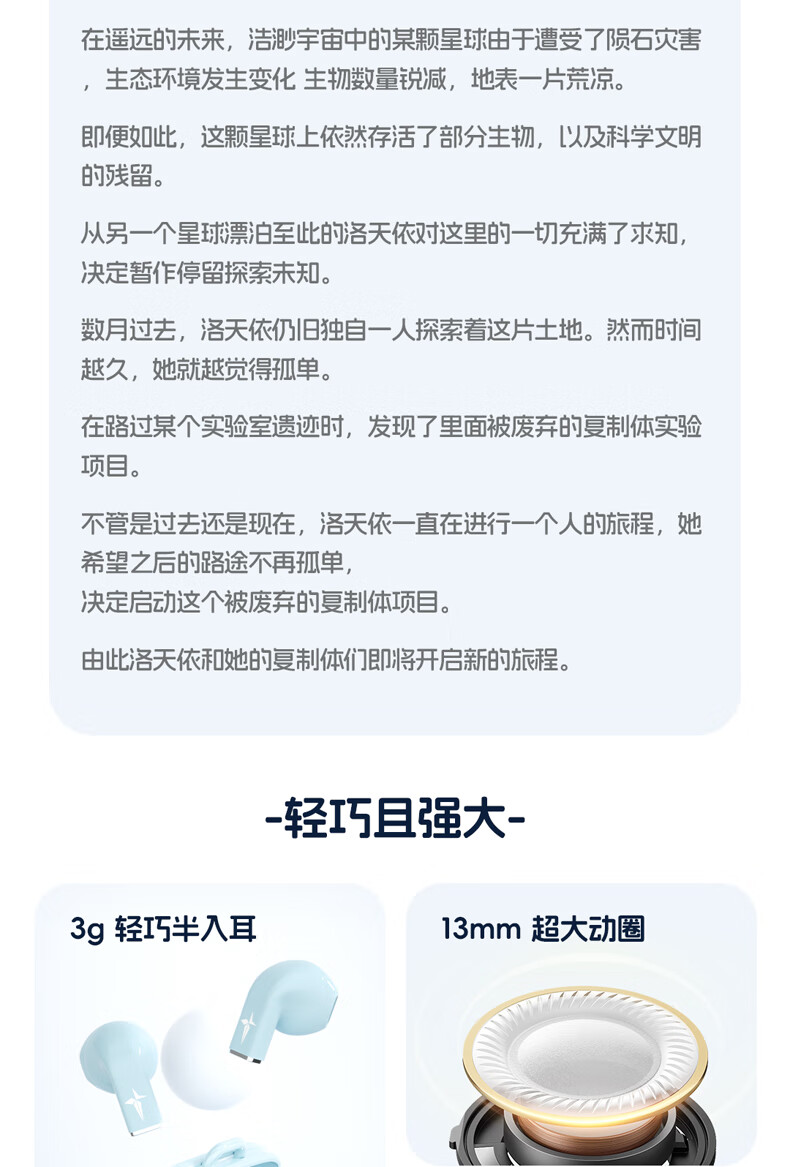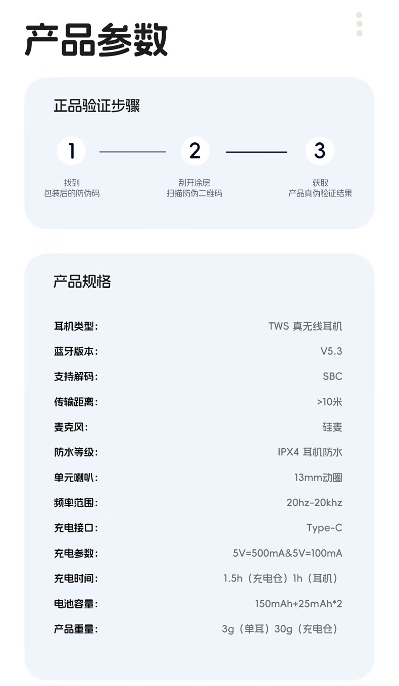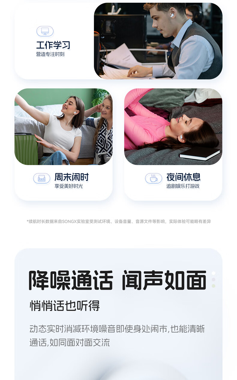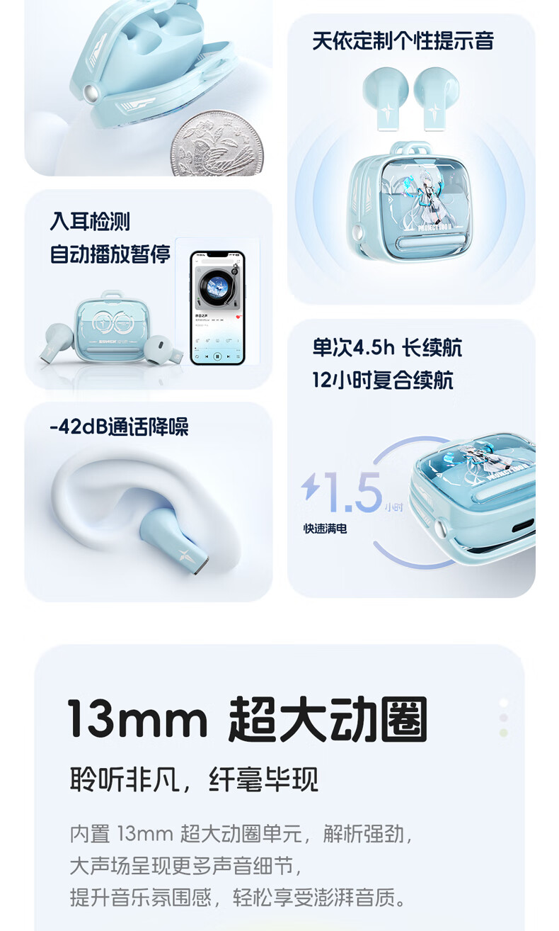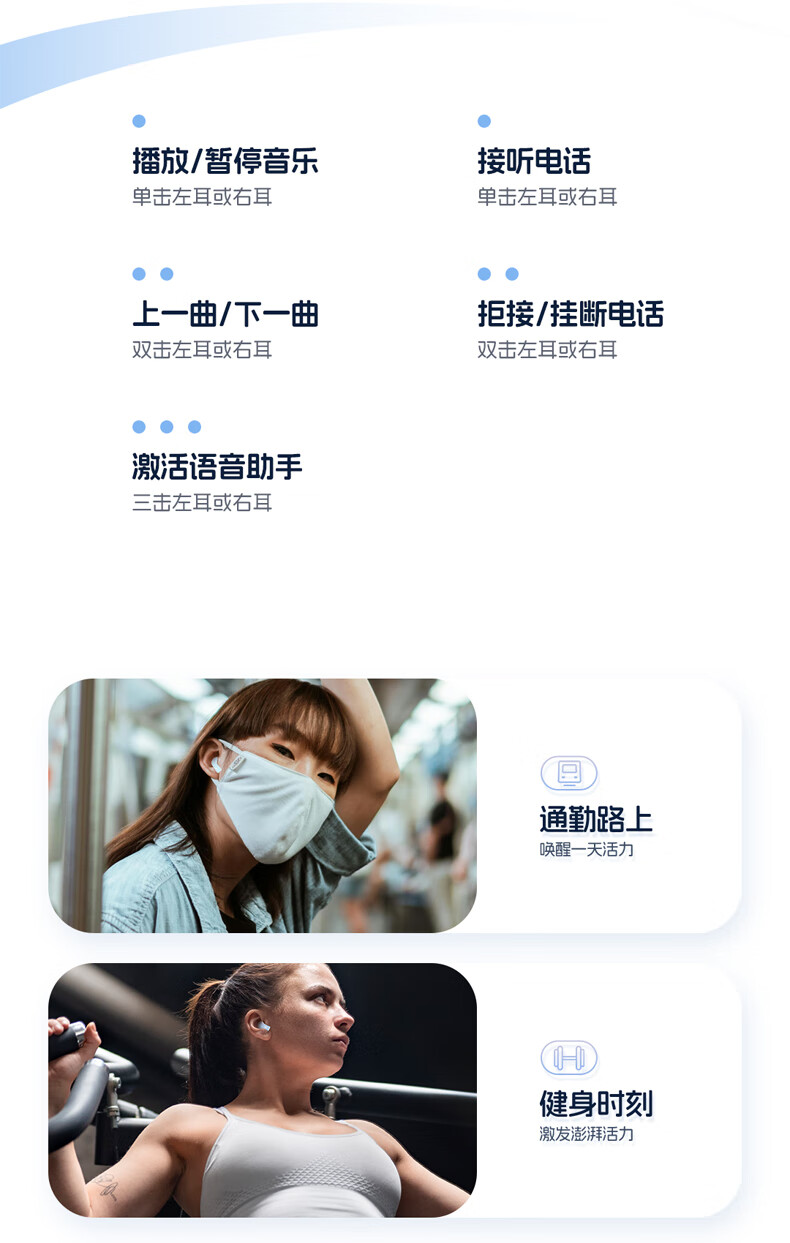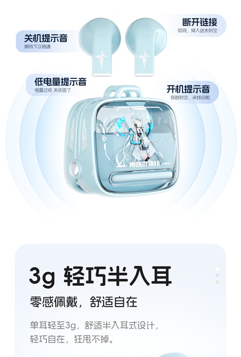 零感佩戴,舒适自在;单耳轻至3g,舒适半入耳式设计;开盖即连