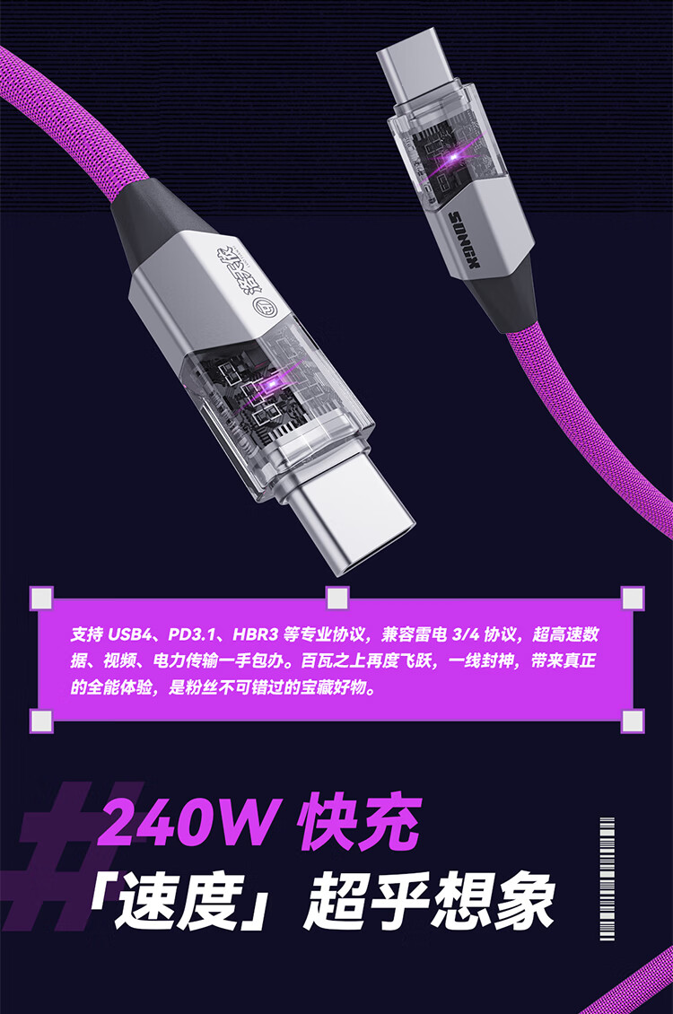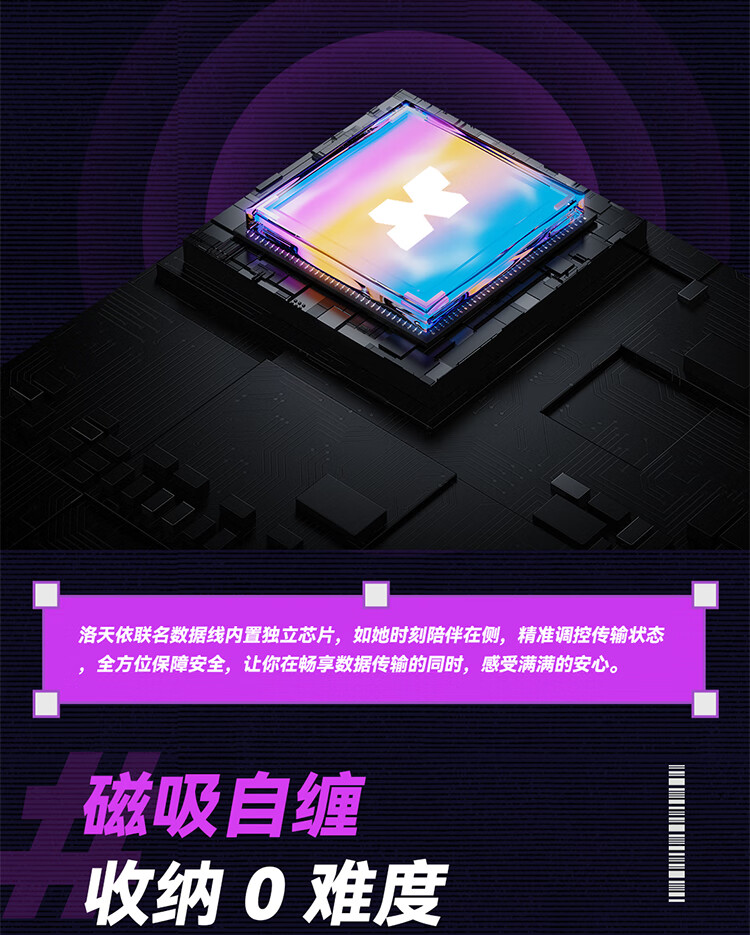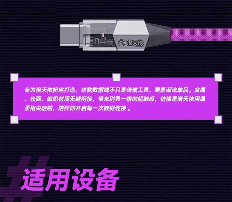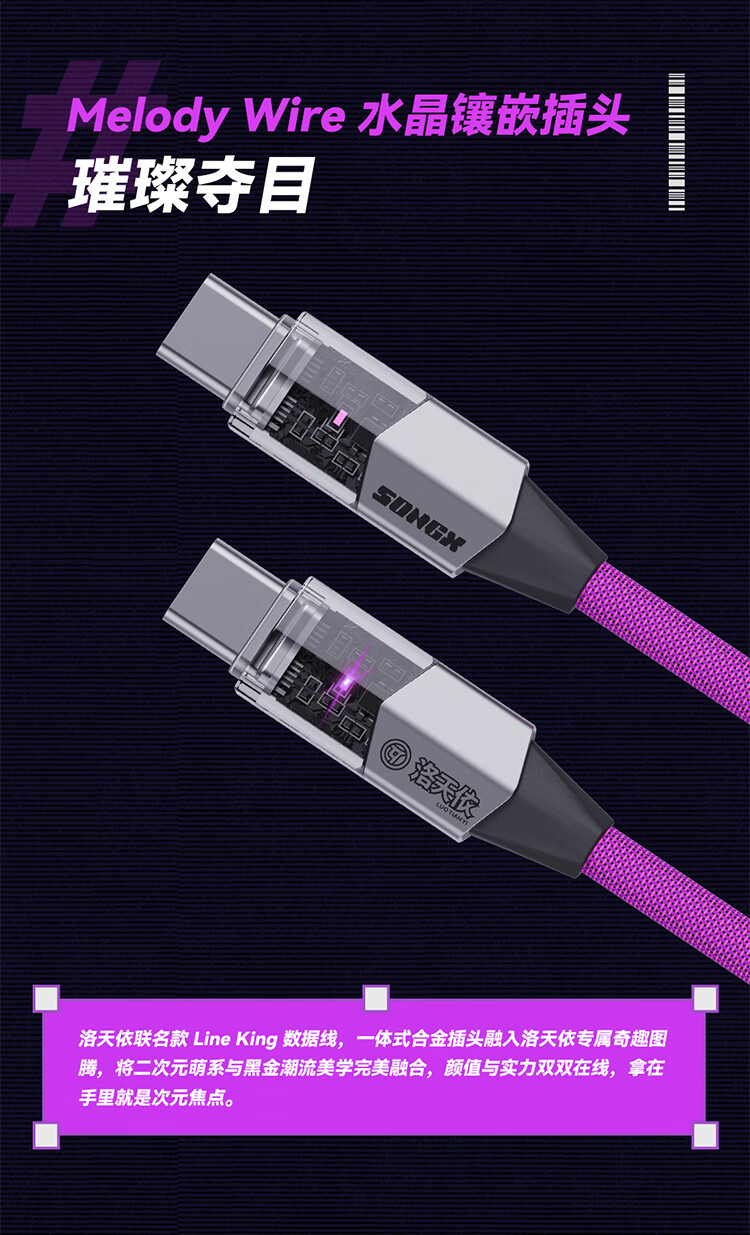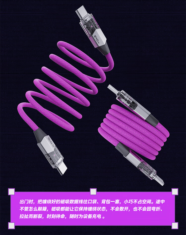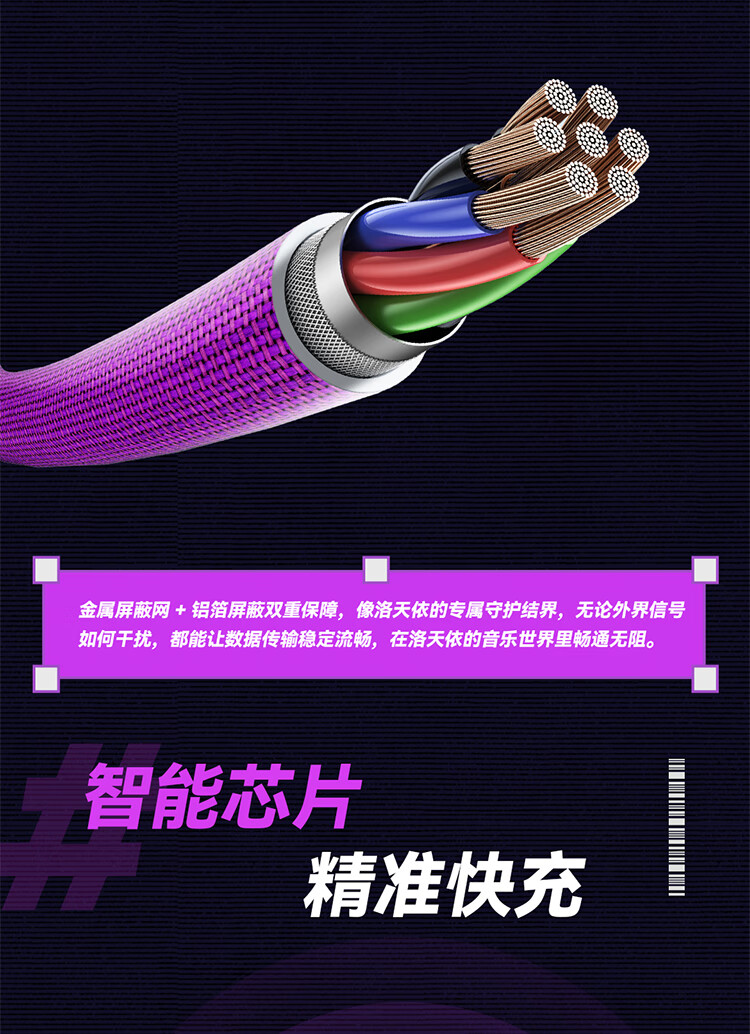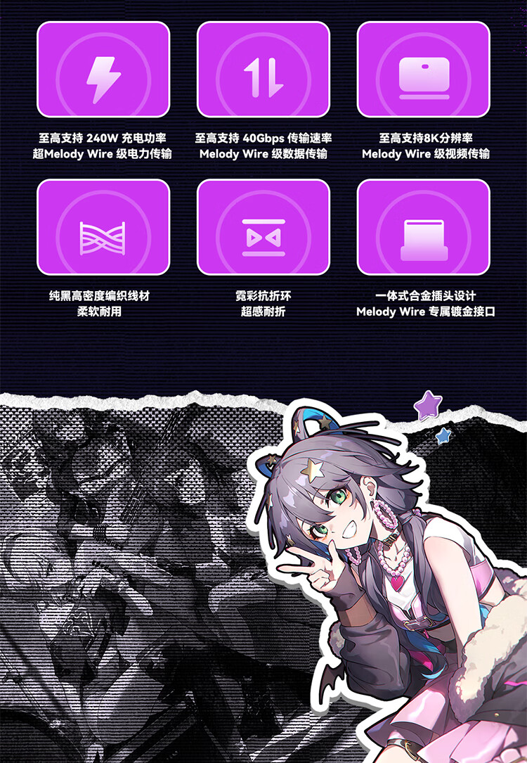 纯黑高密度编织线材 柔软耐用;霓彩抗折环 超感耐折;一体式合金插头设计
