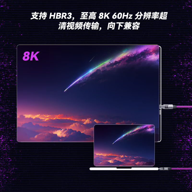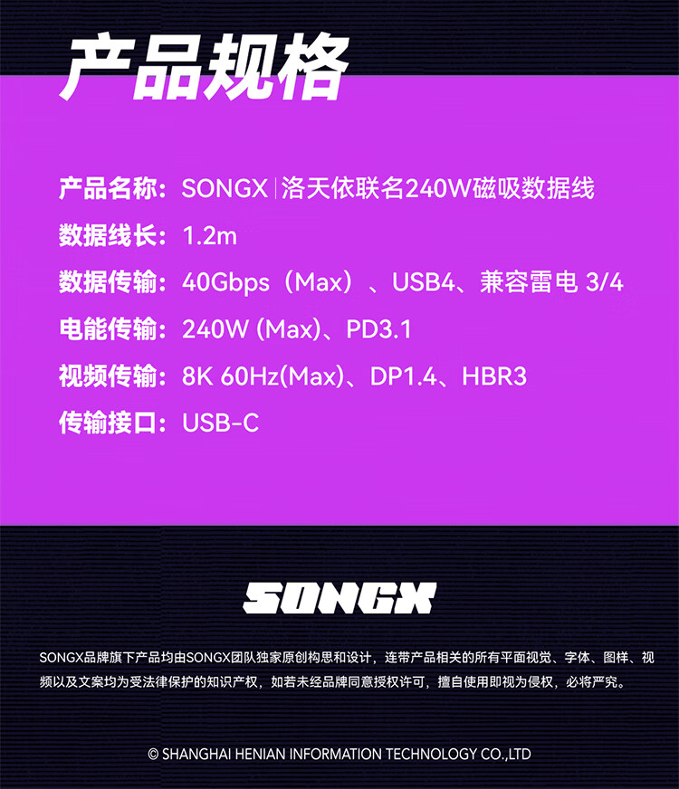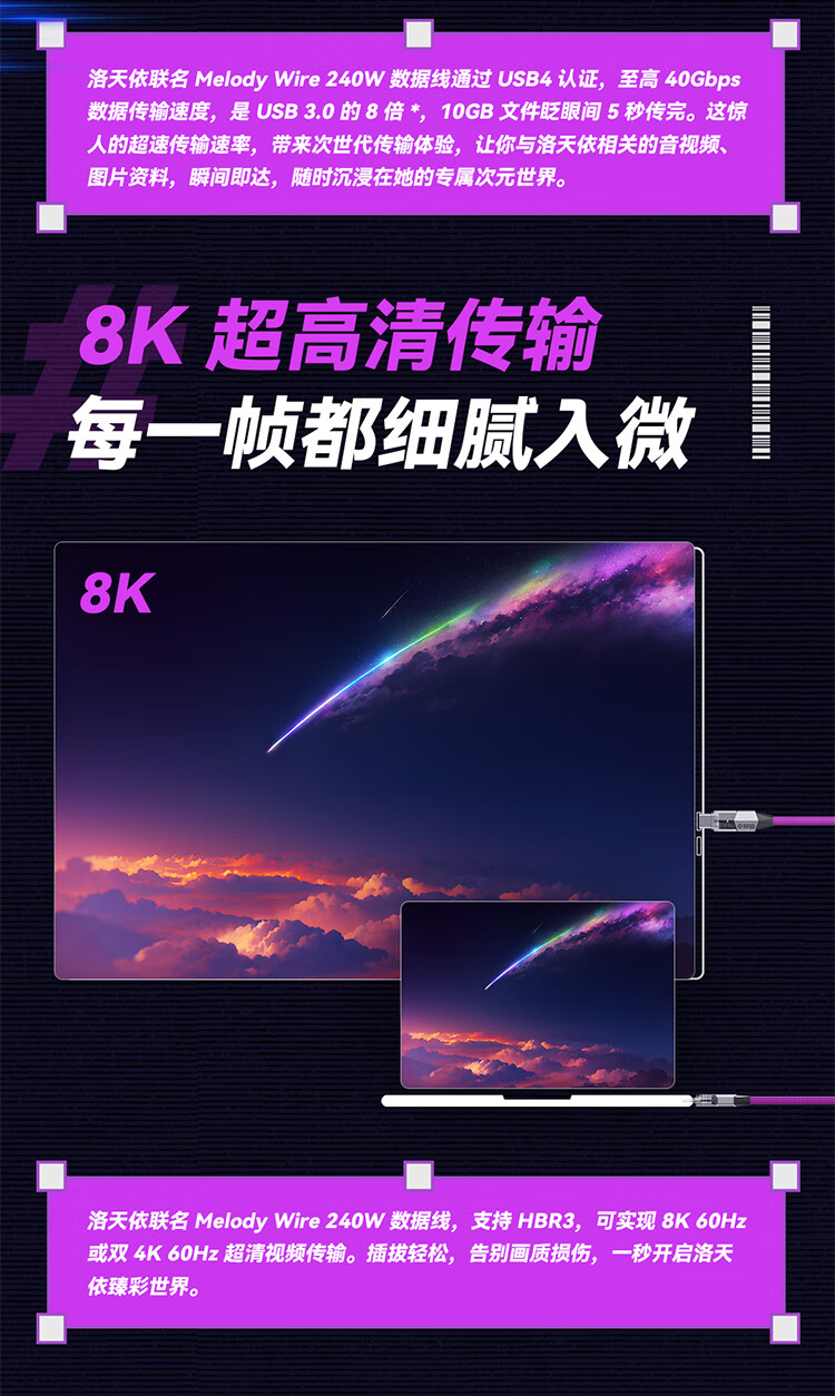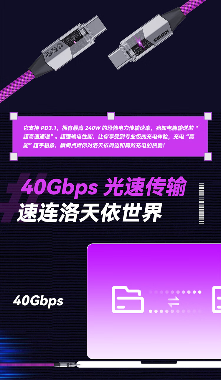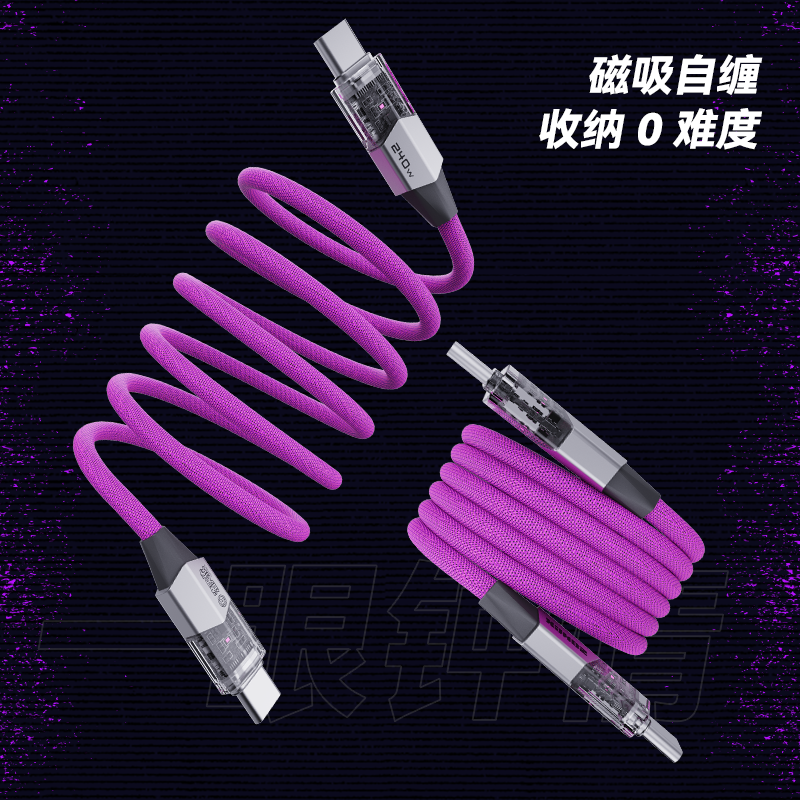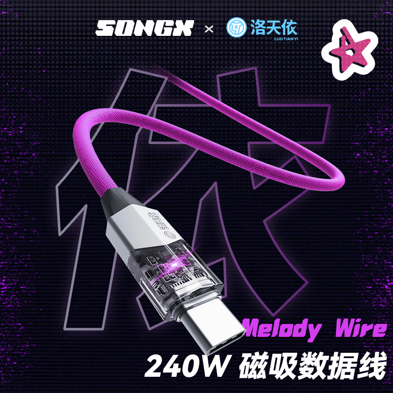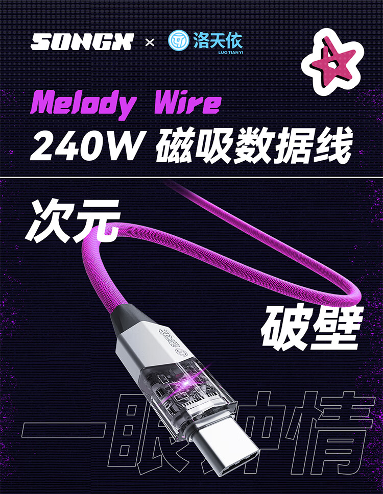 纯黑高密度编织线材 柔软耐用;霓彩抗折环 超感耐折;一体式合金插头设计