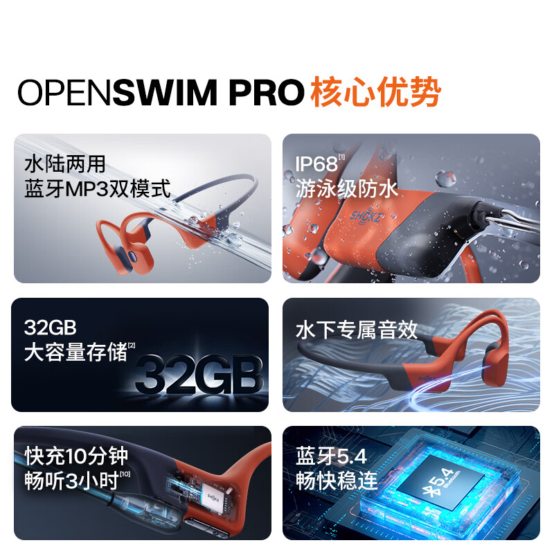 骨传导技术,9小时持久续航;双MIC降噪+多场景AI算法,蓝牙5.4芯片;游泳跑步双模式,10分钟快充,IP68防护等级