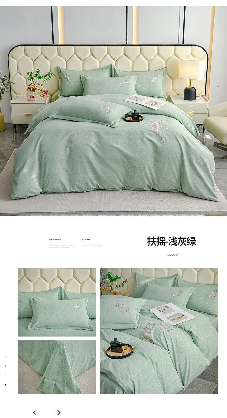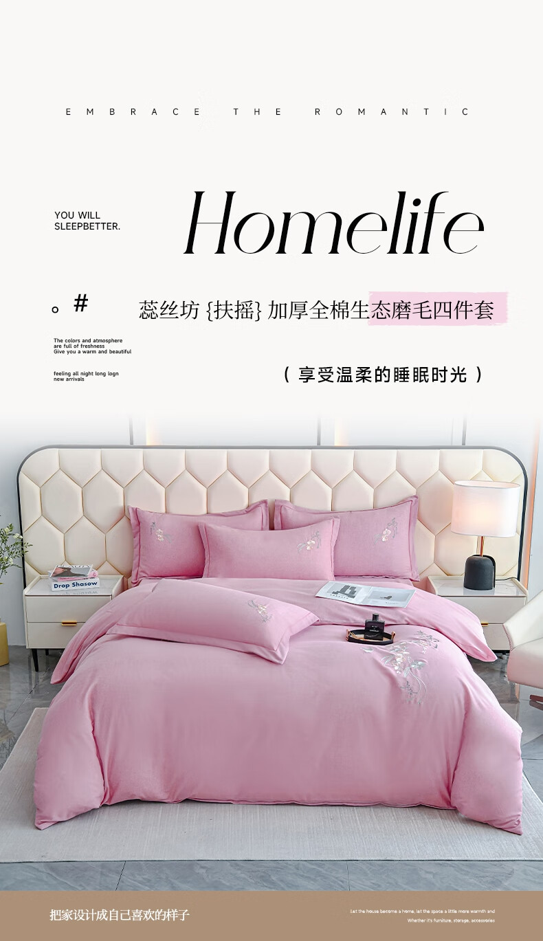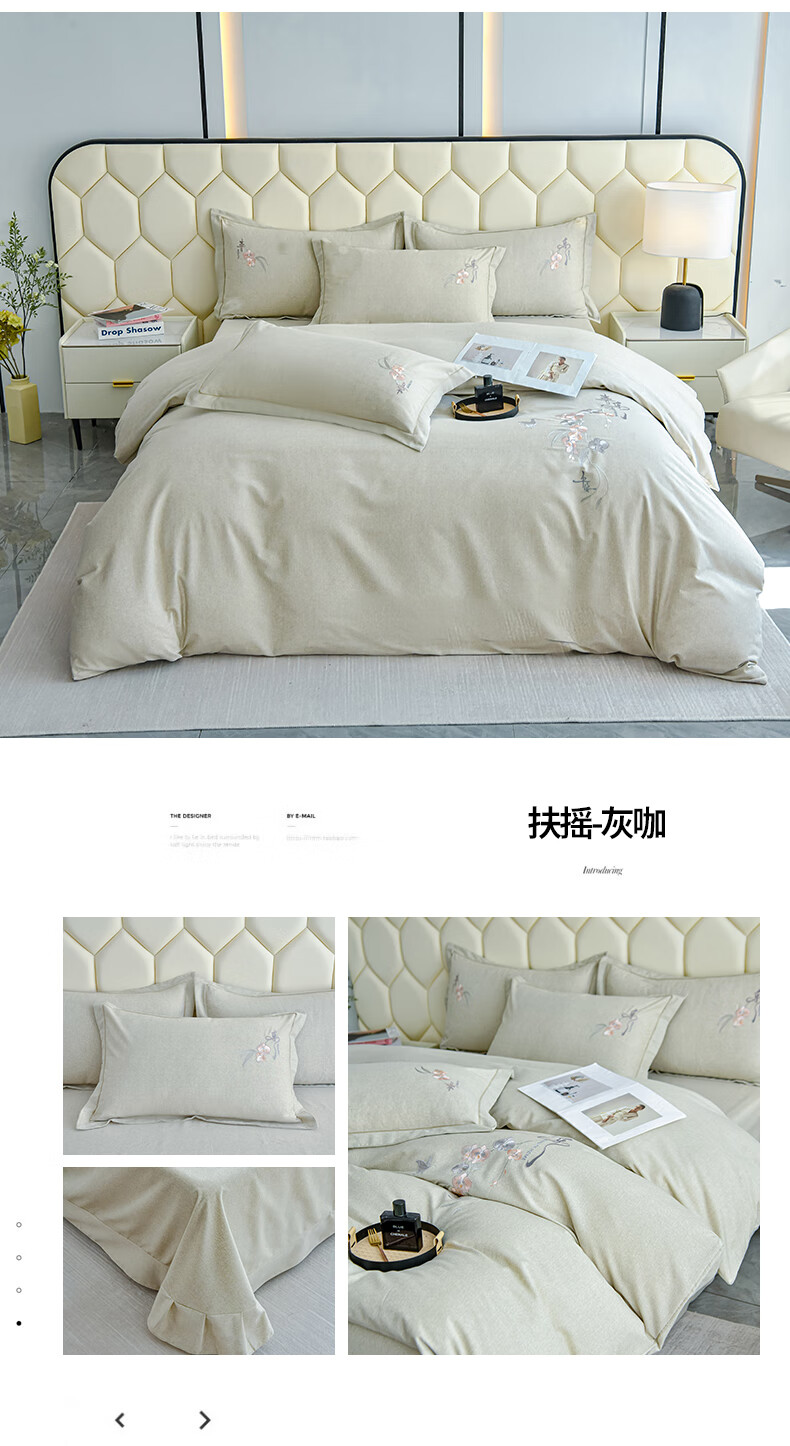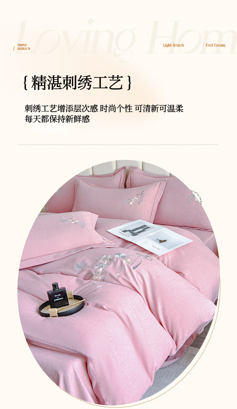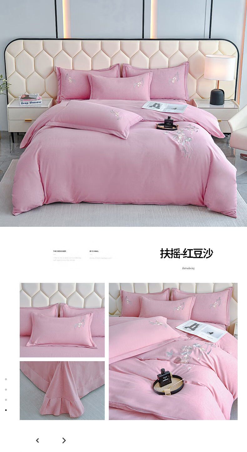 全棉的面料经过磨毛工艺后,在表面形成一层短毛绒;细腻绣花工艺,针脚细腻均匀;精致做工,吊边床单设计 悬垂性好 便于打理