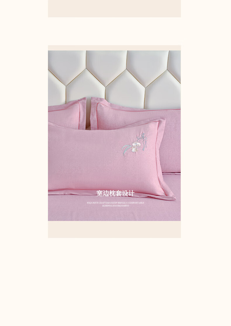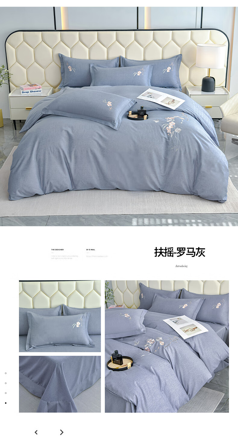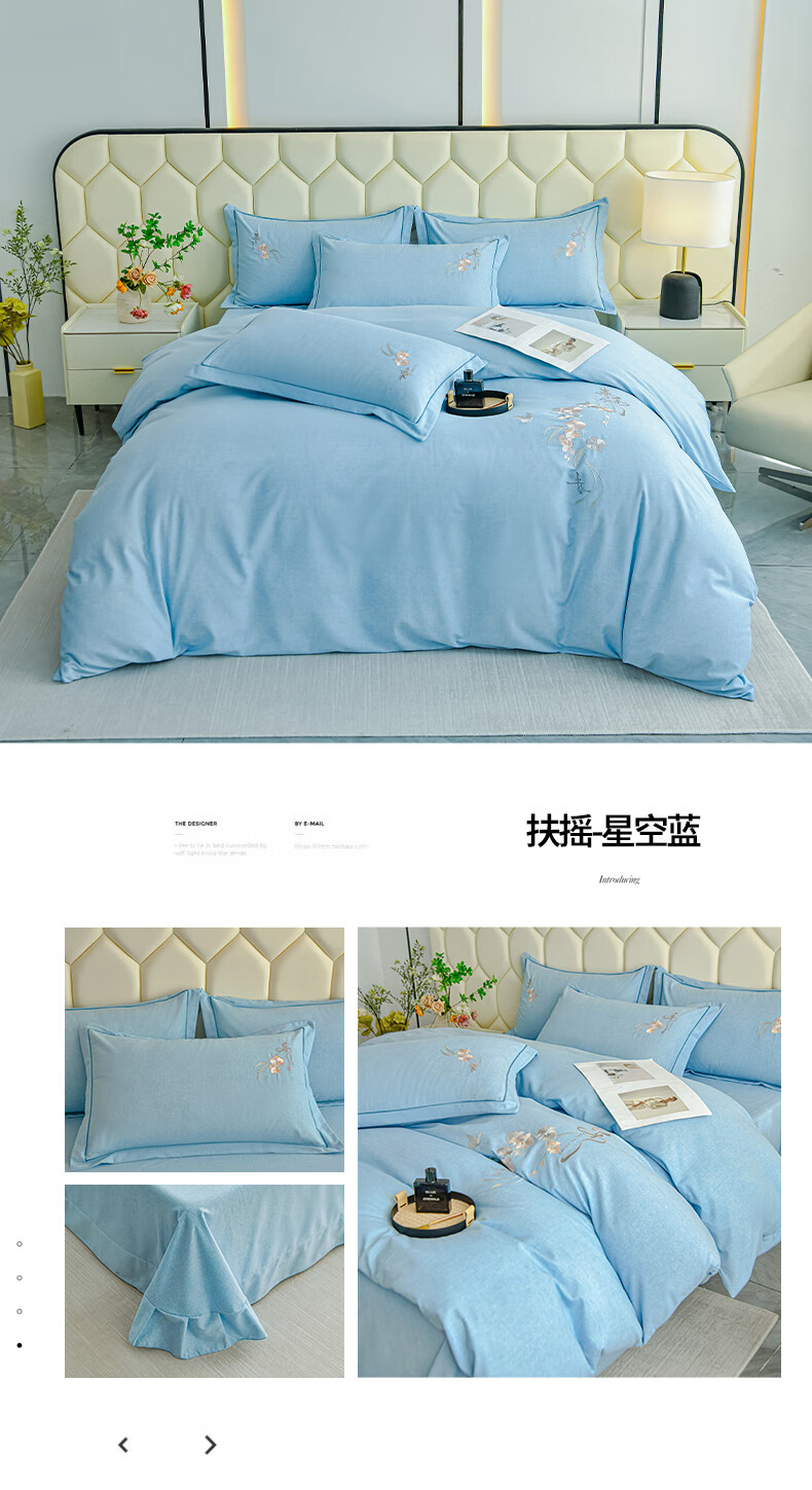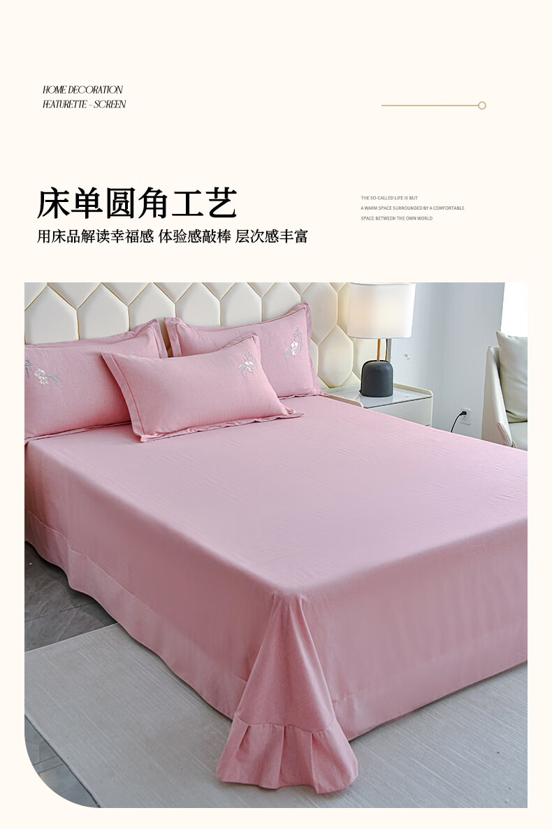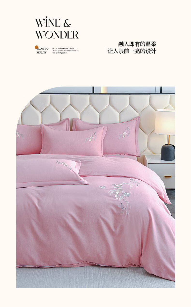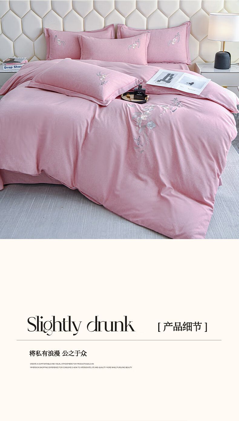 全棉的面料经过磨毛工艺后,在表面形成一层短毛绒;细腻绣花工艺,针脚细腻均匀;精致做工,吊边床单设计 悬垂性好 便于打理
