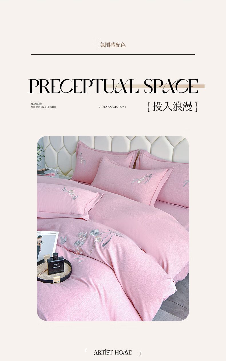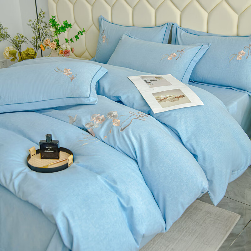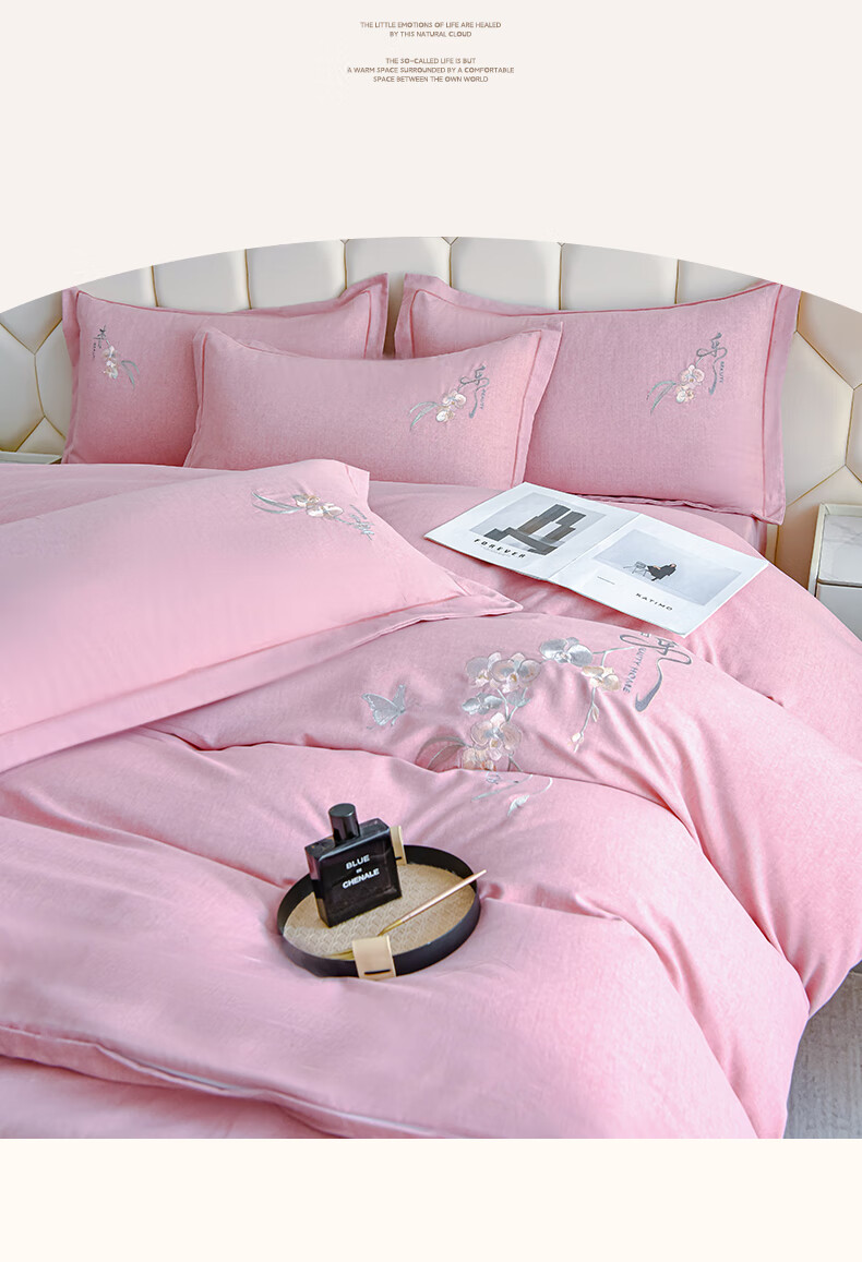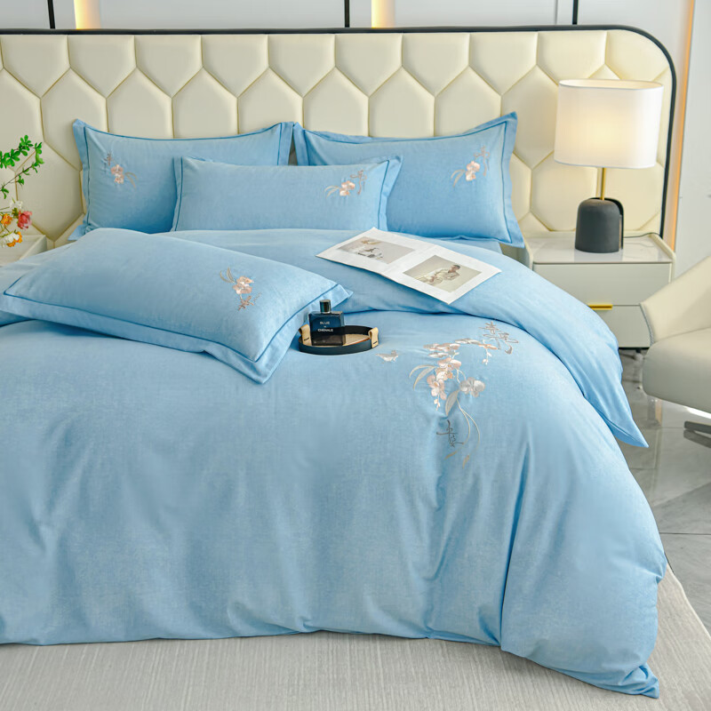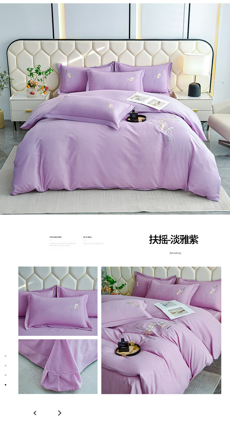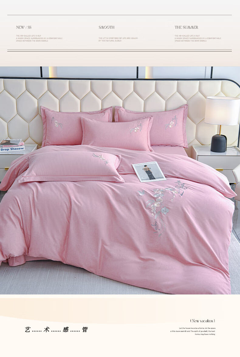 全棉的面料经过磨毛工艺后,在表面形成一层短毛绒;细腻绣花工艺,针脚细腻均匀;精致做工,吊边床单设计 悬垂性好 便于打理