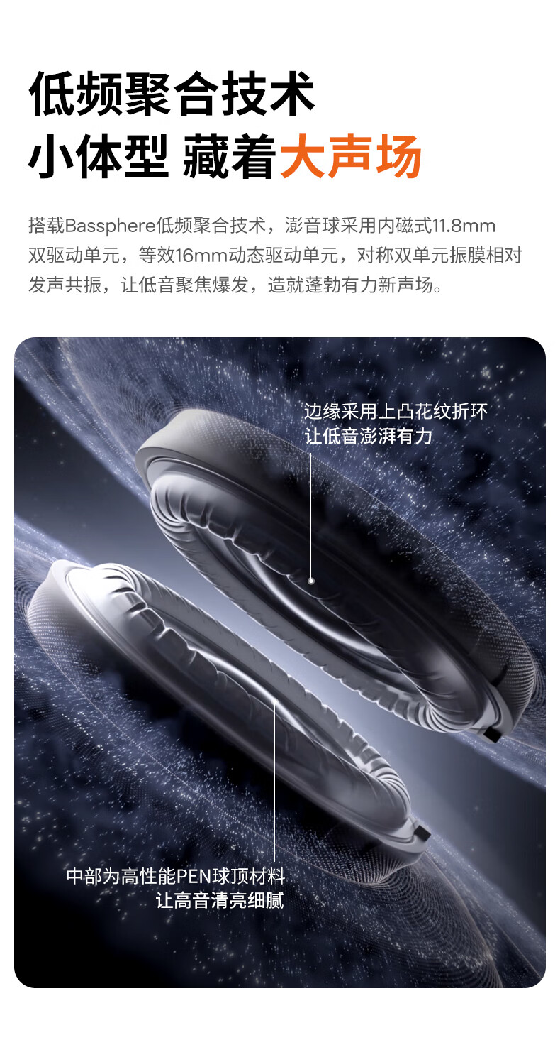 定向声场技术,40小时超长续航;6.5g超轻舒适,支持杜比音效,音质清晰通透;蓝牙 5.4,支持 AI 通话降噪