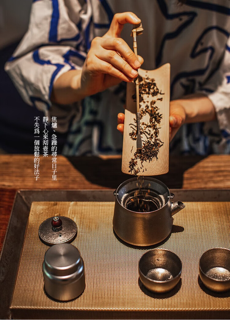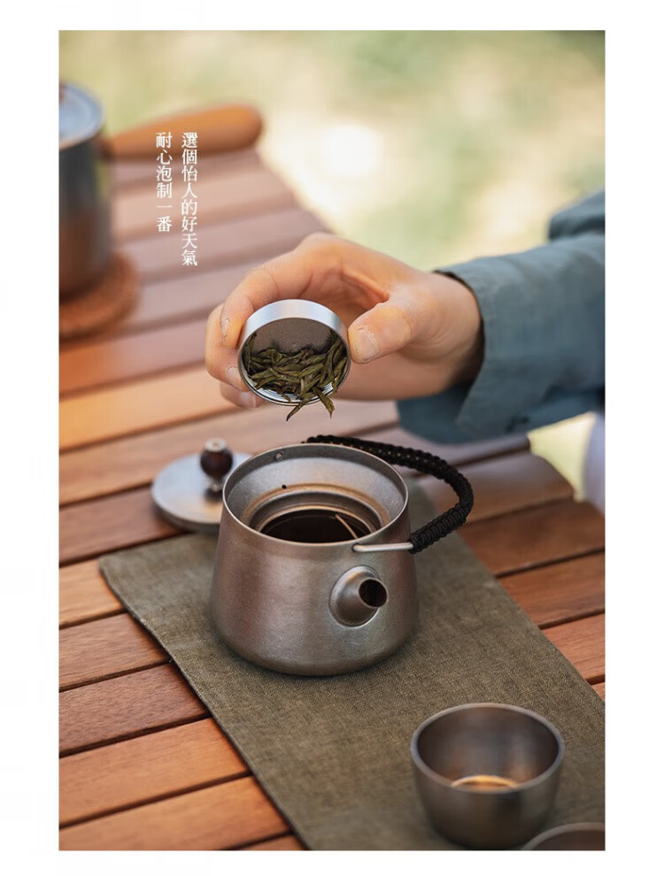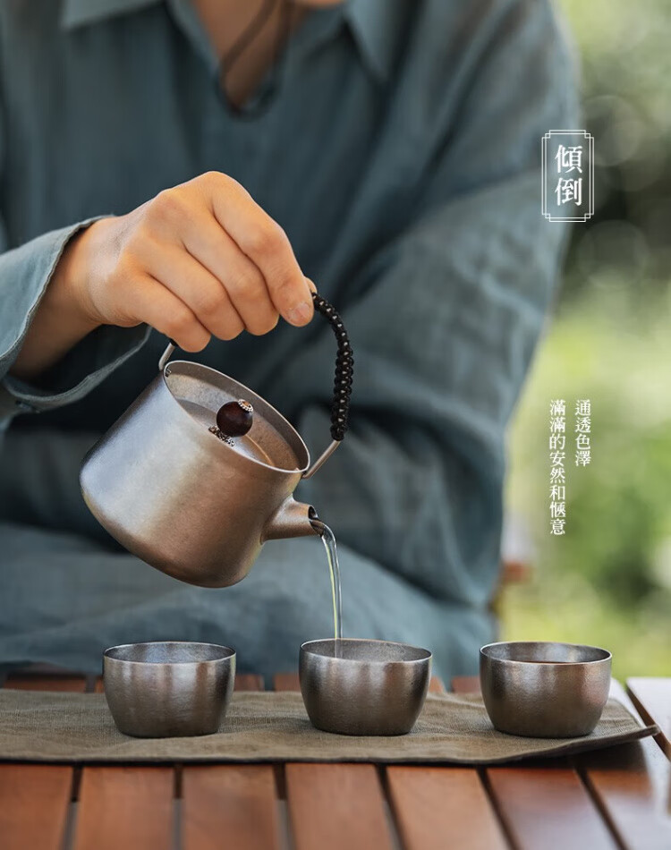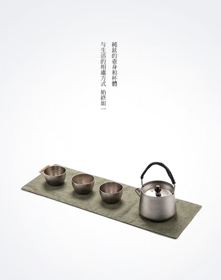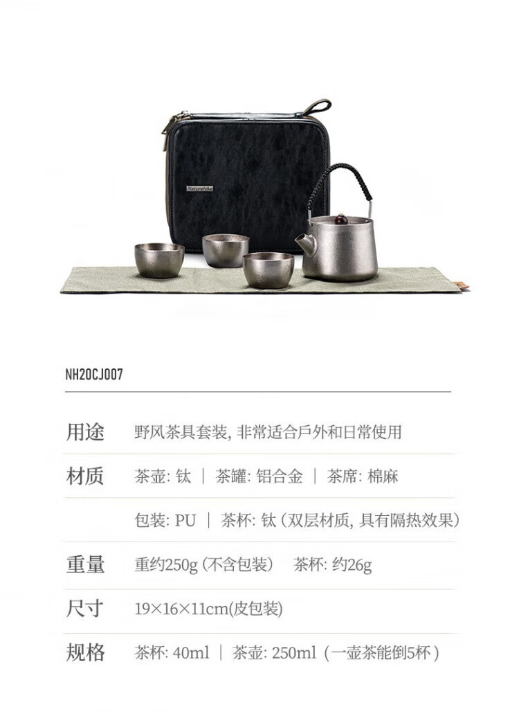 材质:茶壶:钛 茶罐:铝合金,,茶席: 棉麻 容量:茶杯:40ml,茶壶: 250ml(一壶茶能倒5杯)