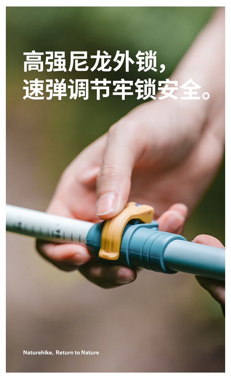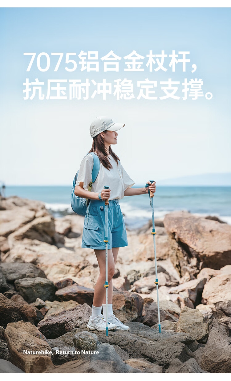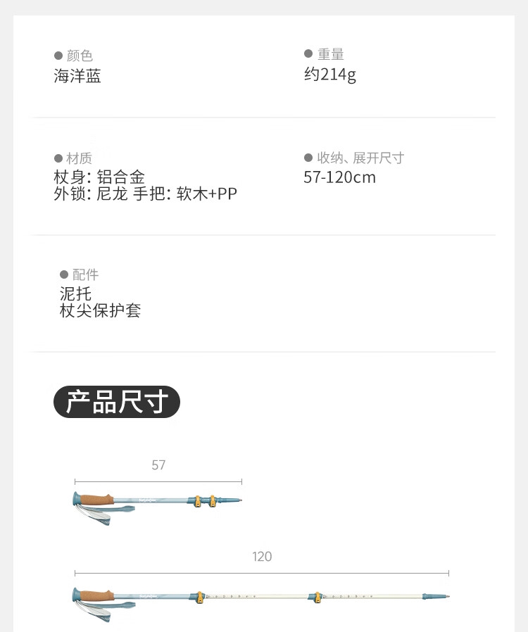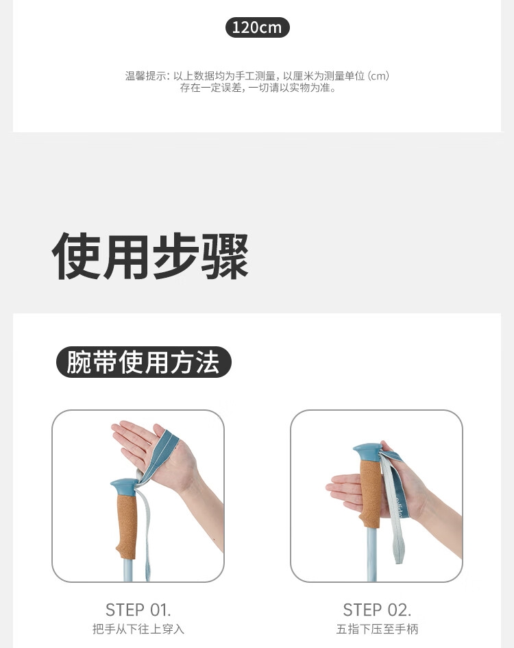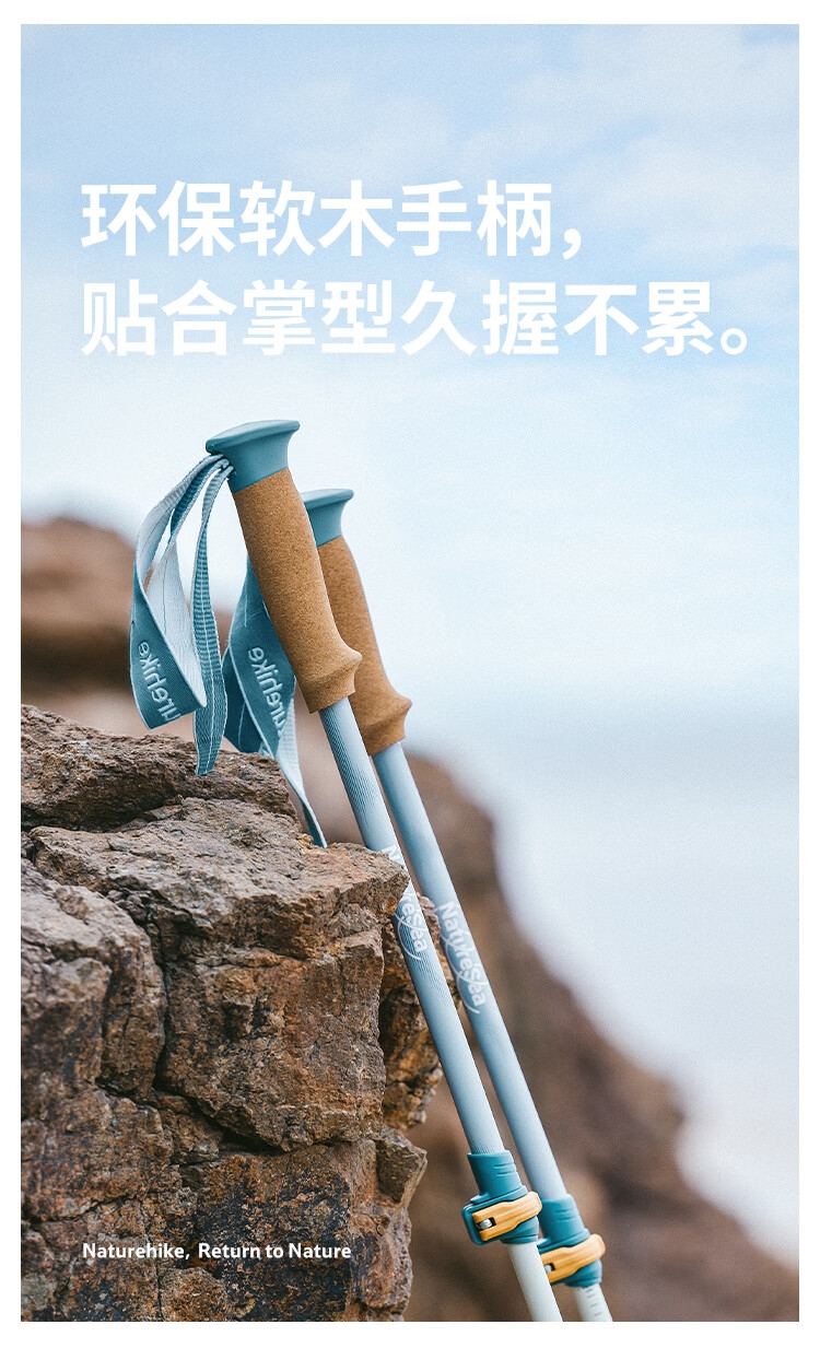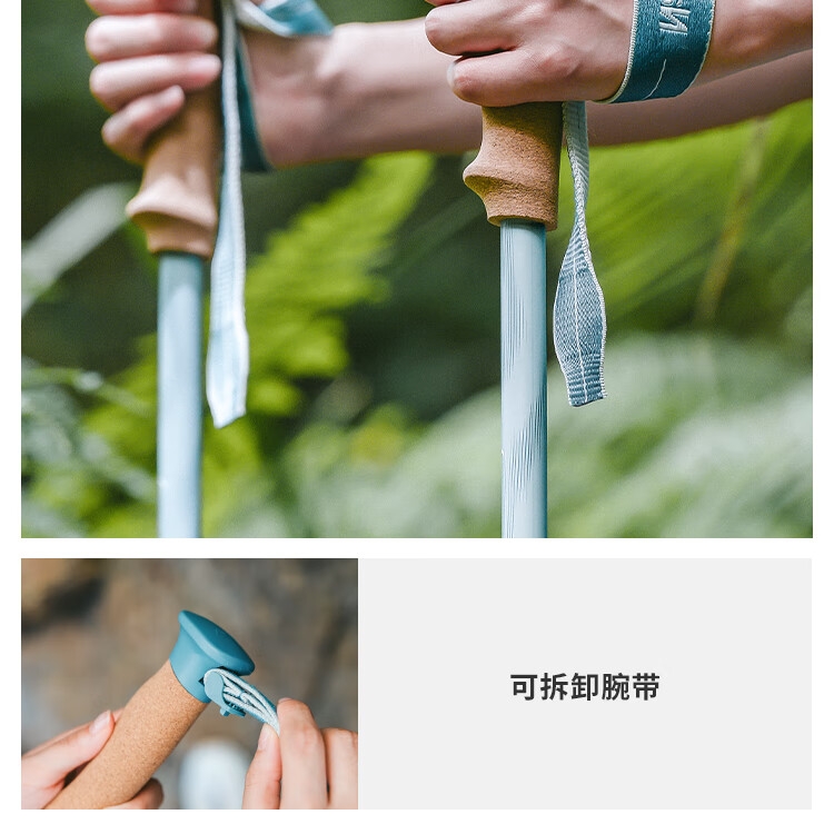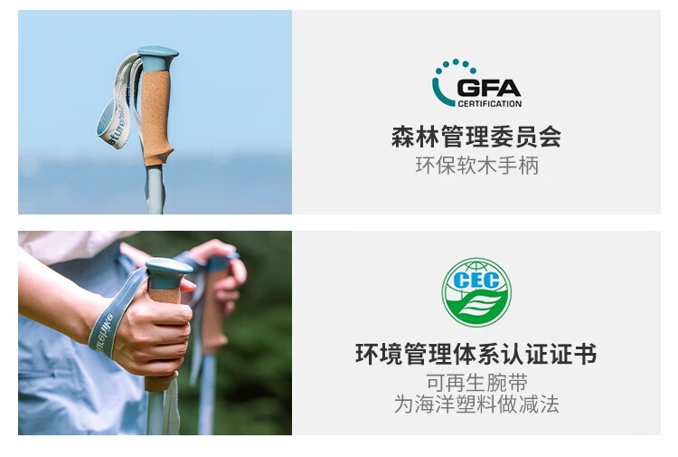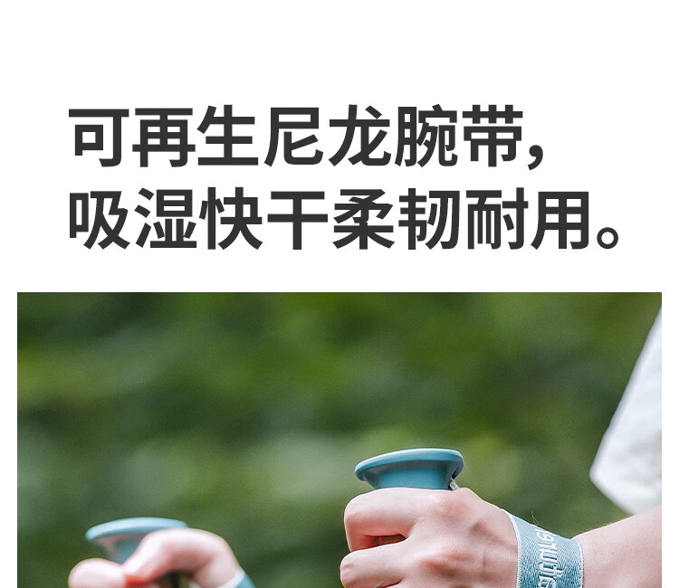 环保软木手柄,贴合掌型久握不累;可再生尼龙腕带吸湿快干柔韧耐用;7075铝合金杖杆抗压耐冲稳定支撑