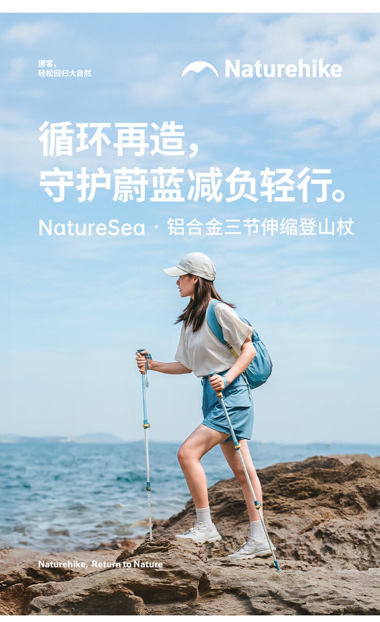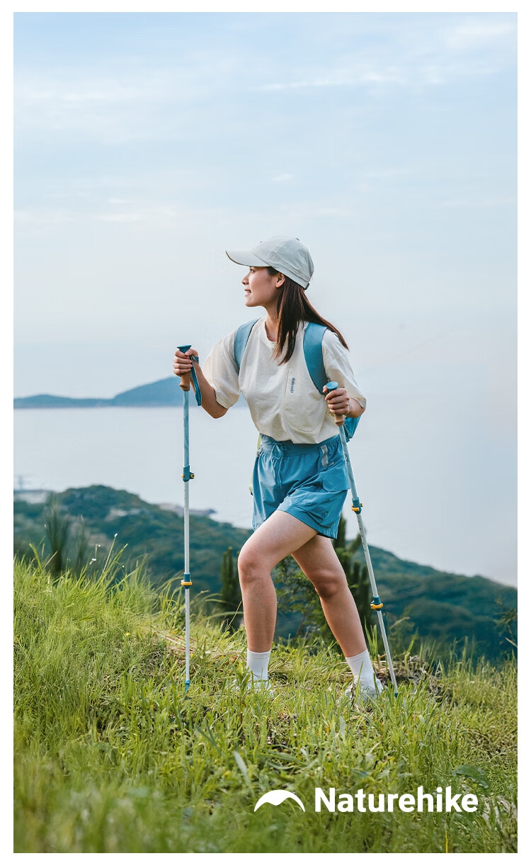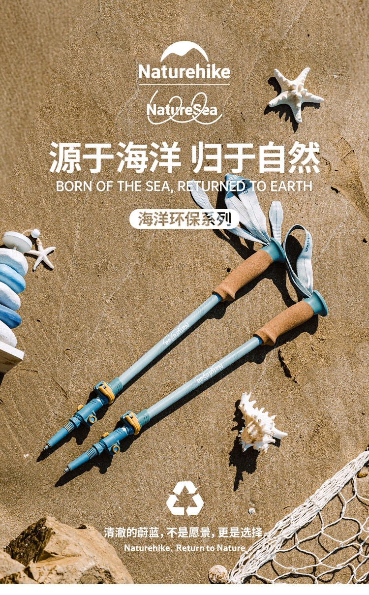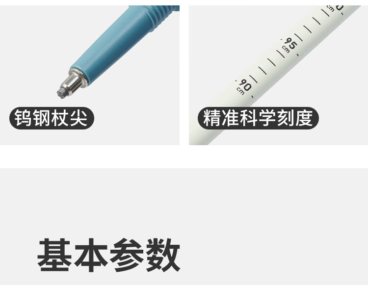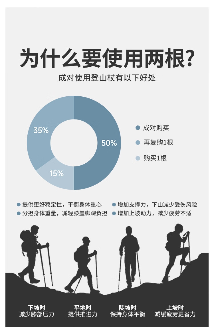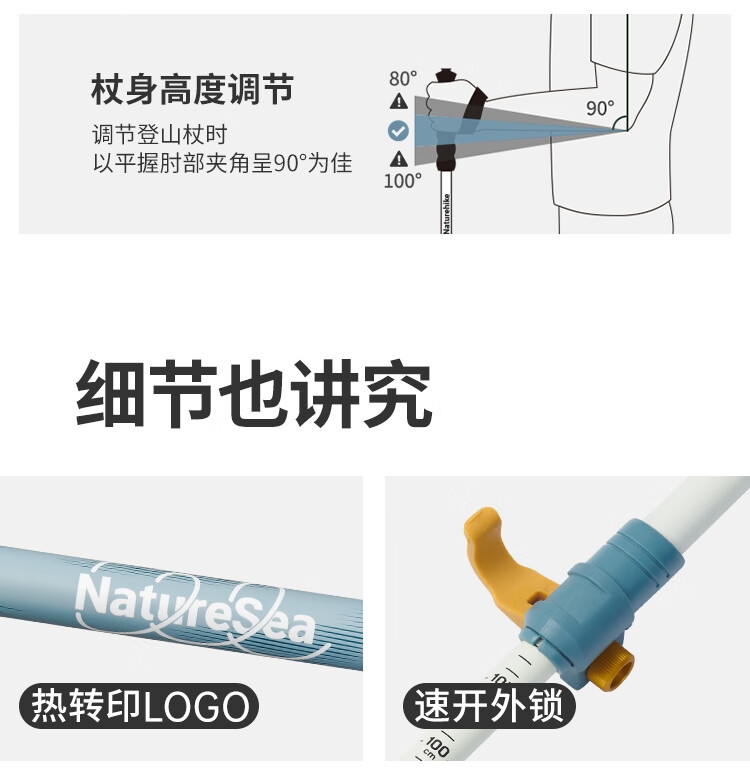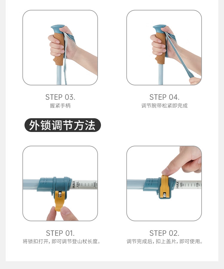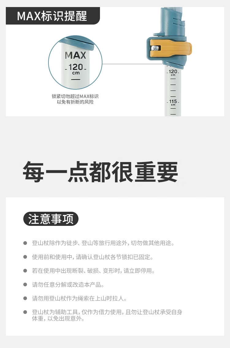 环保软木手柄,贴合掌型久握不累;可再生尼龙腕带吸湿快干柔韧耐用;7075铝合金杖杆抗压耐冲稳定支撑